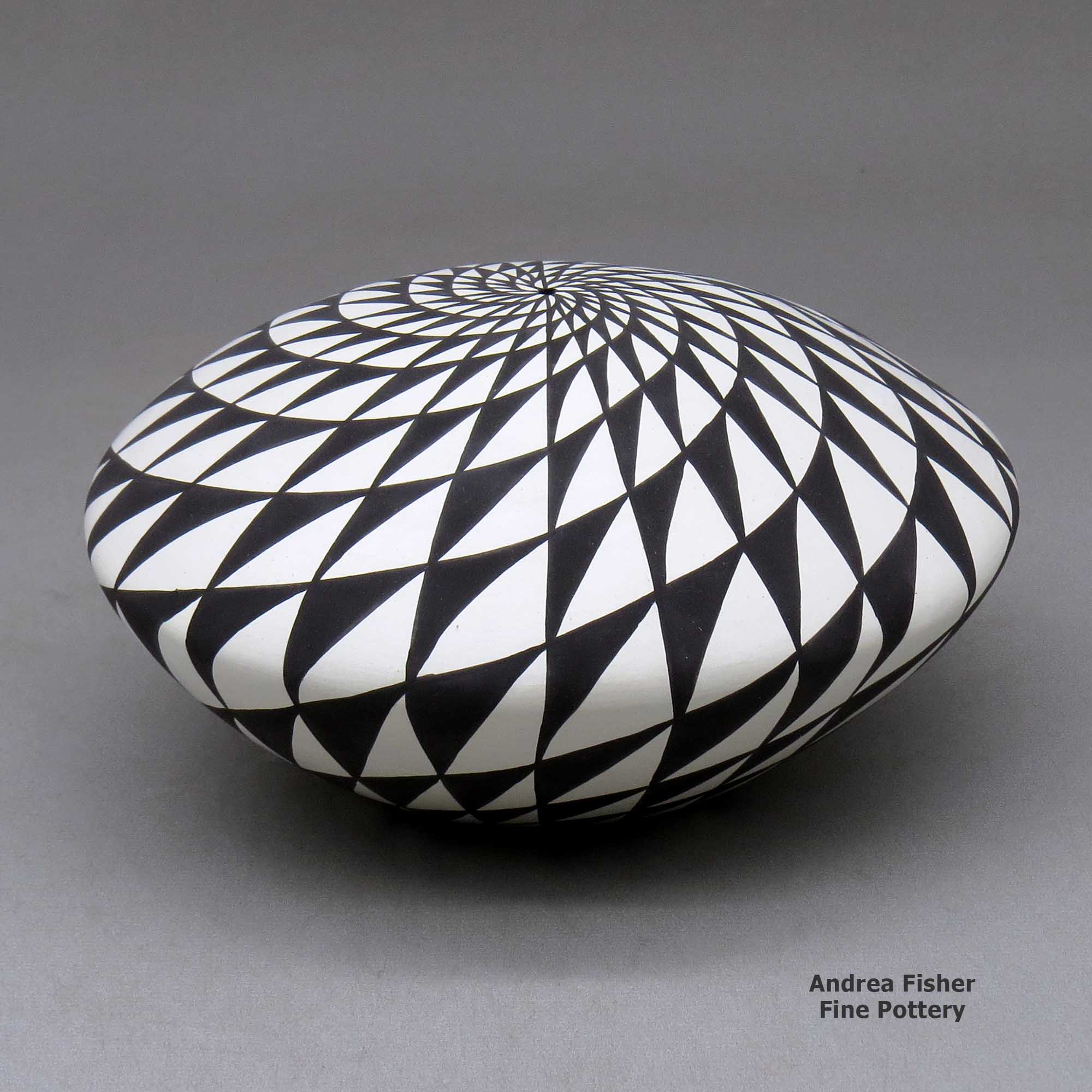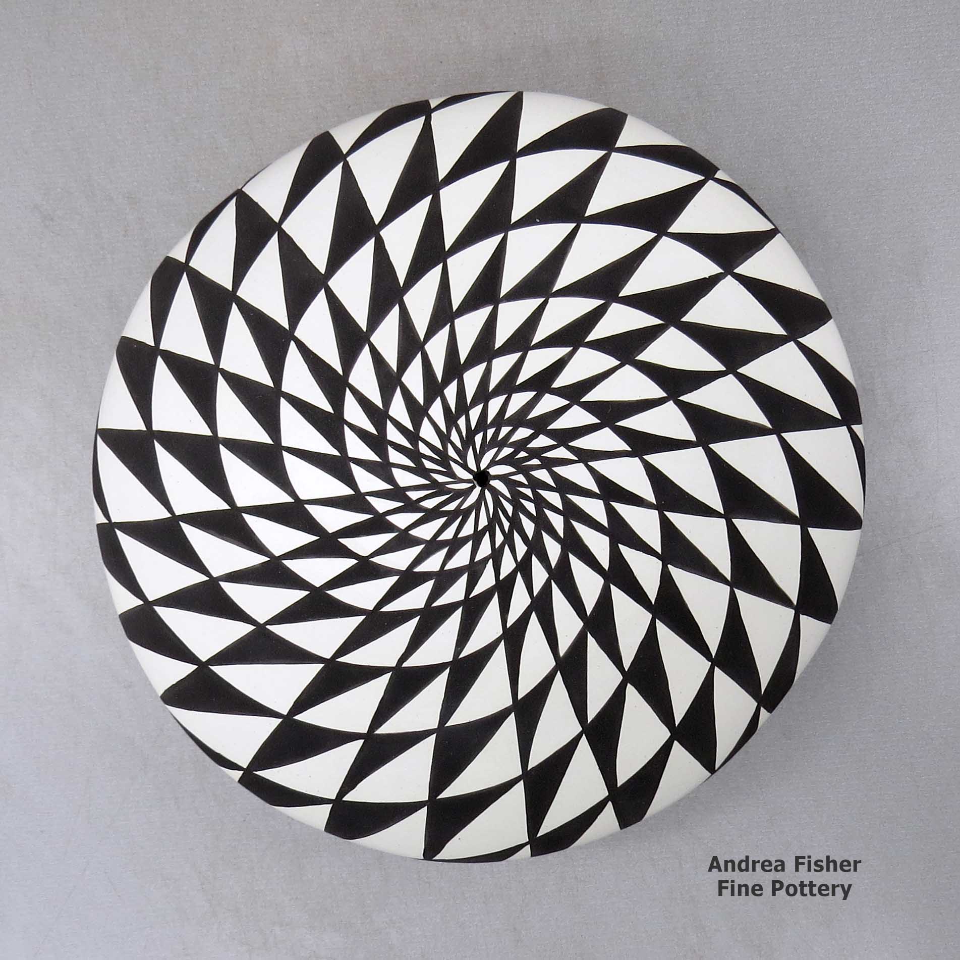 Sandra tells us her favorite shapes to make are seed pots and tall neck seed pot vases. She most loves to paint them with fine line, swirl and checkerboard designs. She says her inspiration rises from deep in her heart and she loves to live surrounded by family, friends and beautiful pots.