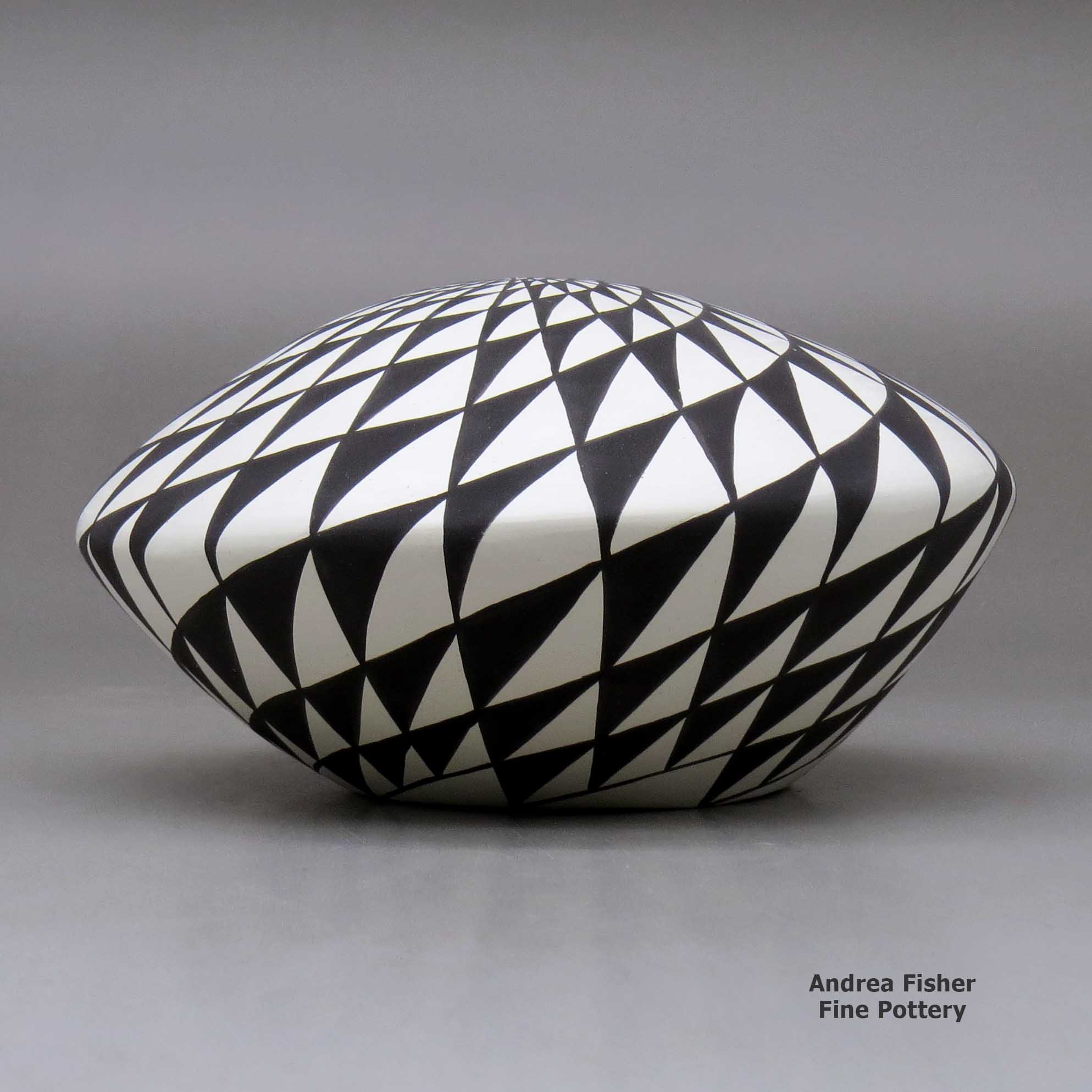A member of the Acorn and Eagle Clans, Sandra Victorino was born to Pearl and David Leno of Acoma Pueblo in February, 1958. She grew up in a family of well-known potters and especially remembers watching her grandmother, Lita Garcia, making pottery. She says it was her aunt, Dorothy Torivio, who put her hands deep in Clay Mother and taught her most of what she knows of the traditional Acoma way to make and decorate pottery. She's been producing pottery for more than 40 years. She's also taught her son Cletus, Jr. to make pottery.