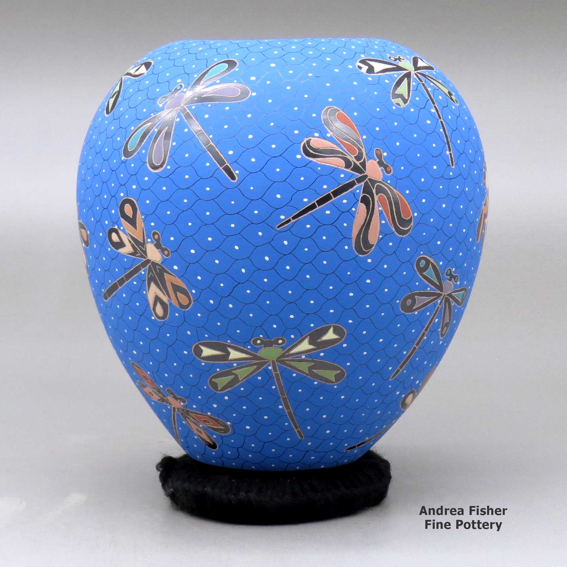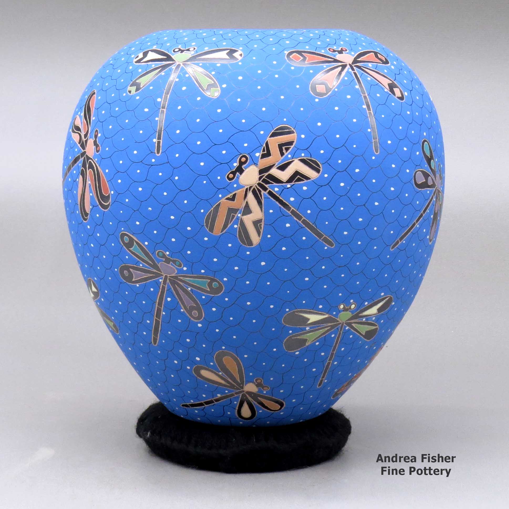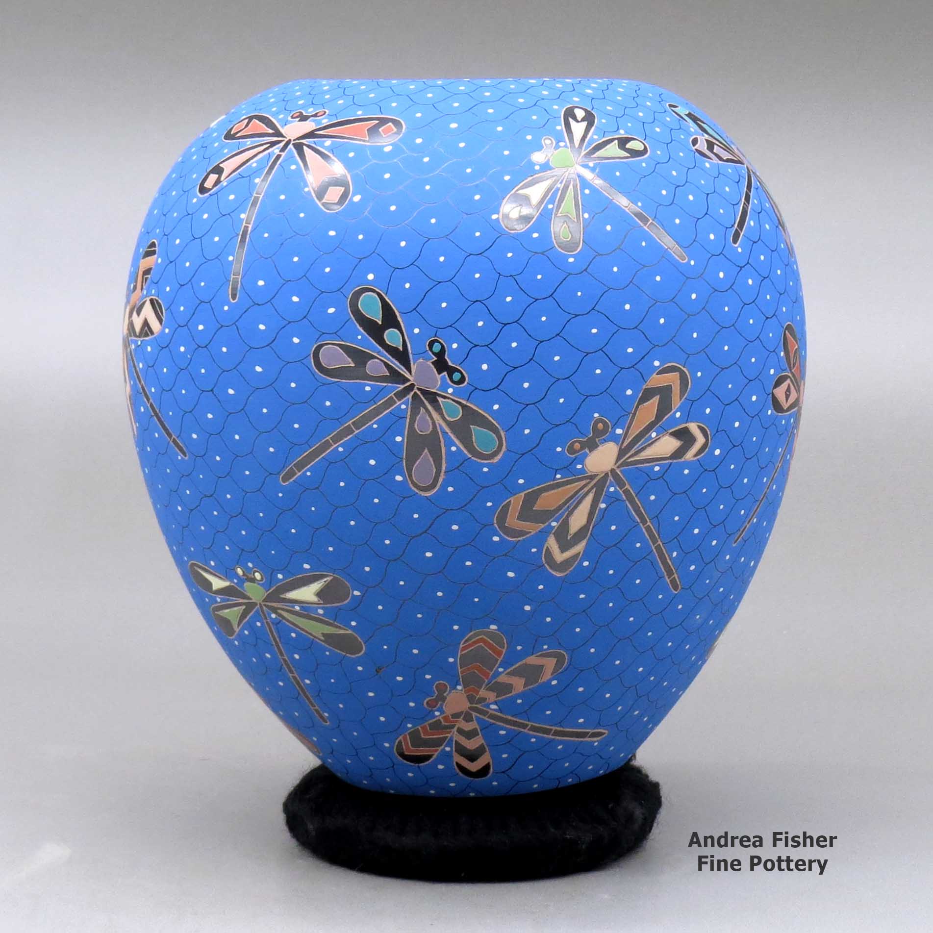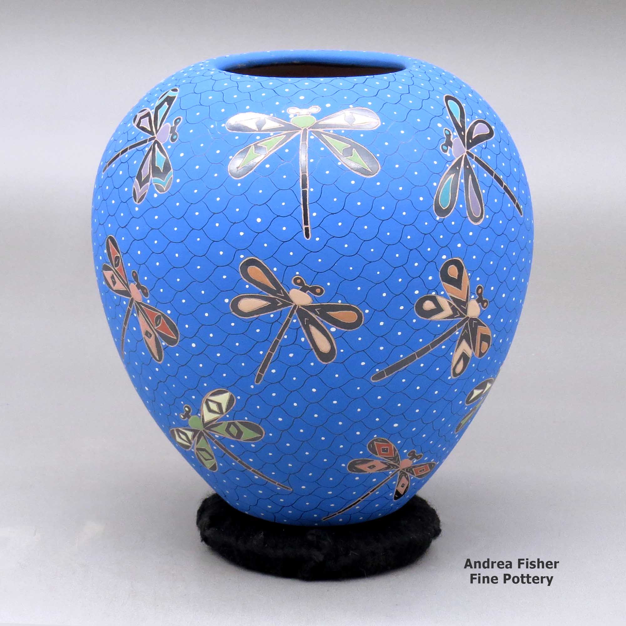 A polychrome jar decorated with a sgraffito and painted dragonfly and geometric mesh design made by Elicena Cota of Mata Ortiz and Casas Grandes