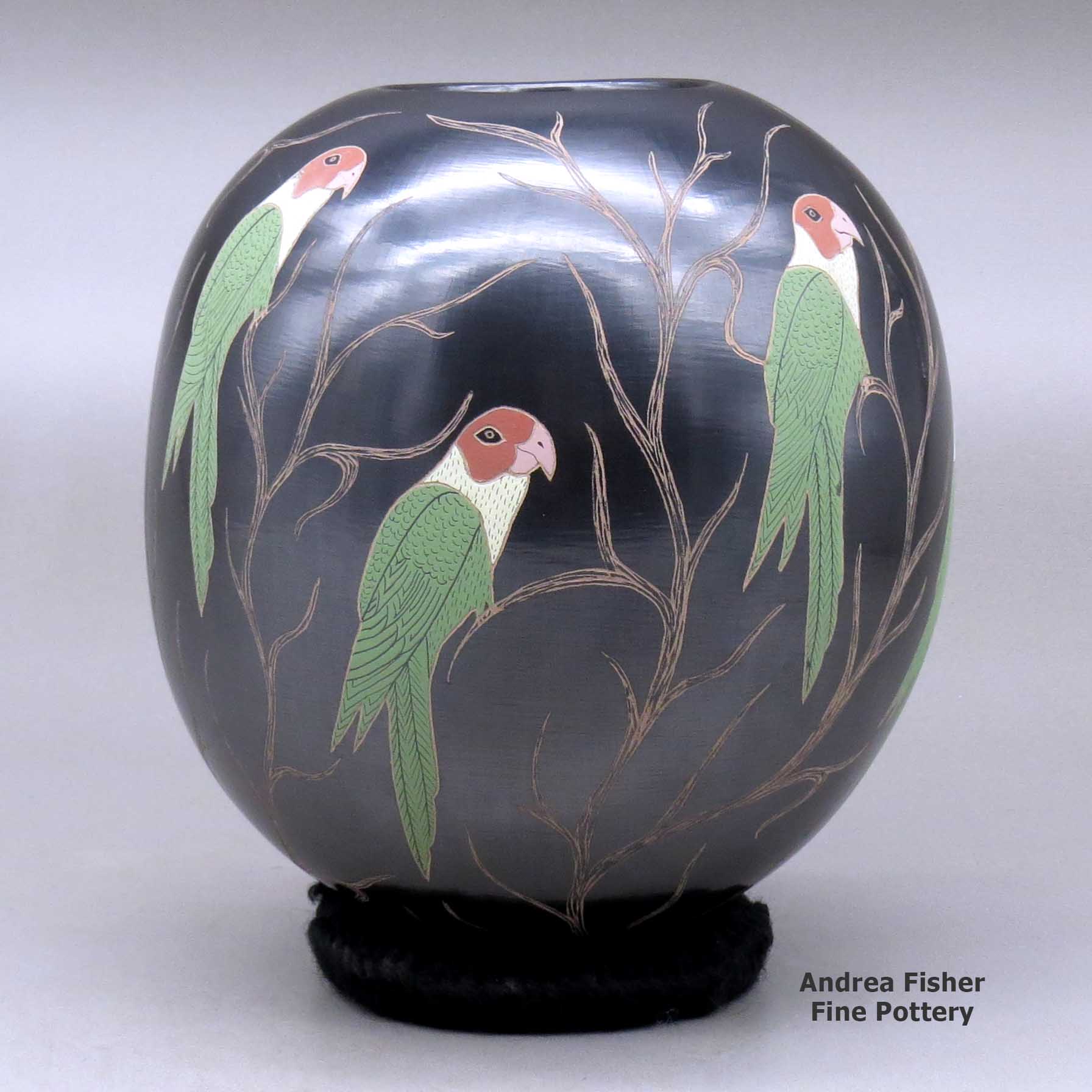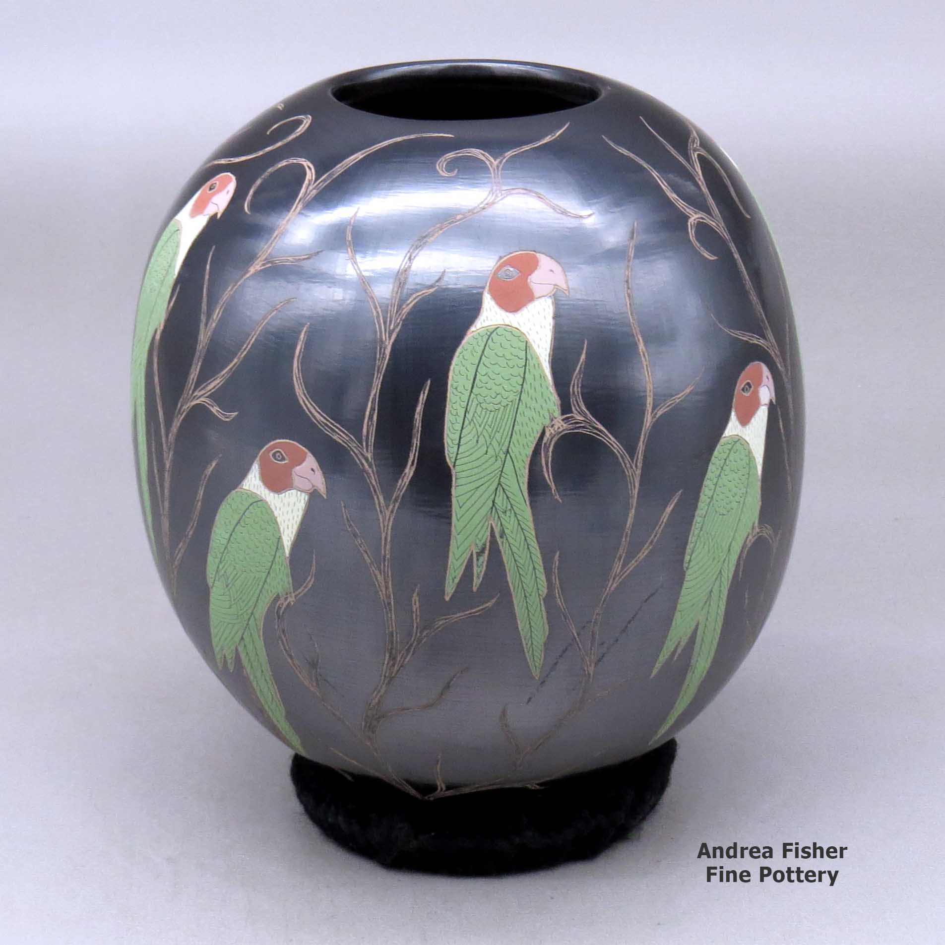 Elicena Cota, Mata Ortiz and Casas Grandes, A polychrome jar decorated with a sgraffito and painted parrot and vine design