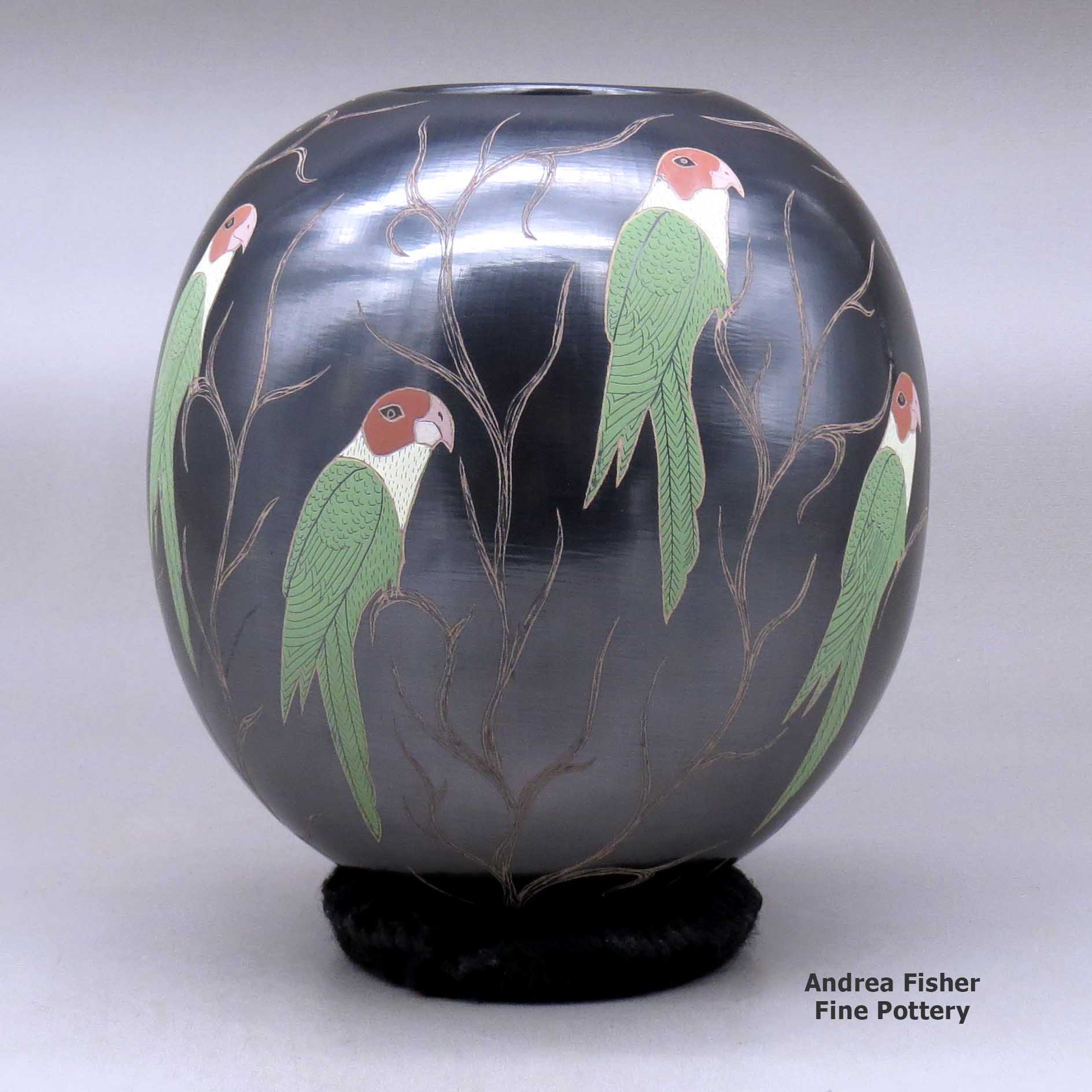 A polychrome jar decorated with a sgraffito and painted parrot and vine design made by Elicena Cota of Mata Ortiz and Casas Grandes