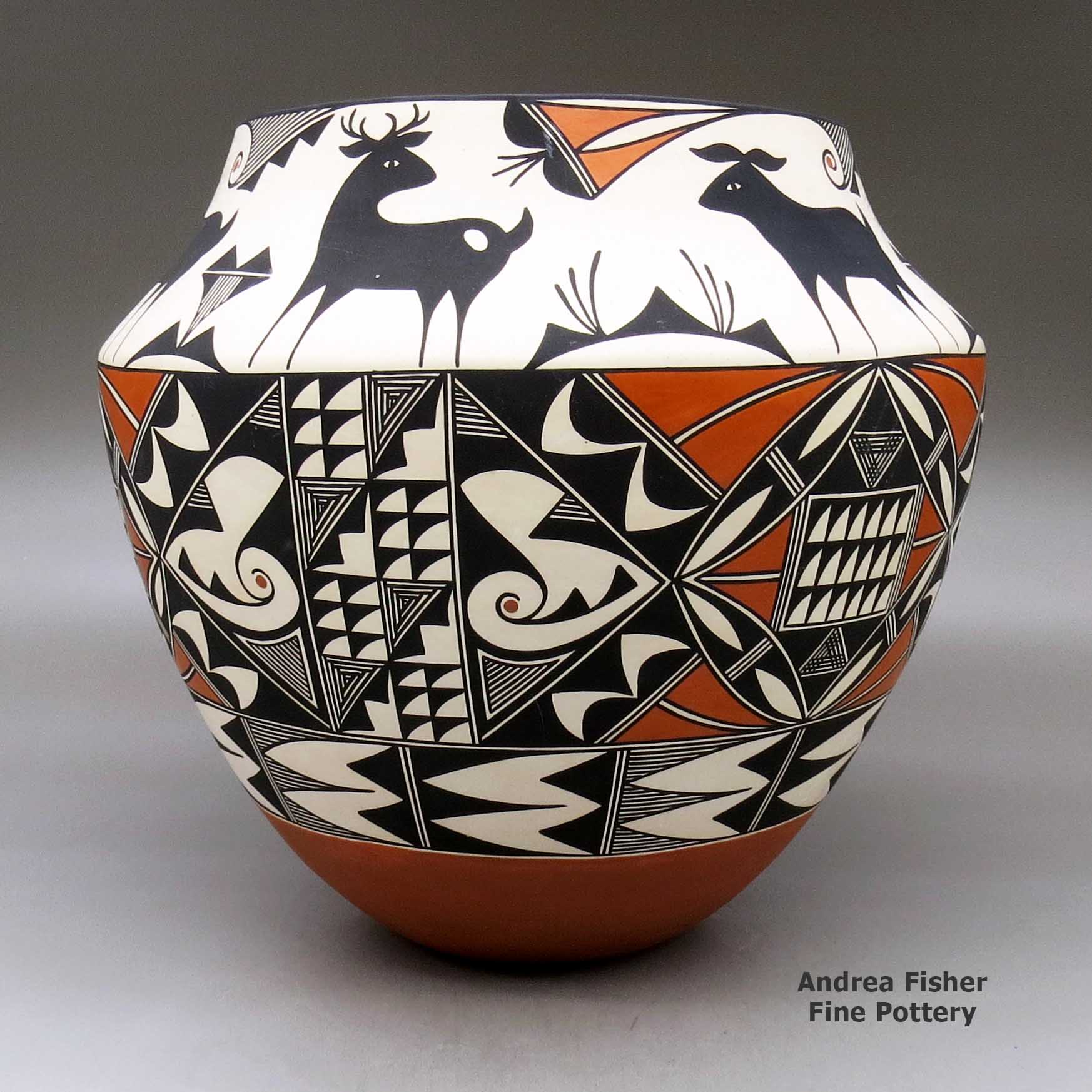 Historically, Acoma was known for large, thin-walled "ollas," jars used for storing food and water. With the arrival of the railroad and tourists in the 1880s, Acoma potters adapted the size, shapes and styles of their pots in order to appeal to the new buyers.