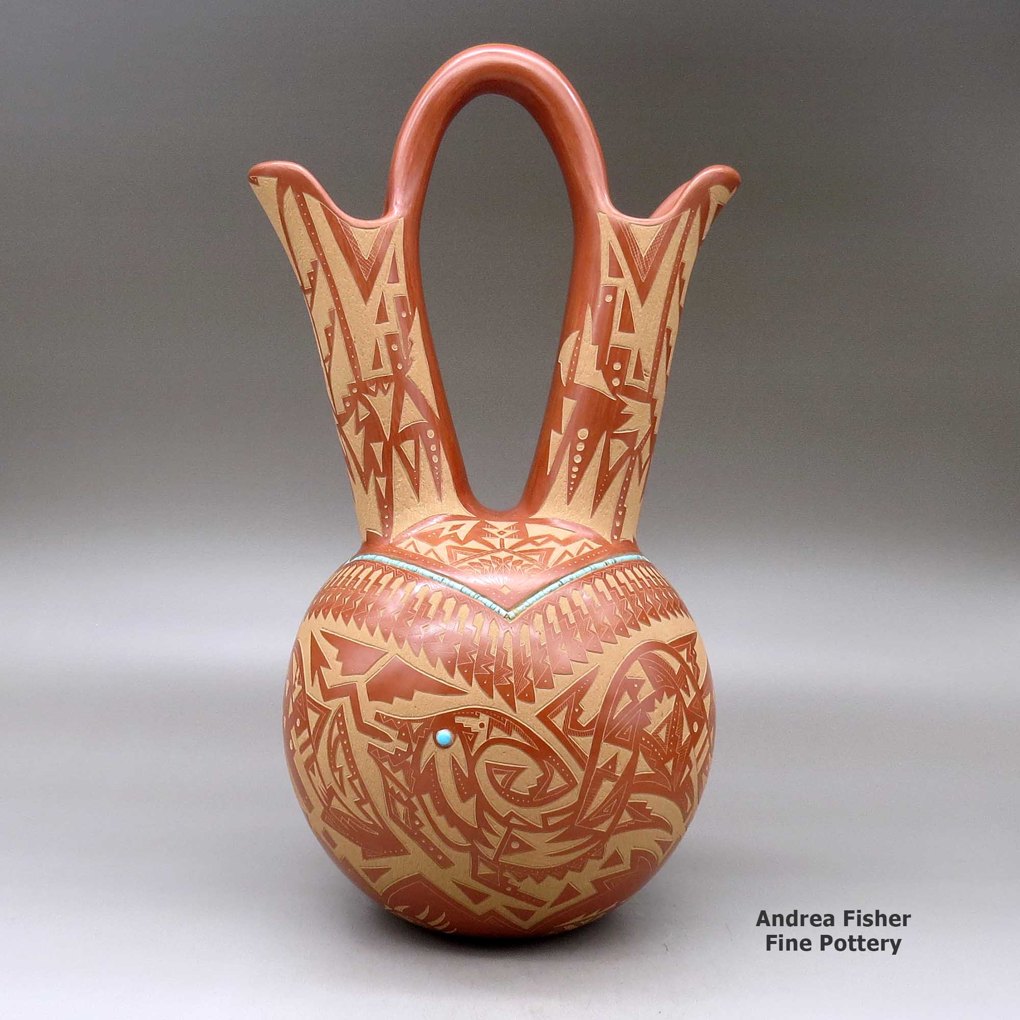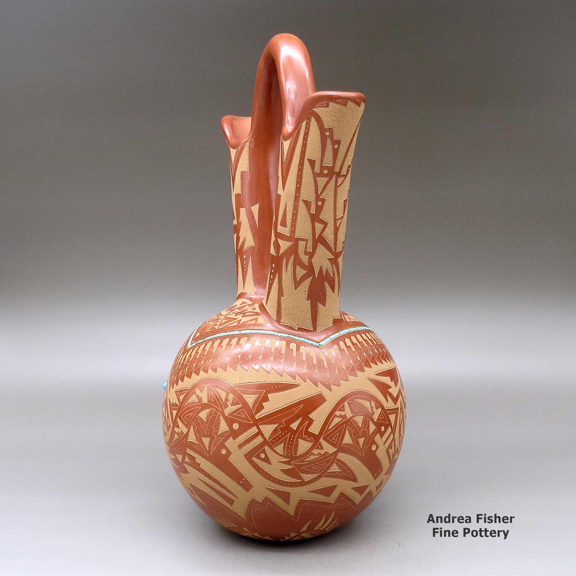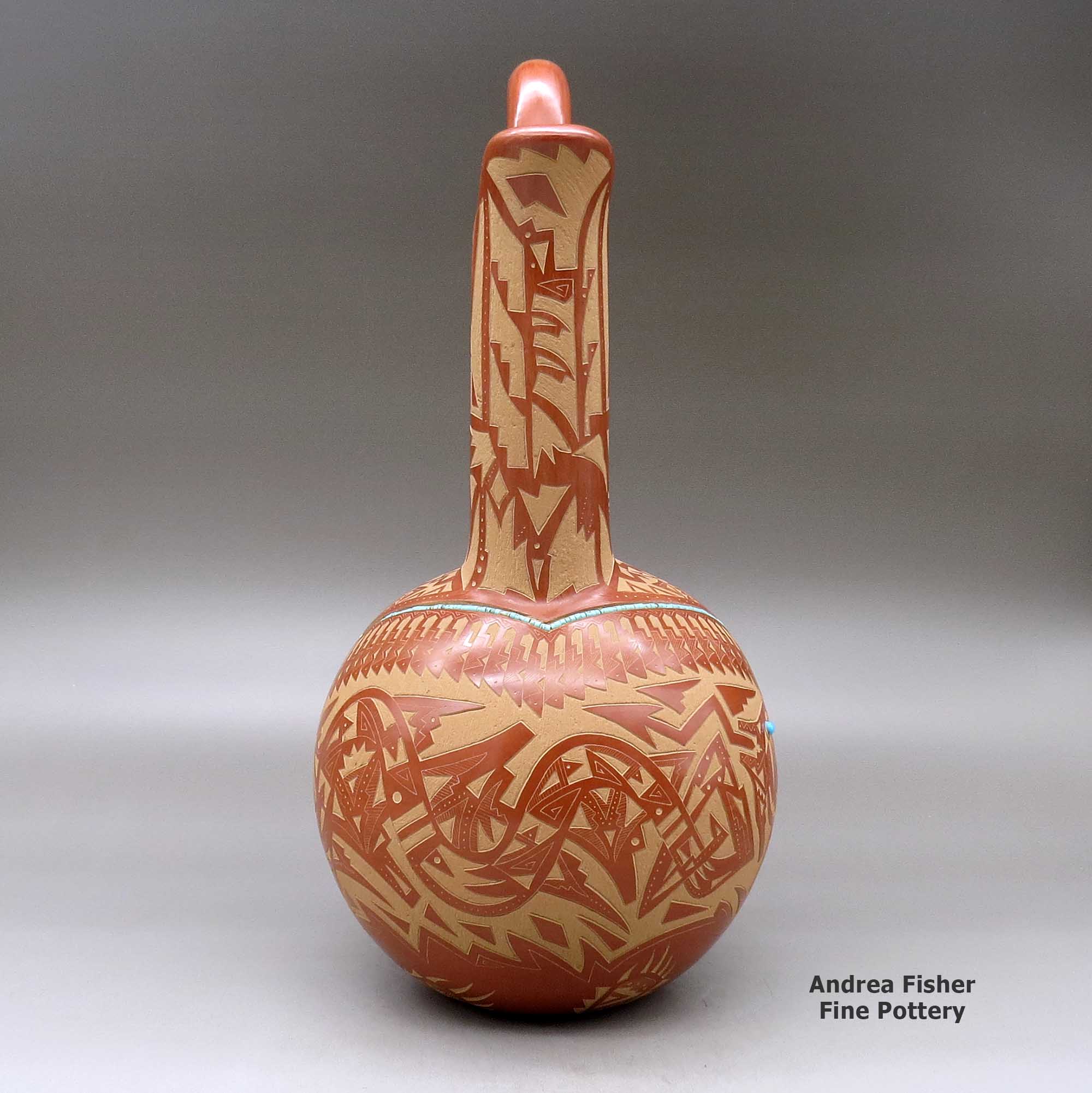 A large red wedding vase decorated with a sgraffito double avanyu, feather,bear paw and geometric design with inlaid stones and strands of heishi beads