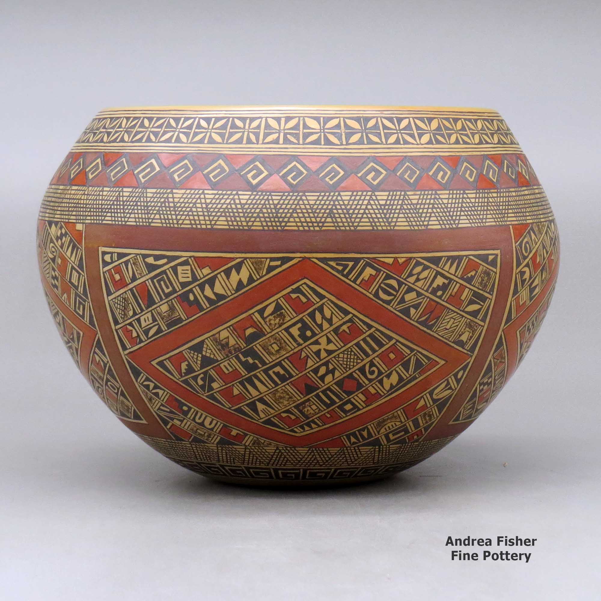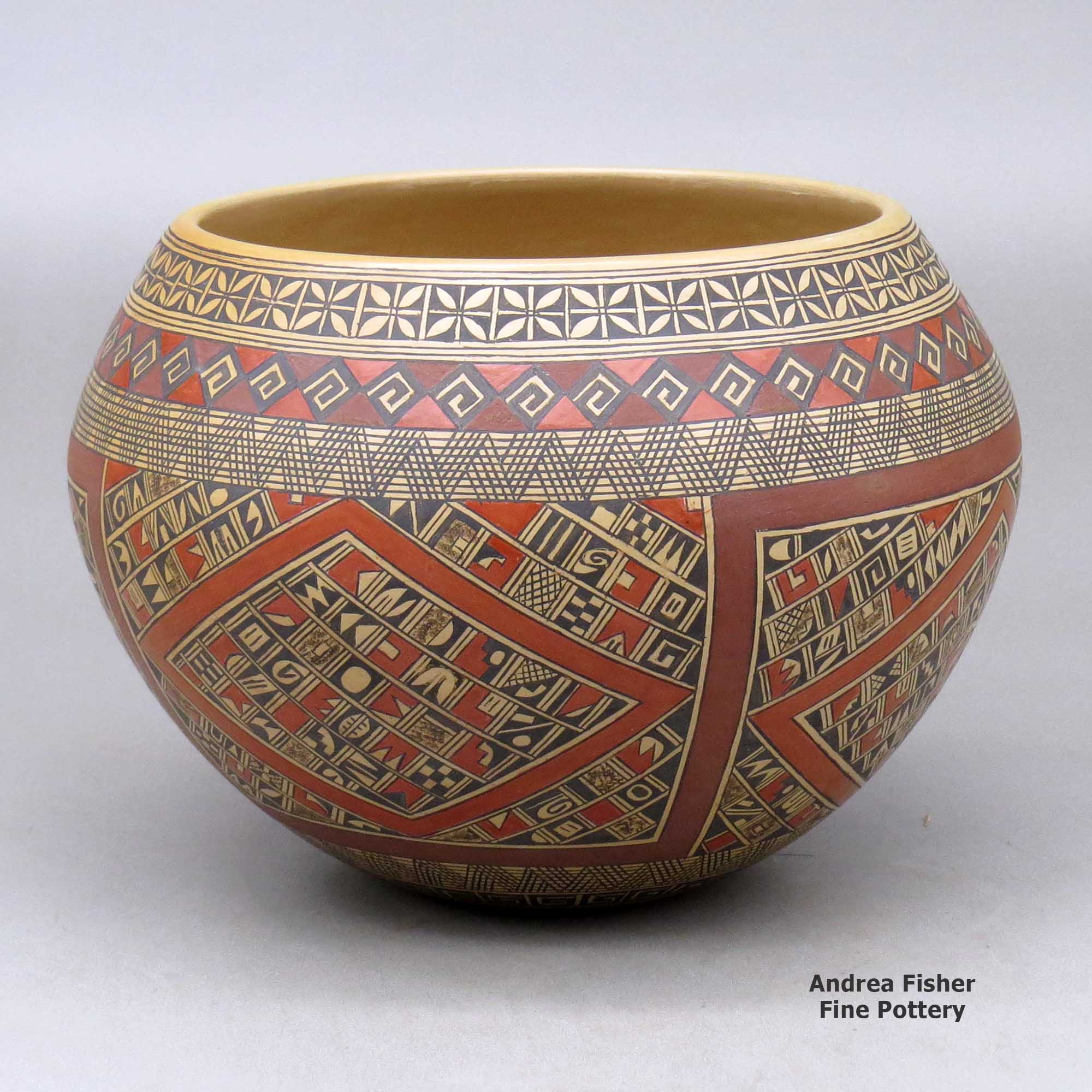 She has been one of the most in-demand Hopi-Tewa potters for many years. She has been featured in many publications and her work is represented in major galleries and museums throughout the country. Over the years Rondina has earned ribbons from the prestigious Santa Fe Indian Market. In 1986 one of her pieces was awarded Best of Show, Best of Division and Best of Traditional Pottery. In 1996 another of her pieces swept all three awards again. Her work is easily recognized for her intricate designs that incorporate hundreds of small elements. Her polish is exceptional and her painting remarkable. Unlike most potters, she usually polishes the insides of her pots, too.