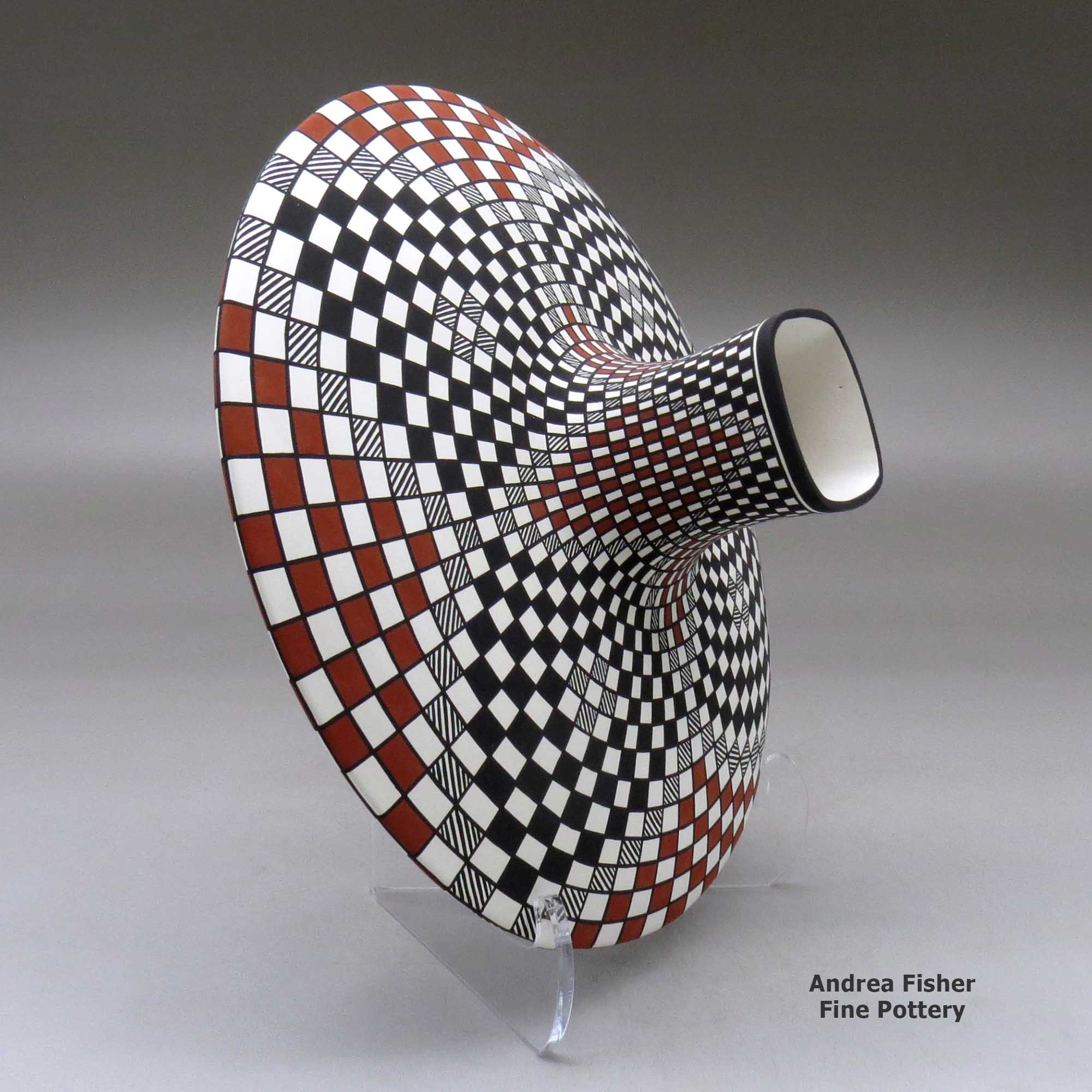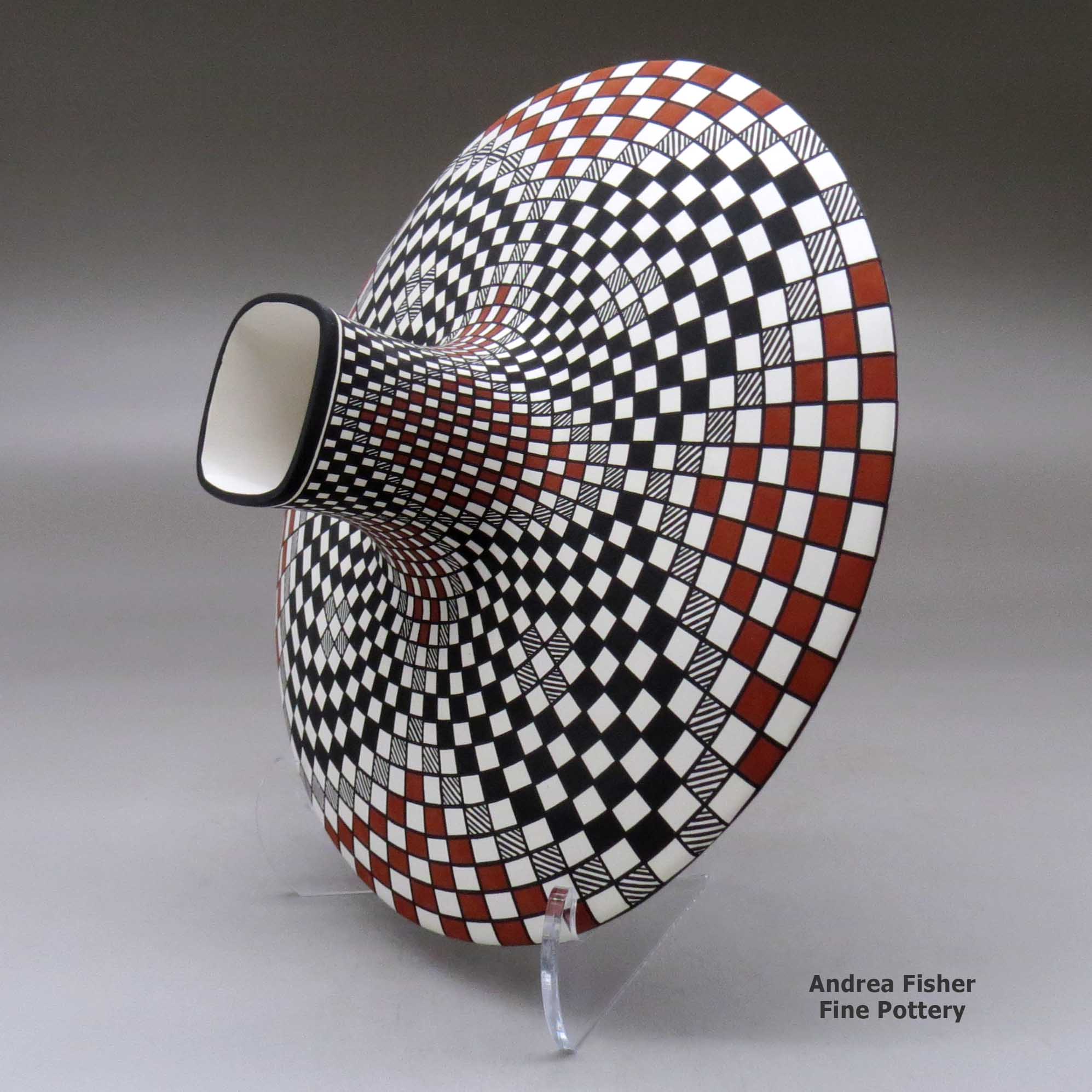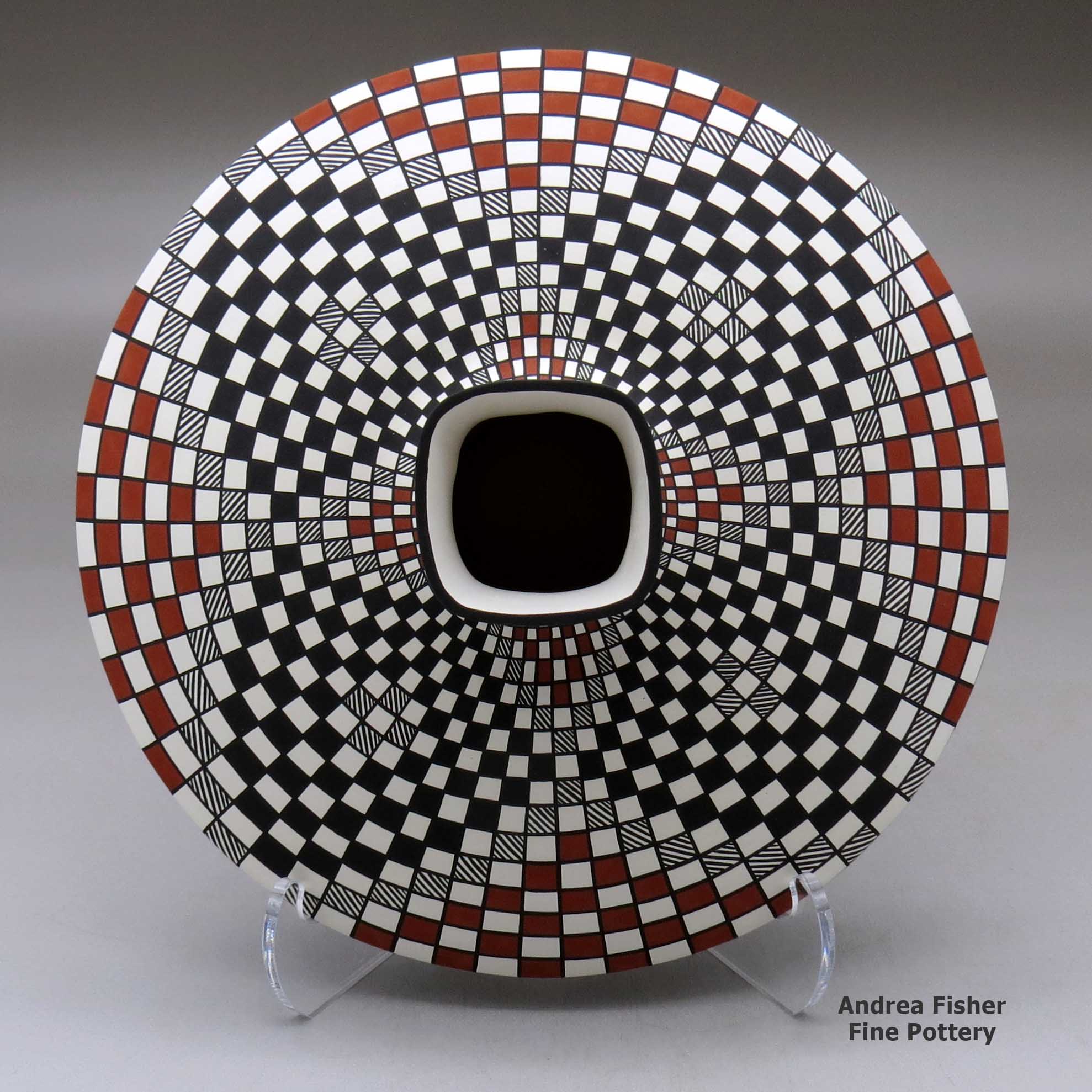 A polychrome low shouldered jar with a squarish neck and rim and decorated with a stylized checkerboard and geometric design made by Paula Estevan of Acoma