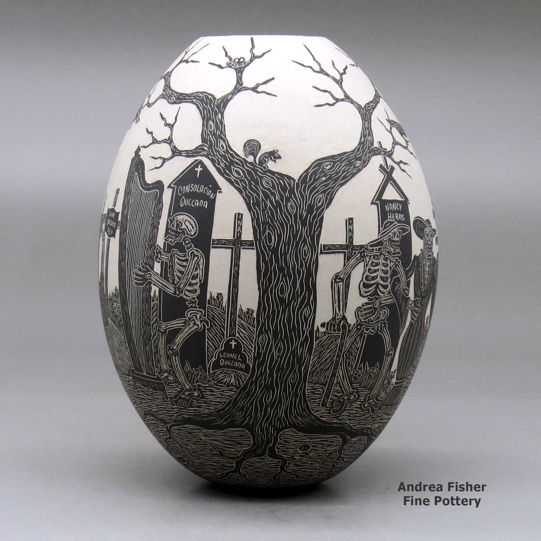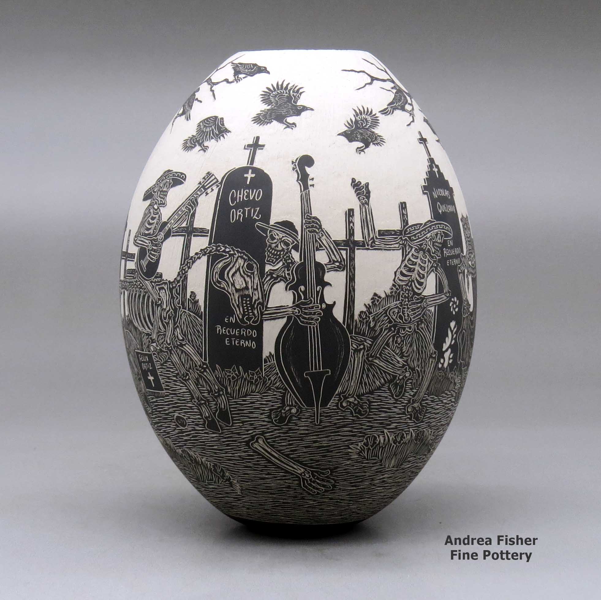 A black on white jar decorated with a sgraffito Day of the Dead at the cemetery design