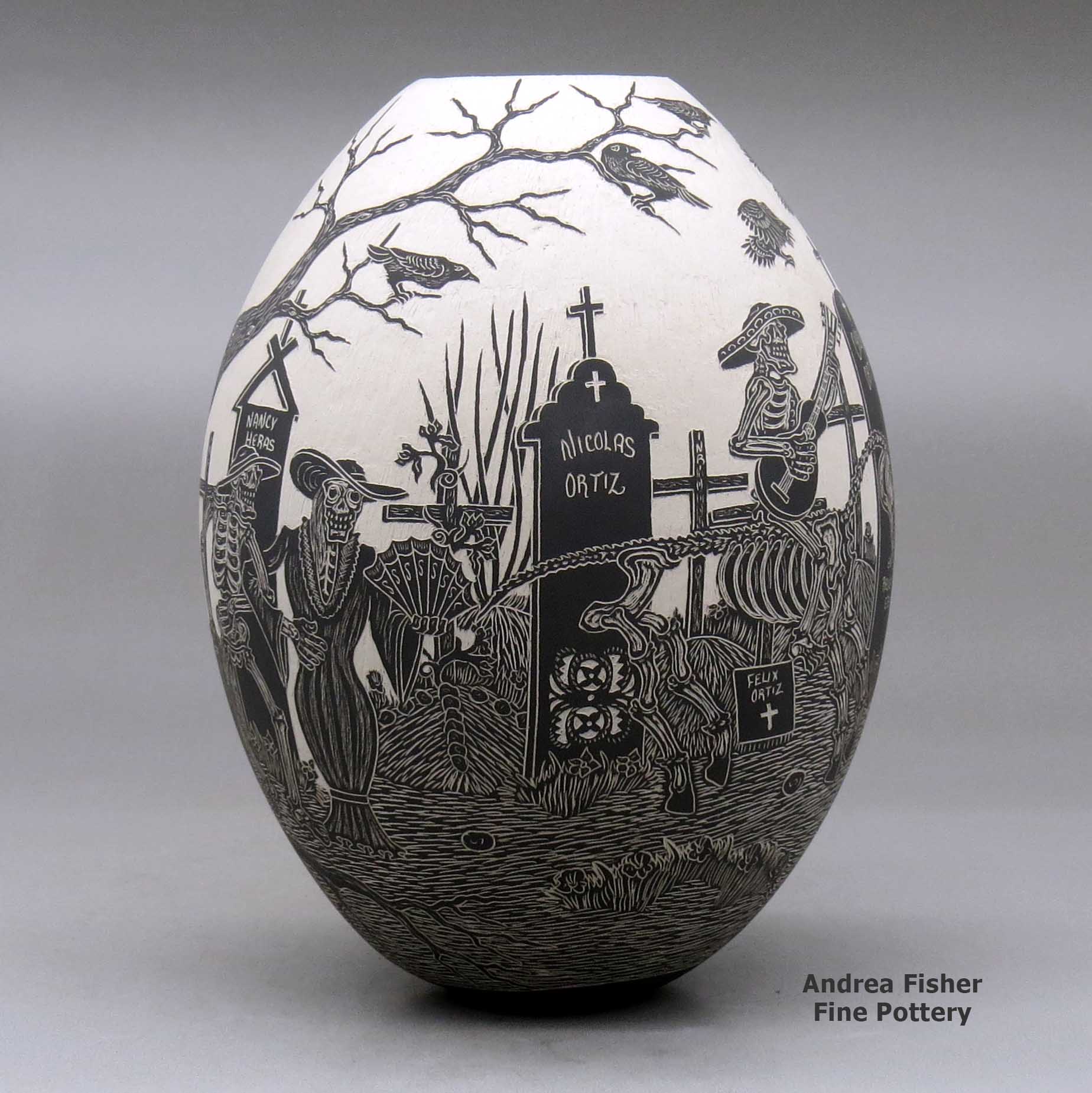 A black on white jar decorated with a sgraffito Day of the Dead at the cemetery design made by Hector Javier Martinez of Mata Ortiz and Casas Grandes