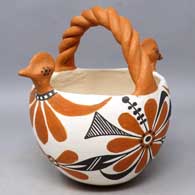 Edna was producing pottery for the marketplace as a teenager, and is recorded to have won ribbons at the Bi-County Fair and a First Place ribbon at the New Mexico State Fair. She mostly makes traditional fineline polychrome jars and bowls. She also decorates many of her pieces with her version of the Acoma parrot and with various Mimbres-Mogollon geometric designs.