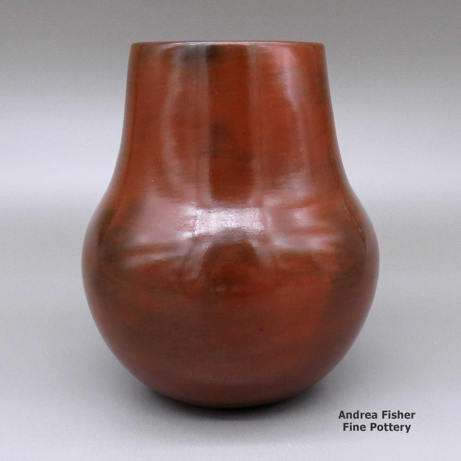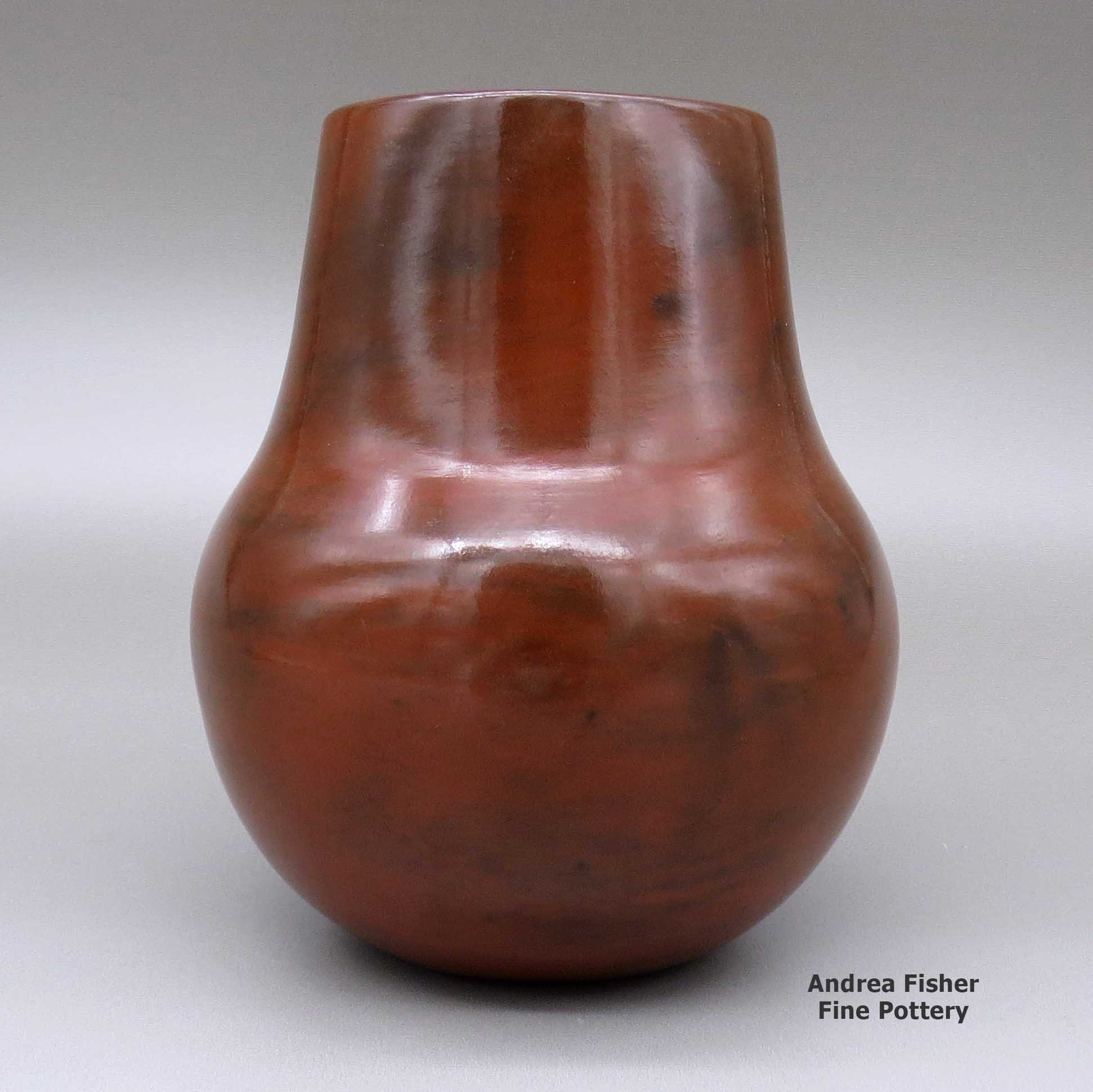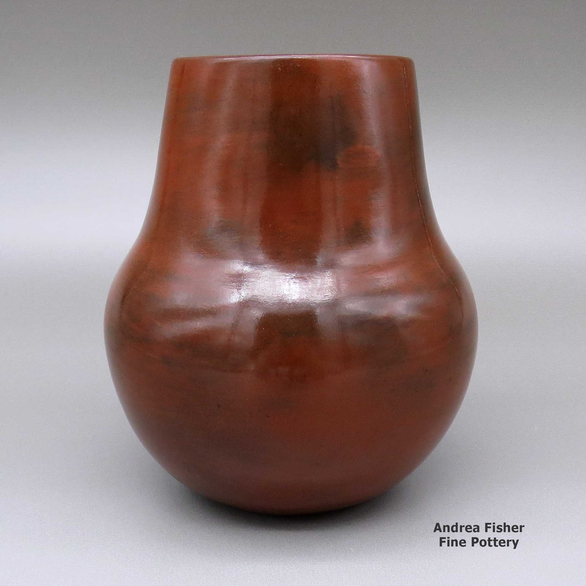Created at her home in Shonto, AZ, Susie's pottery is entirely hand-made, from digging and preparing the clay to hand coiling the pot to burnishing and decorating it and finally to firing it in a wood fire. Her polished redware pottery is thin-walled, well proportioned and highly symmetrical with a well-burnished surface, often decorated with a biyo' (a traditional decorative fillet around the rim). The firing produces beautiful color variations (called fire clouds) that range from red to orange and brown to black tones. Firing also brings out subtle shades introduced during the burnishing process by the way the stone is held and how it is moved across the surface of the pot. After firing she finishes her pots with a coat of hot pine pitch.