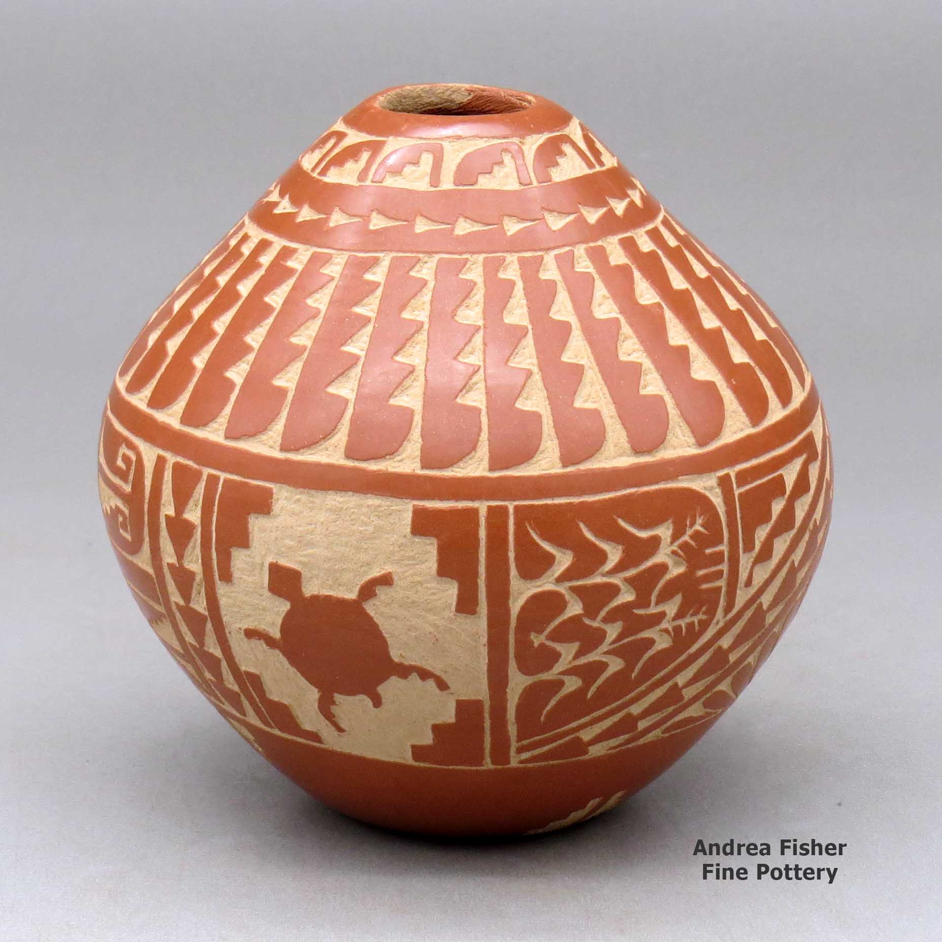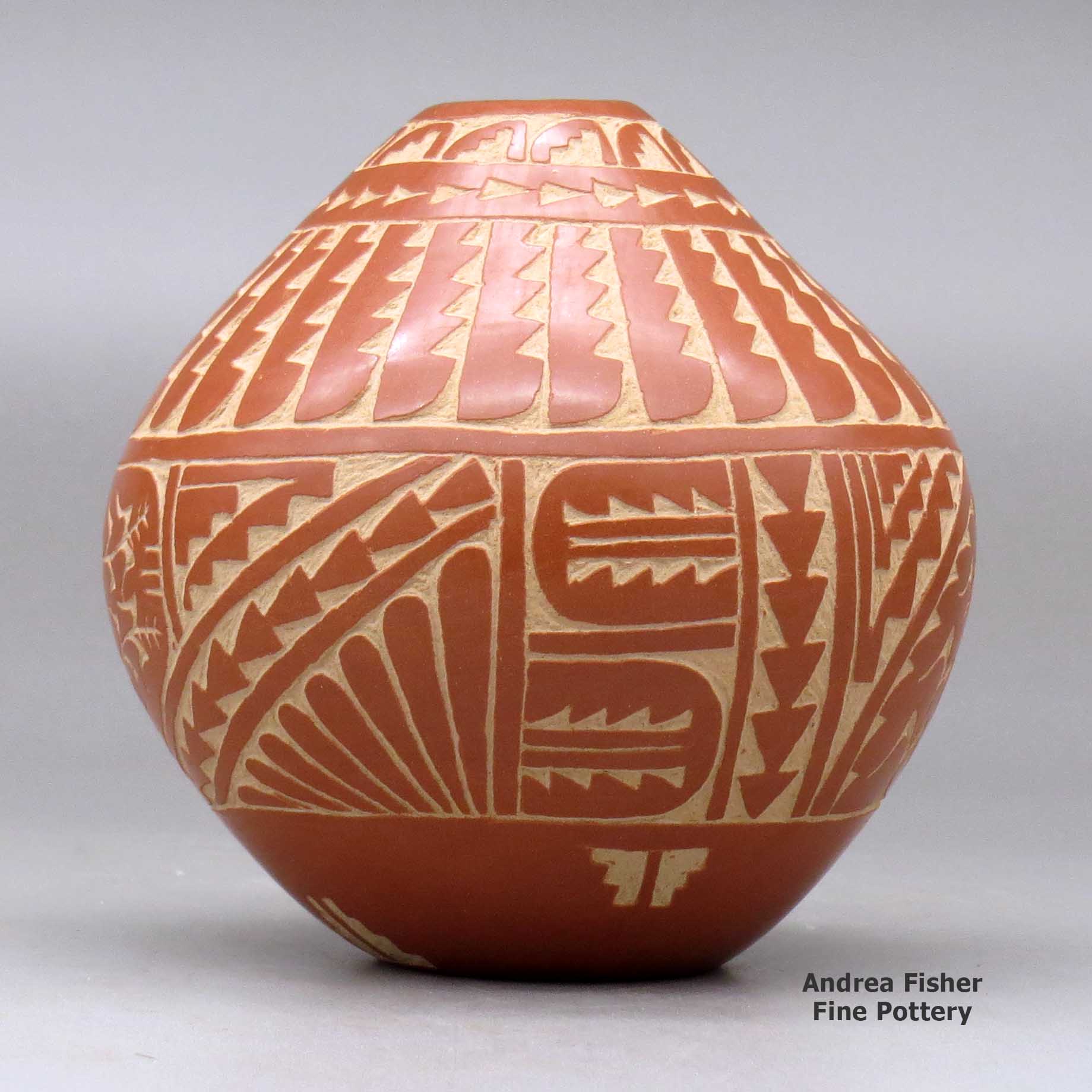 Alvina is known for making intricately etched, larger-scale jars that often incorporate a melon-style swirl. She works mostly with Jemez red clay.