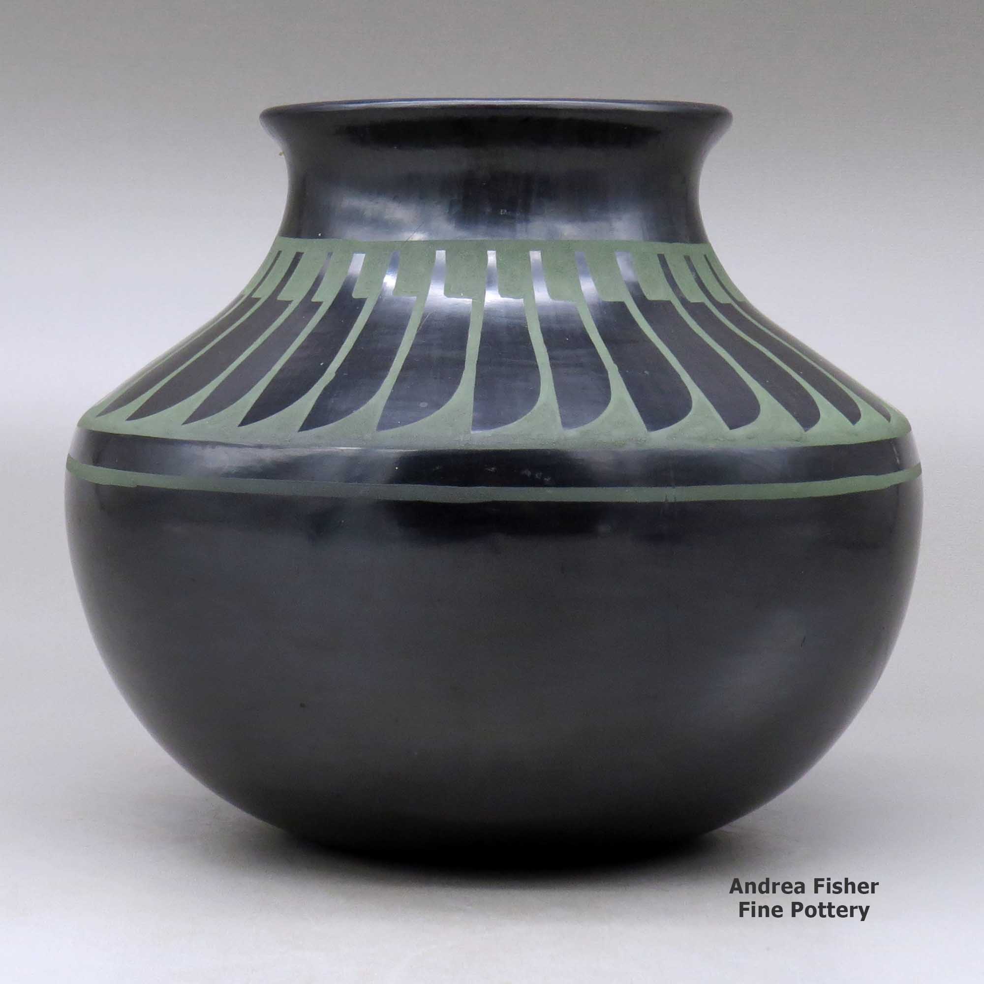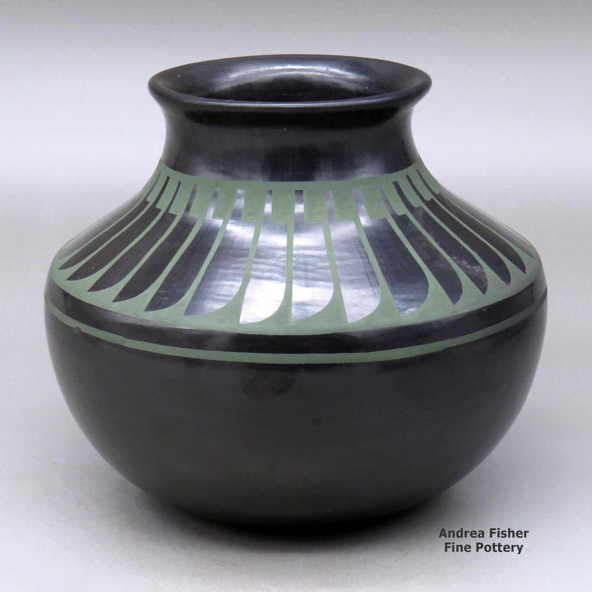 Over the years Martha has experimented with using different techniques and different clays. She made some cream-on-red pots like her uncle and aunt Albert and Josephine Vigil. She made some green-on-red pots, similar to those of another uncle, Tse Pe. She also sometimes let her son, Erik Sunbird Fender, paint her pots.