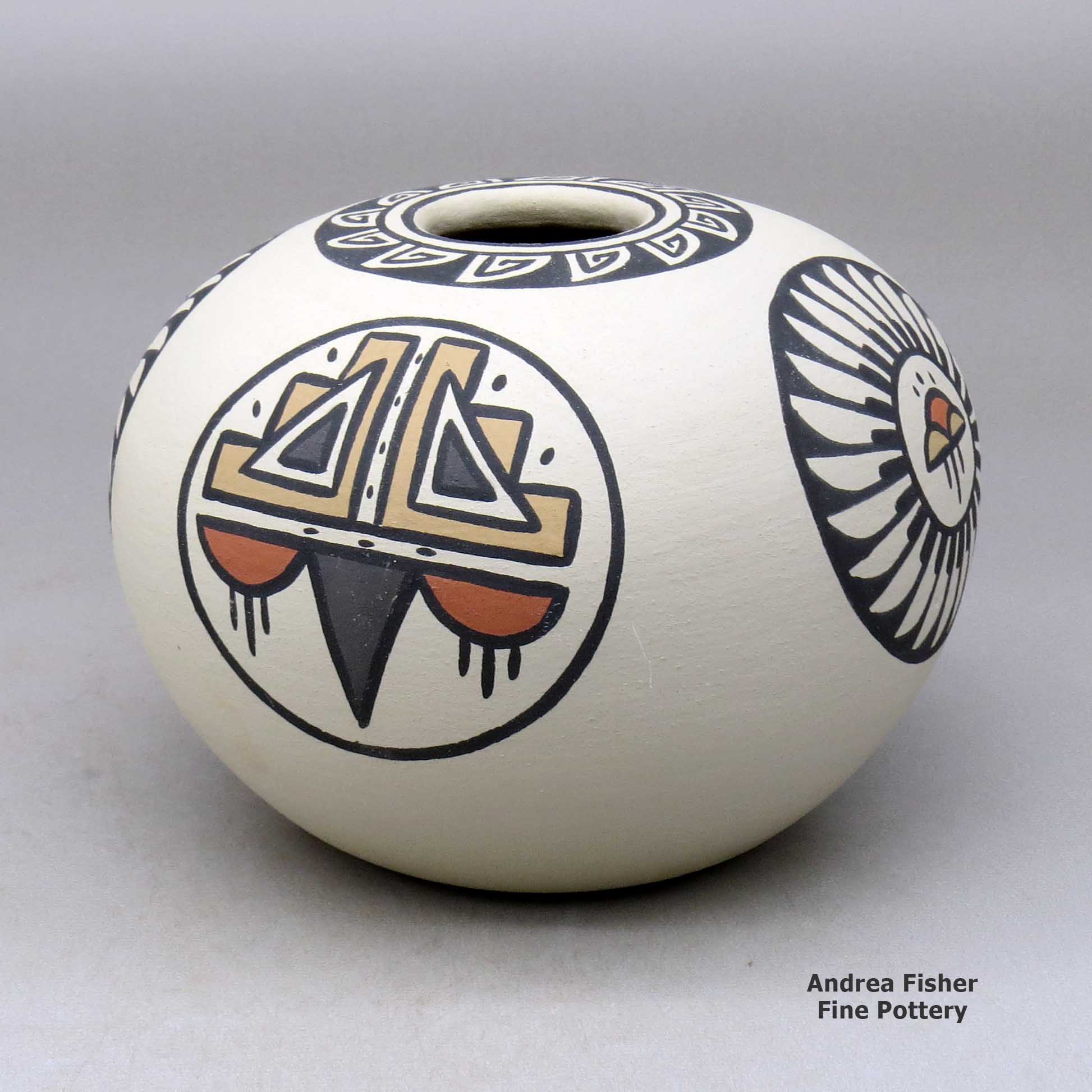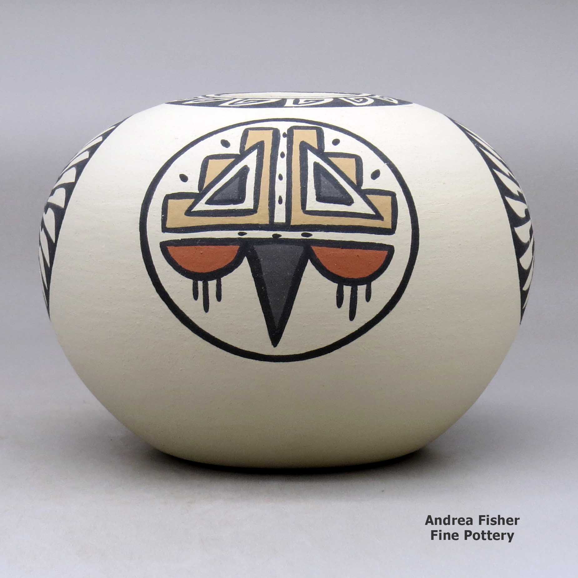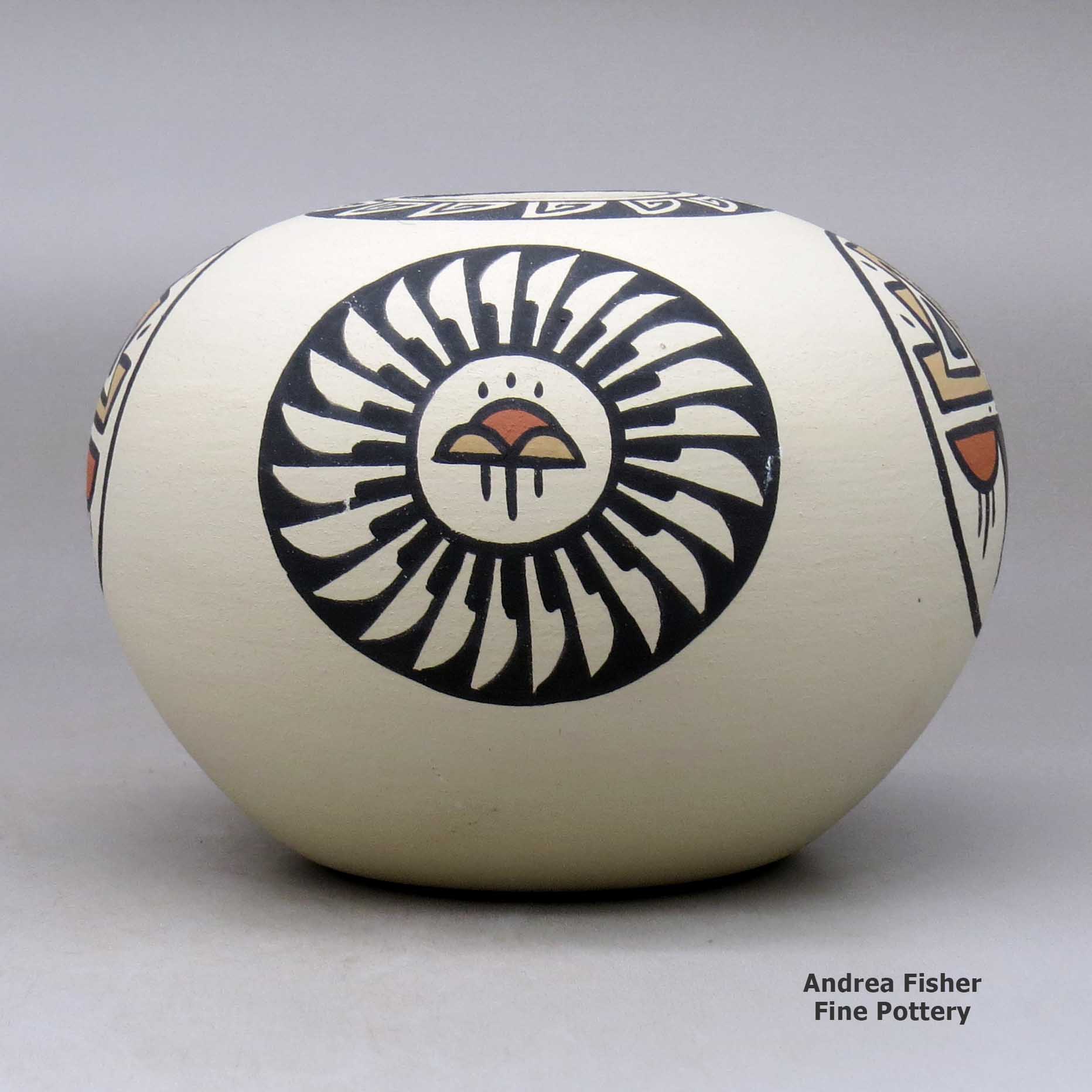 Minnie specialized in polychrome wares, some slipped in red clay and stone polished, some slipped in matte tan clay and not polished. Her favorite designs were rainbows, rain clouds, bear paws and sky bands.