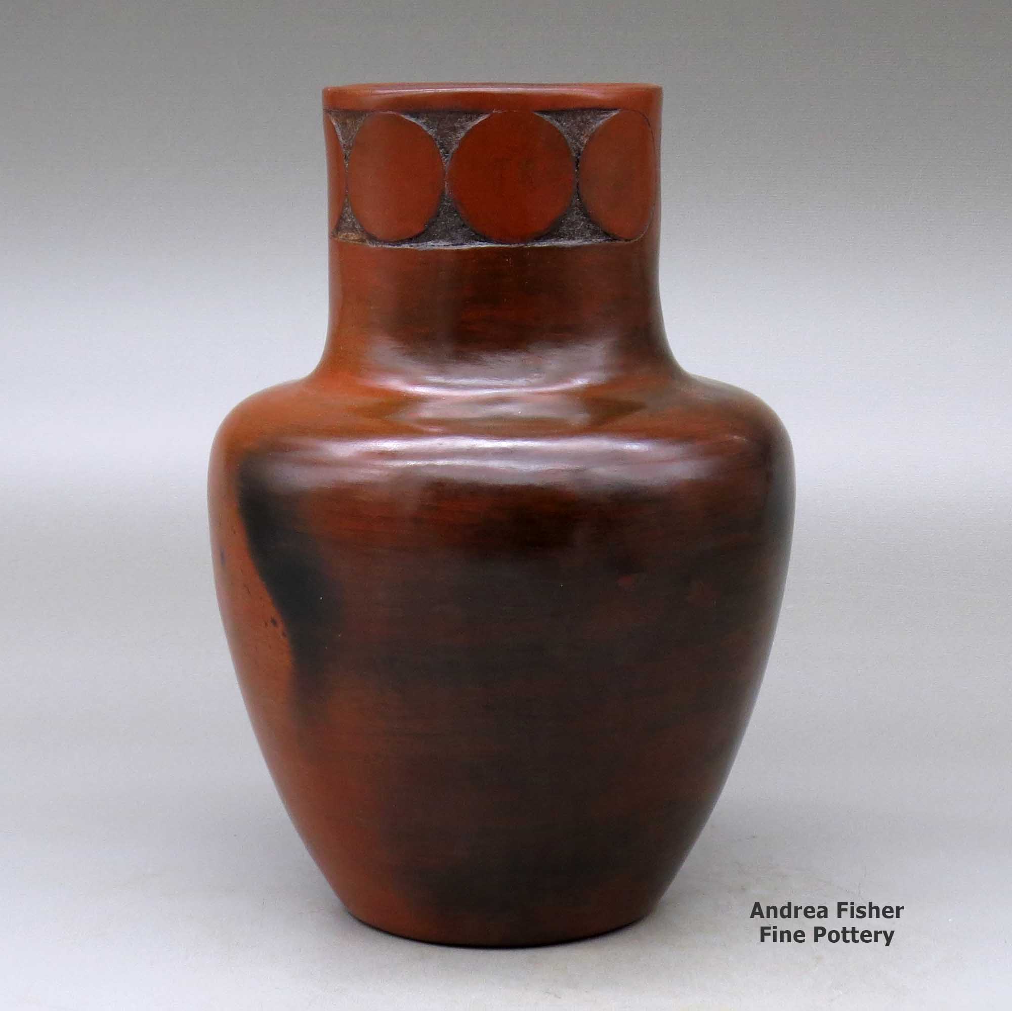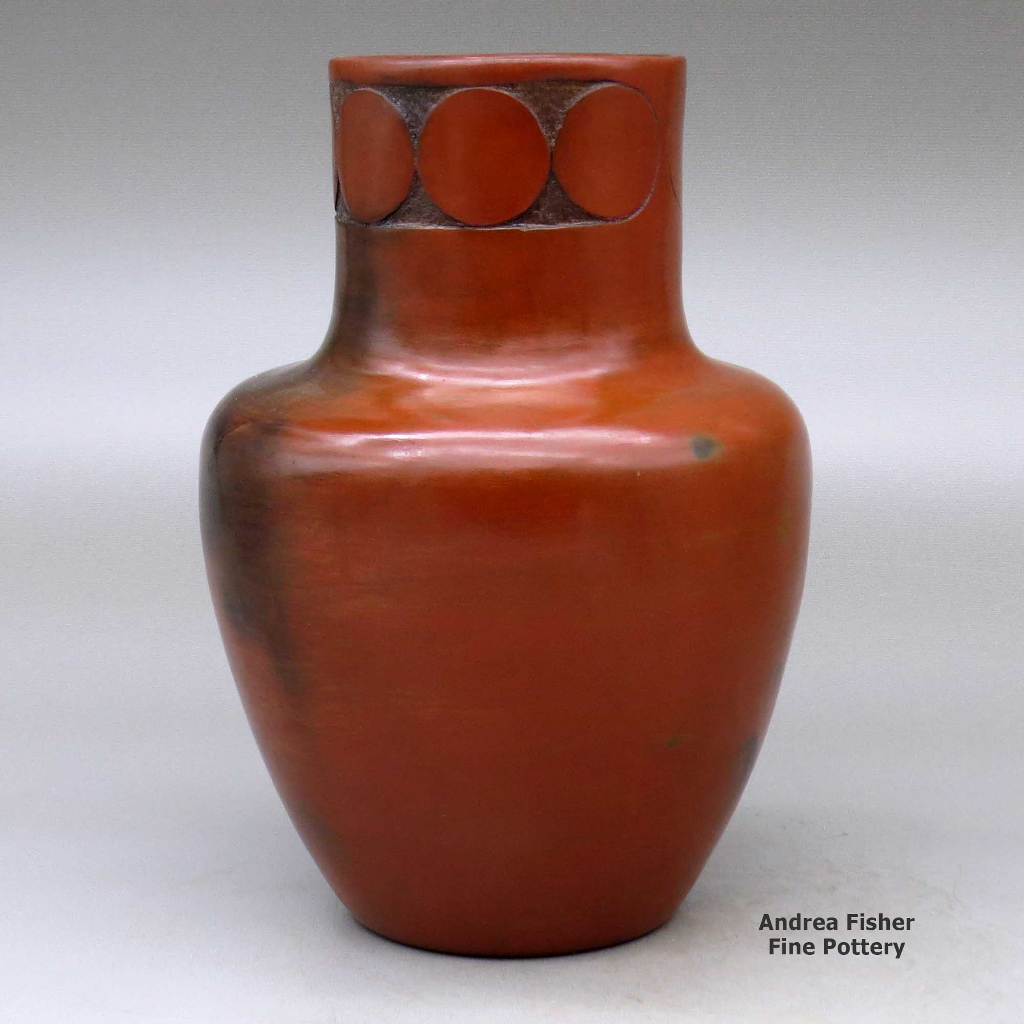 Rose Williams is considered the matriarch of modern Dineh pottery. She learned from Grace Barlow (her aunt) and passed her knowledge and experience on to her daughters and many others. Today, most Dineh pottery is heavy, thick-walled and coated with pine pitch (a sealer they also use on many of their baskets). Most Dineh pottery has little in the way of decoration but many pieces have a biyo' (a traditional decorative fillet) around the rim. Unlike Puebloan potters, Dineh potters do not grind up old pot sherds and use them for temper in creating new pottery. Their religion says those pot sherds are infused with the spirits of their ancestors and that forbids the reuse of the material. Similarly, Dineh religion limits Dineh potters to using primarily Dineh carpet designs in the decoration of their pots.