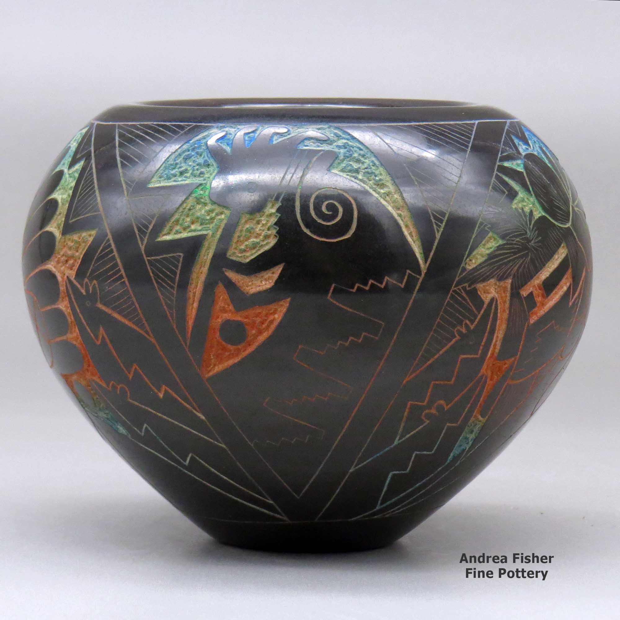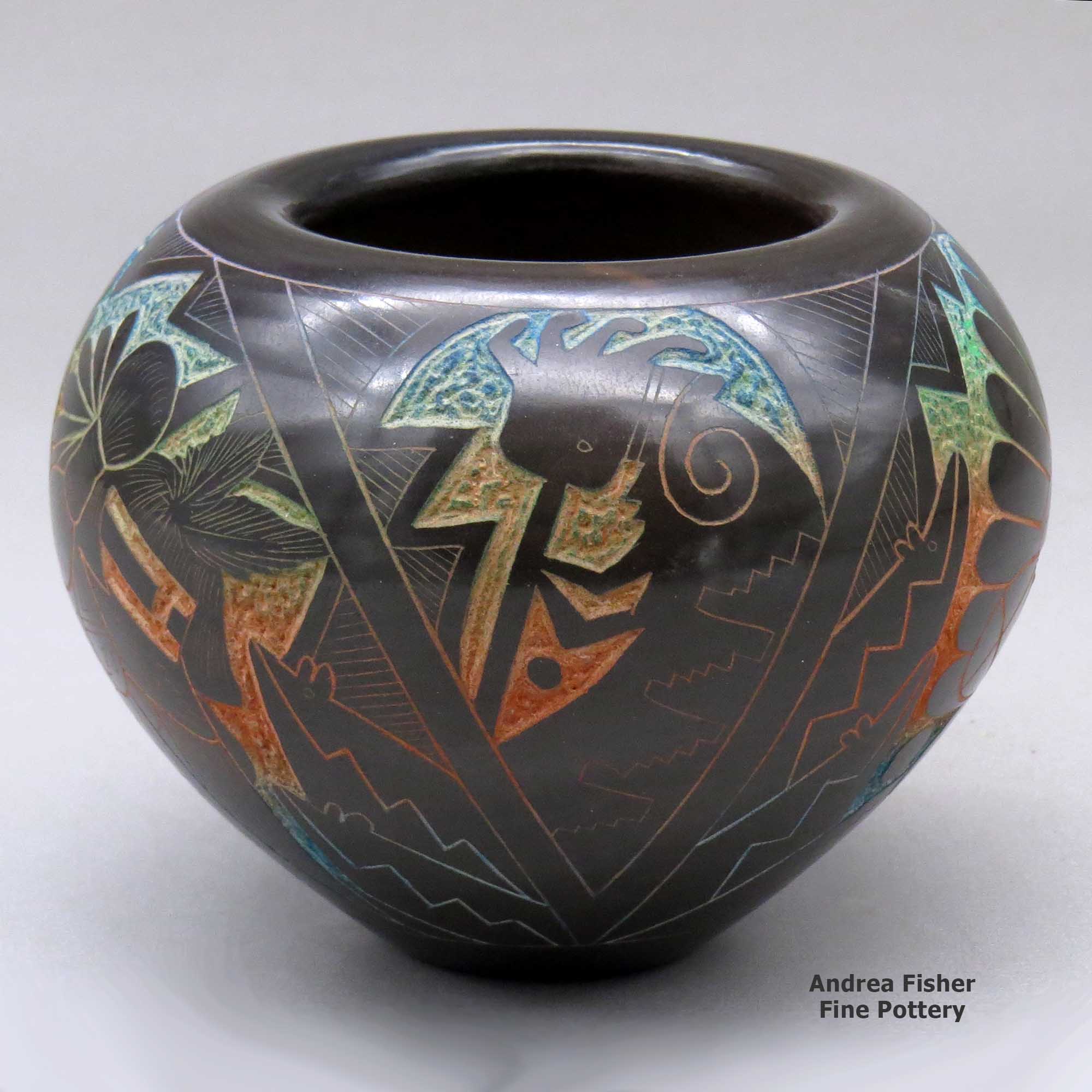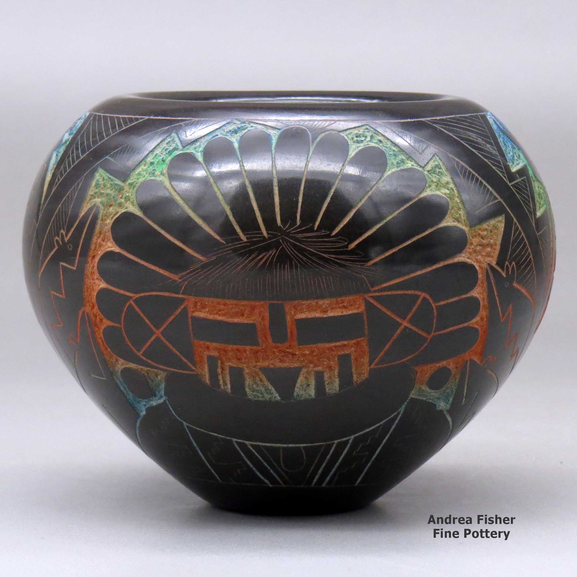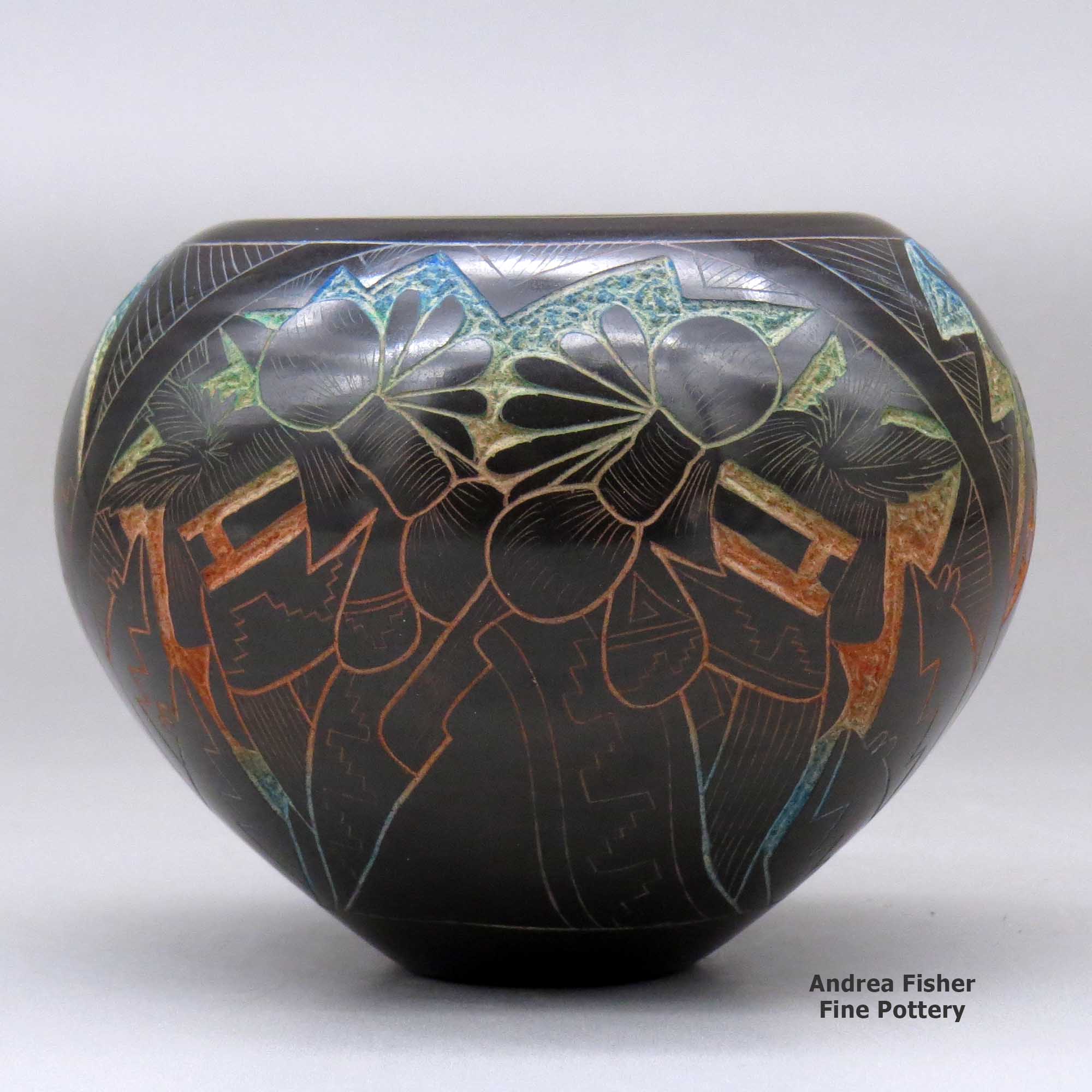 Ergil Vallo was a potter from Acoma Pueblo. He was of mixed Hopi and Acoma heritage. He was known by most people as Dalawepi (Colors of the Rainbow). He mostly did sgraffito artistry on black pieces. His favorite designs were based on Hopi Katsinas, Mimbres animals, kiva steps and geometric designs. Then he had a method of tinting his sgraffito work in rainbow colors using ground minerals and natural pollens.