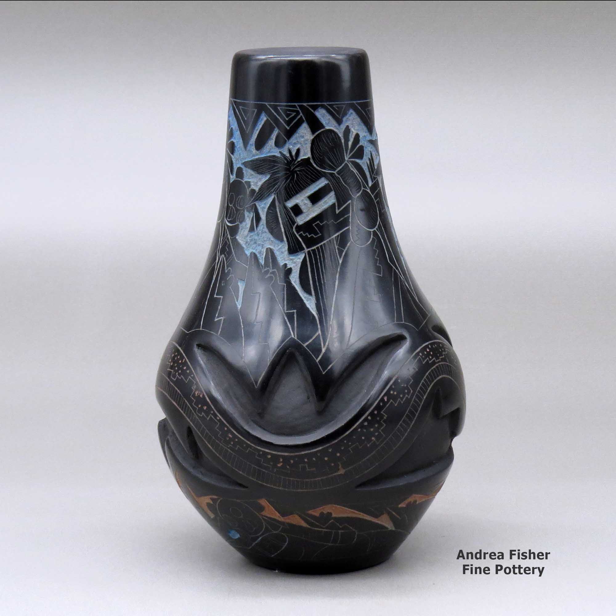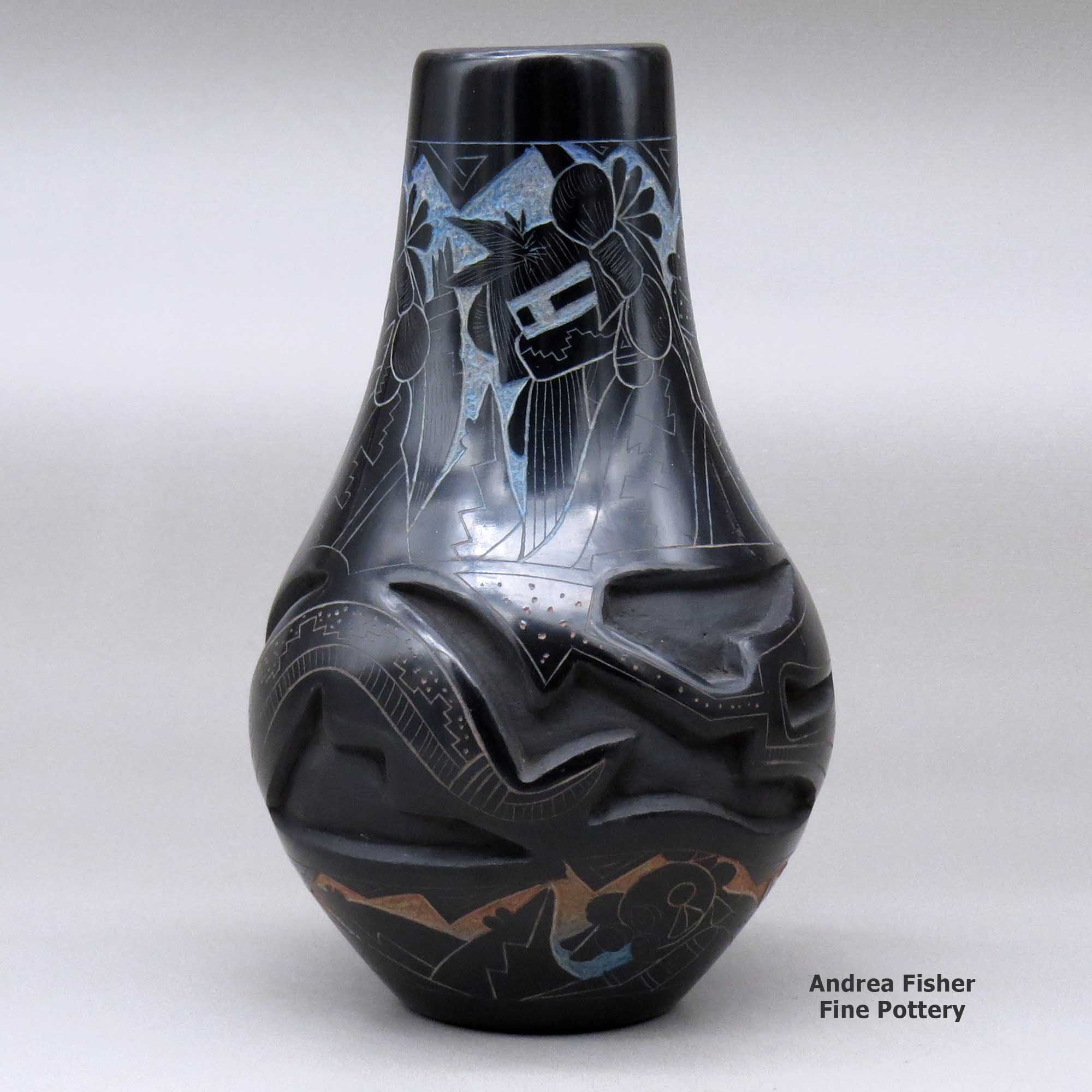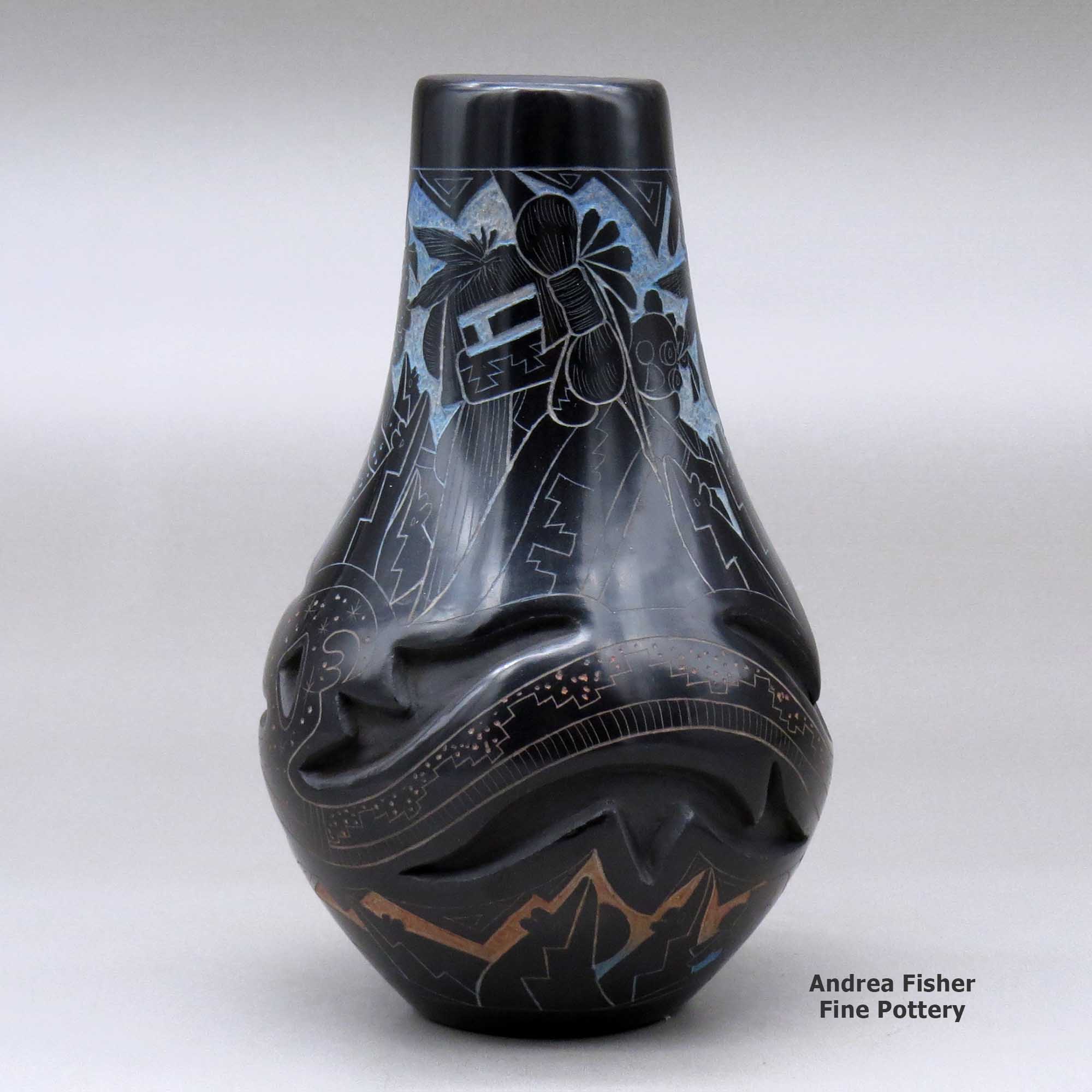 Ergil Vallo was a potter from Acoma Pueblo. He was of mixed Hopi and Acoma heritage. He was known by most people as Dalawepi (Colors of the Rainbow). He mostly did sgraffito artistry on black pieces. His favorite designs were based on Hopi Katsinas, Mimbres animals, kiva steps and geometric designs. Then he had a method of tinting his sgraffito work in rainbow colors using ground minerals and natural pollens.