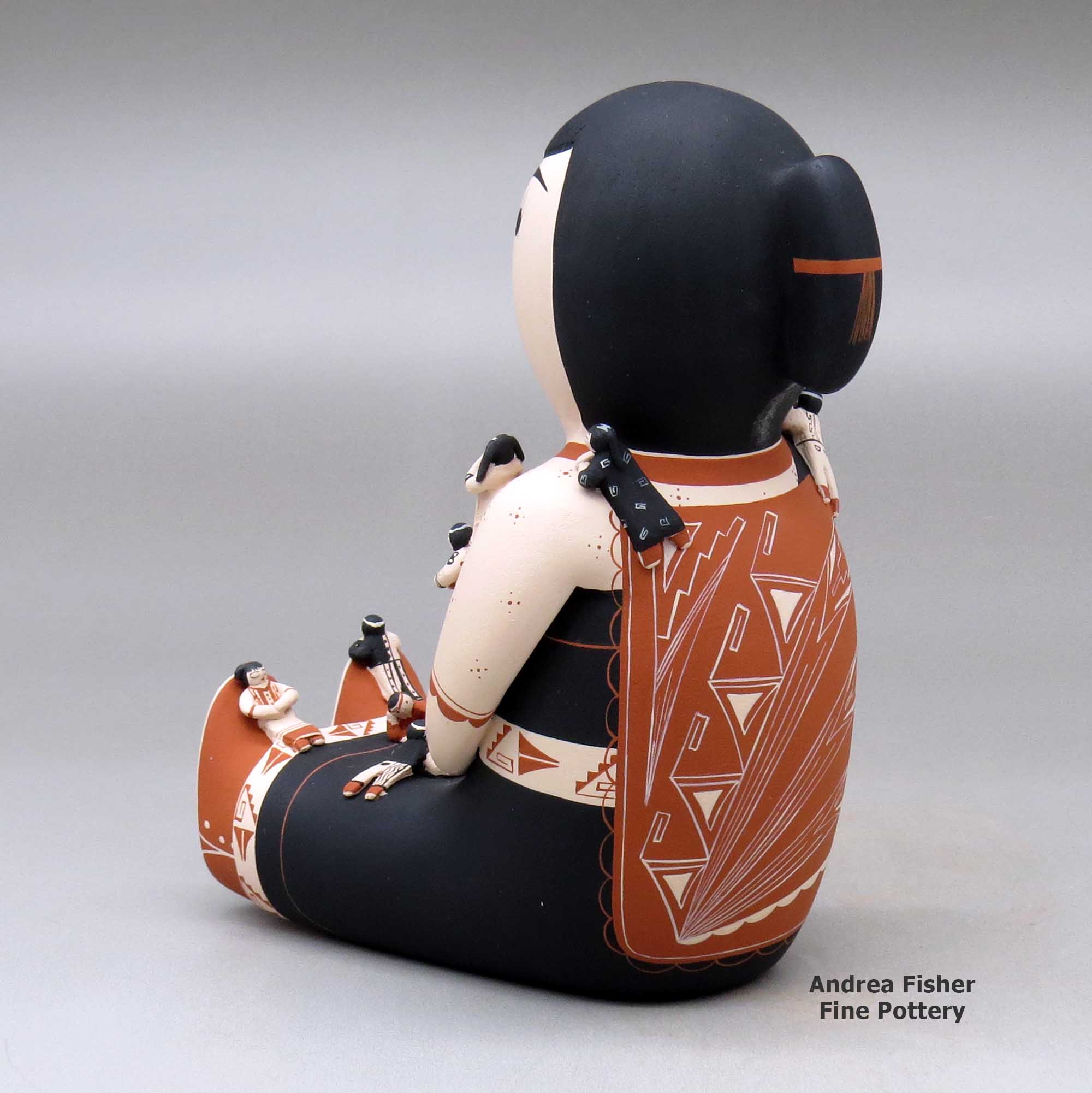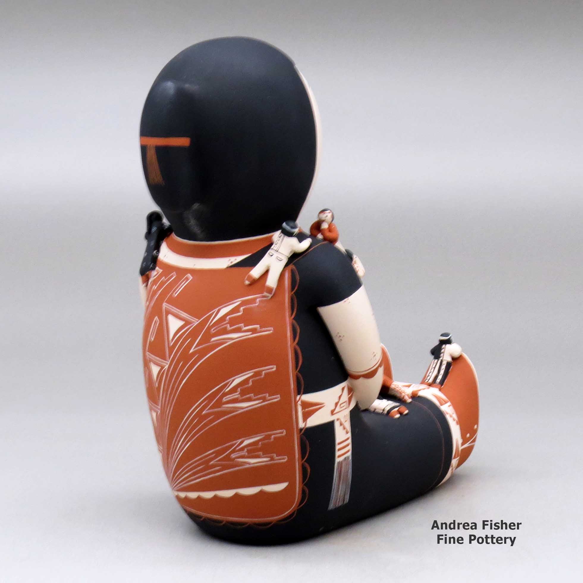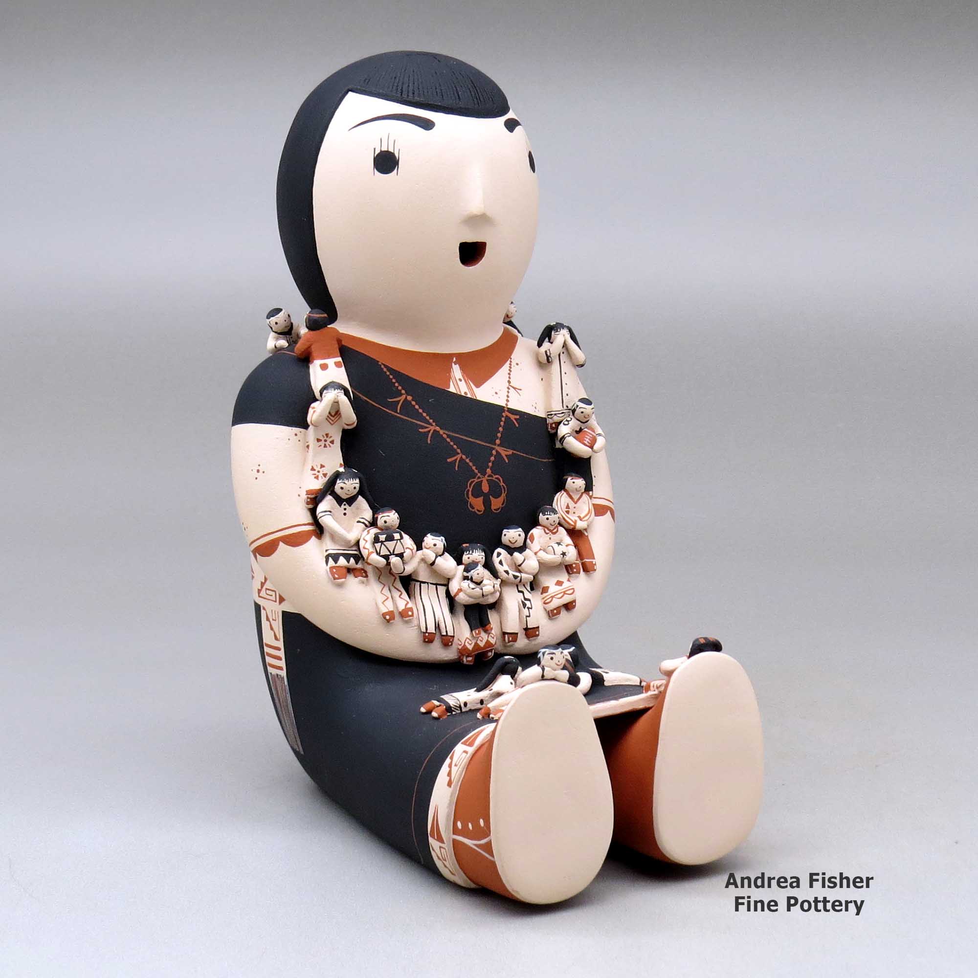 The first real storyteller figure was created in 1964 by Cochiti Pueblo potter Helen Cordero. She made it in memory of her grandfather, Santiago Quintana, and the stories he sang to her and other children in their native Keres when she was young. Helen's creation struck a chord throughout all the pueblos as the storyteller is a figure central to all their societies. Most tribes also have the figure of the Singing Maiden in their pantheon and in many cases, the mix of Singing Maiden and Storyteller has blurred some lines in the pottery world. Today, as many as three hundred potters in thirteen pueblos have created storytellers, and their storytellers are not only men and women but also Santa's, mudheads, koshares, bears, owls and other animals, sometimes encumbered with children numbering more than one hundred! Each potter has also customized their storyteller figures to more closely reflect the forms, dress and decorations of their own tribes, often even of their own clans.