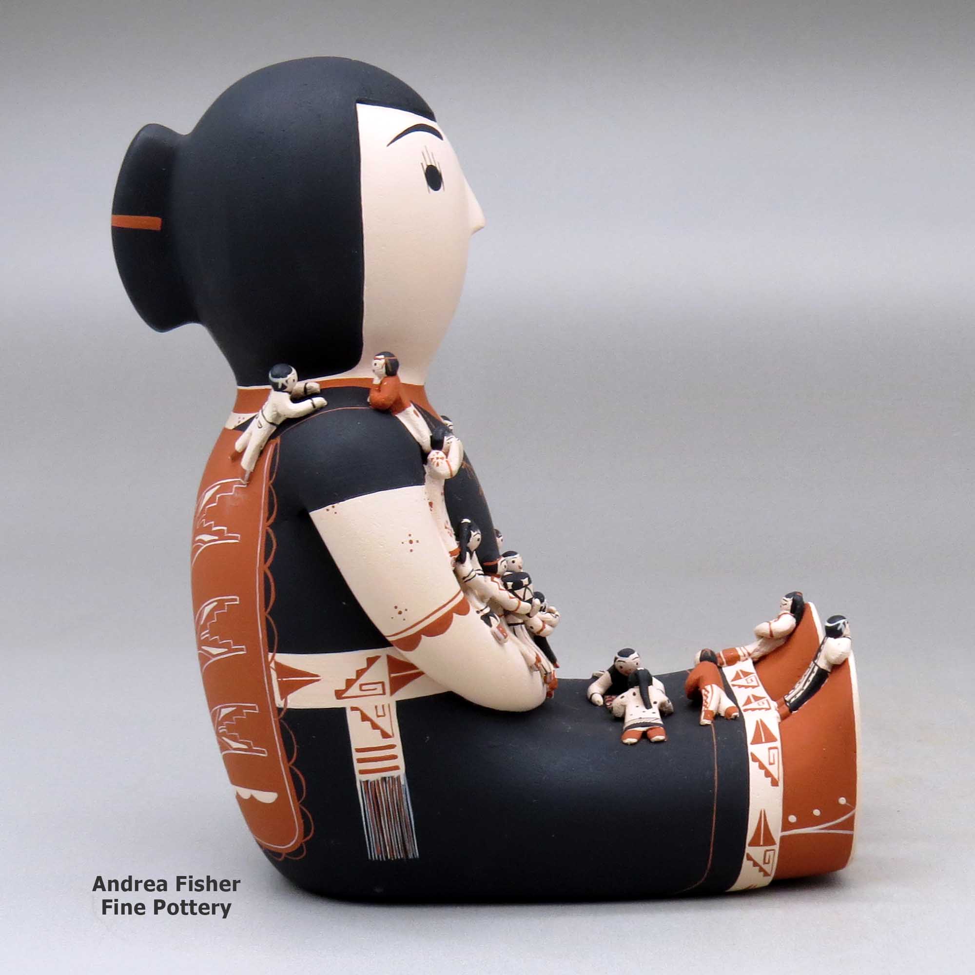 After that, she learned how to make storytellers by watching her mother-in-law. A difference is that Dena makes really tiny babies, and a lot of those tiny babies on one storyteller.