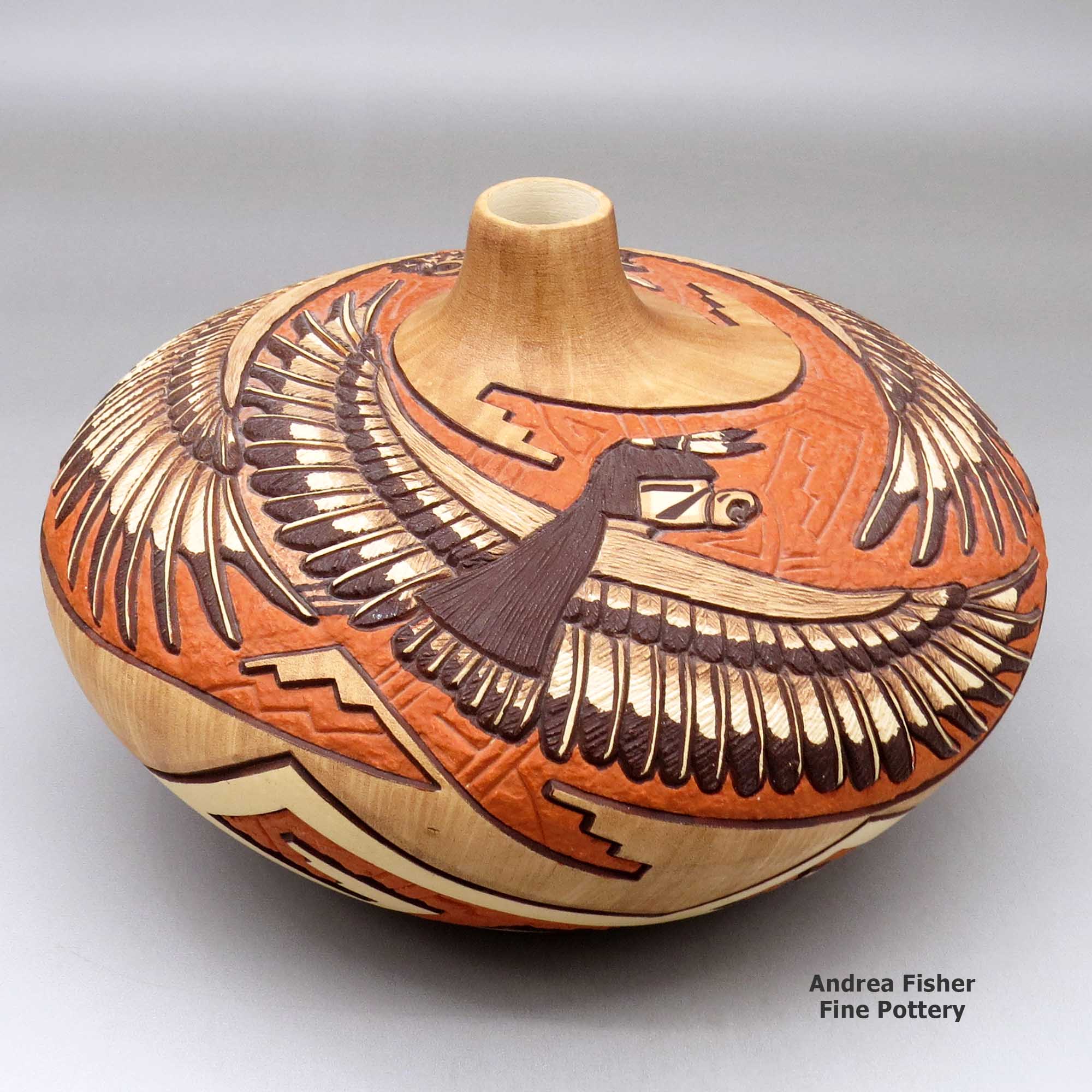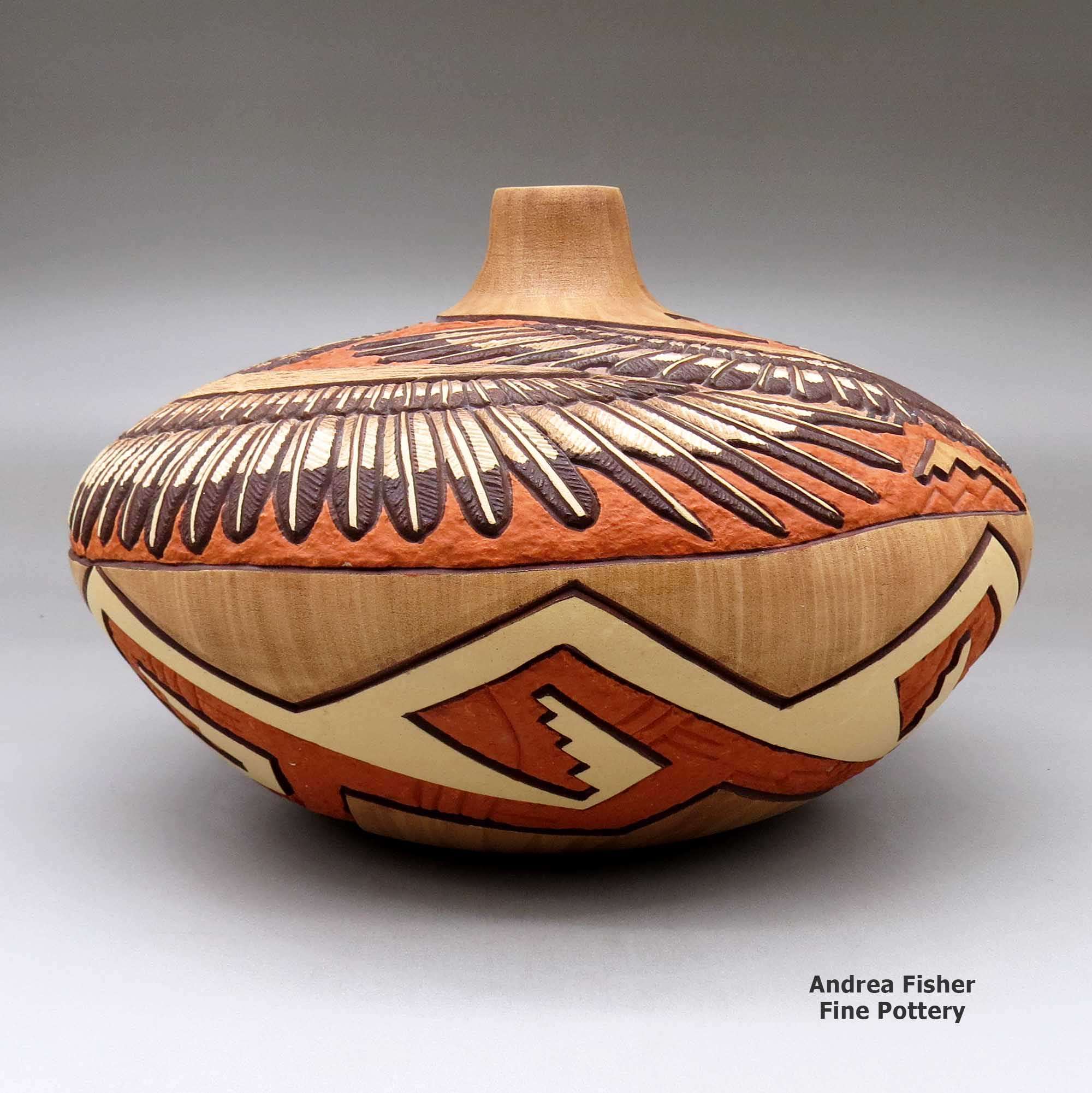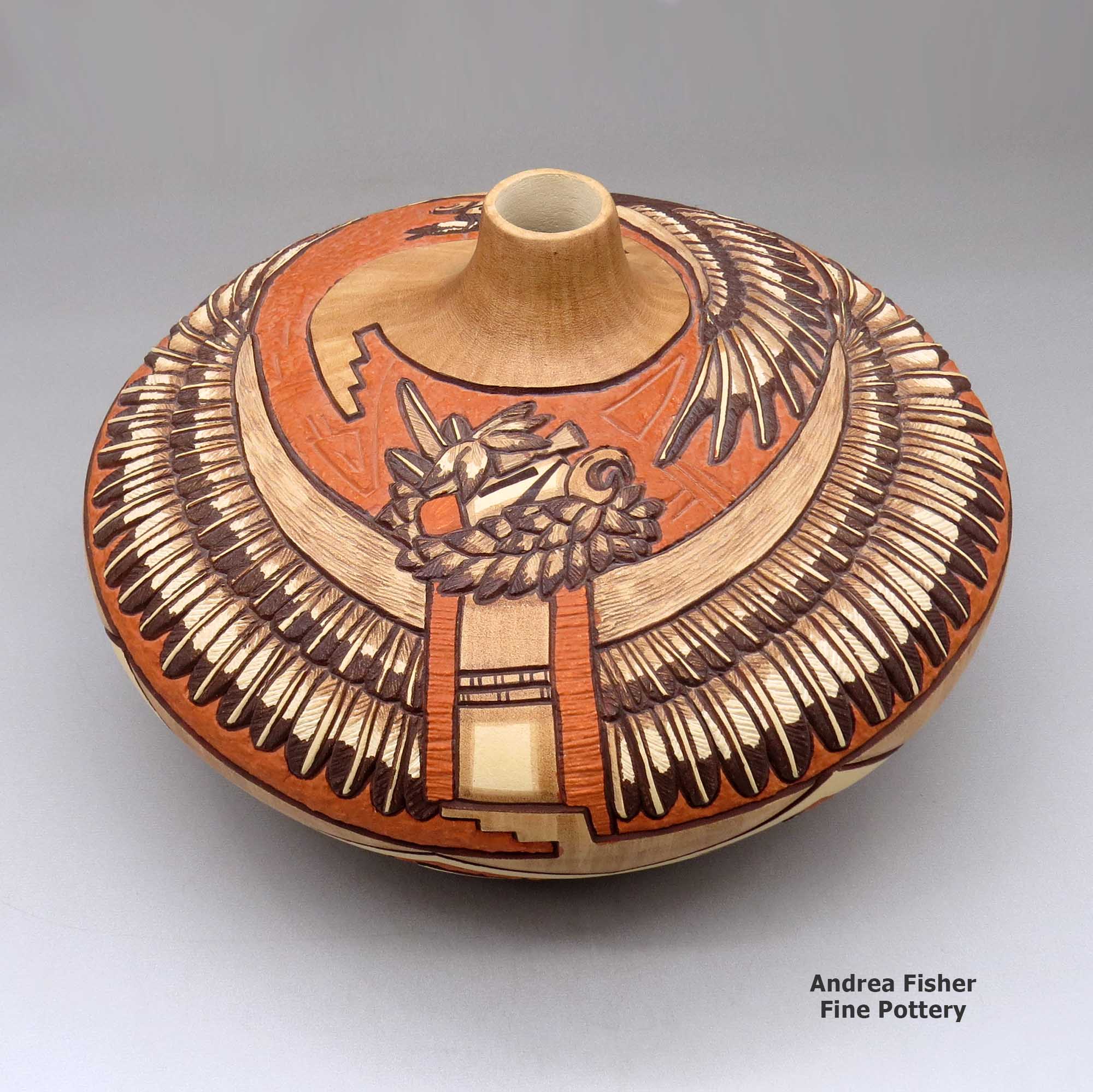 As both Marty and Elvira learned the craft of making and decorating pottery from Elvira's father, Tom, their work follows closely in his footsteps with intricately carved, painted and etched scenes from Hopi culture decorating their jars, bowls, seed pots and other pieces.