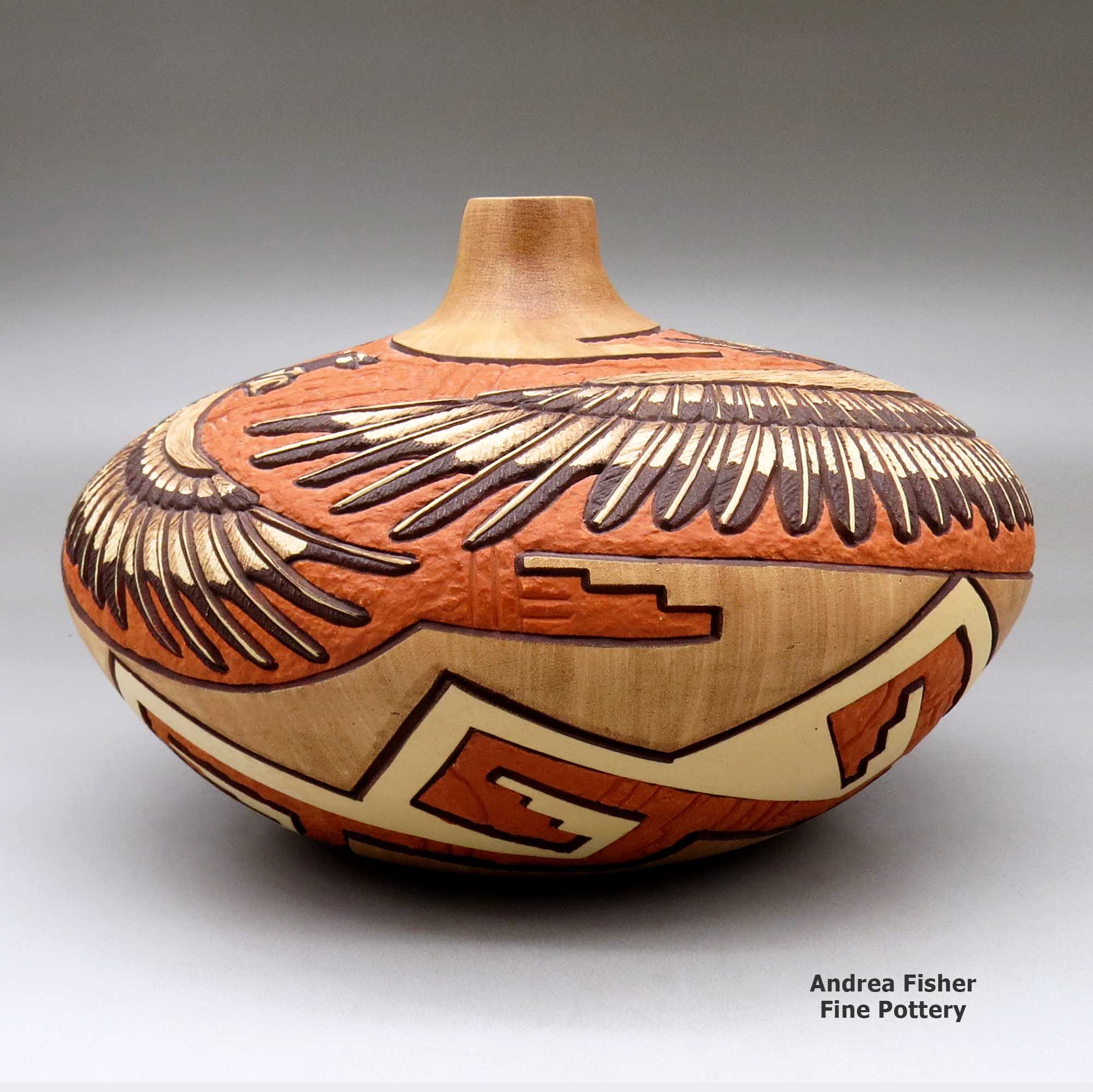 Much of the symbology painted on Hopi pottery is themed with "bird elements:" eagle and parrot tails, feathers, beaks and wings, and with katsinam (images of their gods) and permutations of migration patterns. Many Hopi, Hopi-Tewa and Tewa potters are members of the Corn Clan and their annual religious cycle revolves around the seasons of corn. The vast majority of today's Hopi pottery shapes and the designs painted on them are obvious descendants of the work of potters who existed 200-and-more years ago.