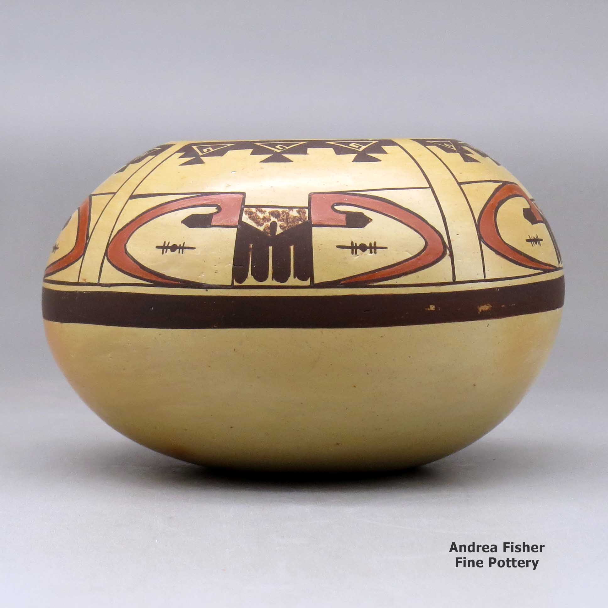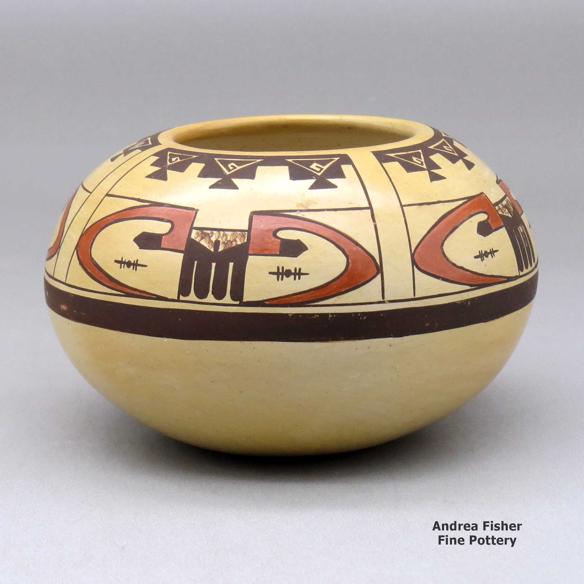 The above paragraph applies mostly to potters from the vicinity of First Mesa. The few potters from Second and Third Mesas seem to derive their design palettes from farther back in time, to the geometric designs, patterns and figures of the rock art prevalent before the advent of the katsinam, and the emergence of the Medicine, Sacred Clown and Warrior societies 800 years ago.