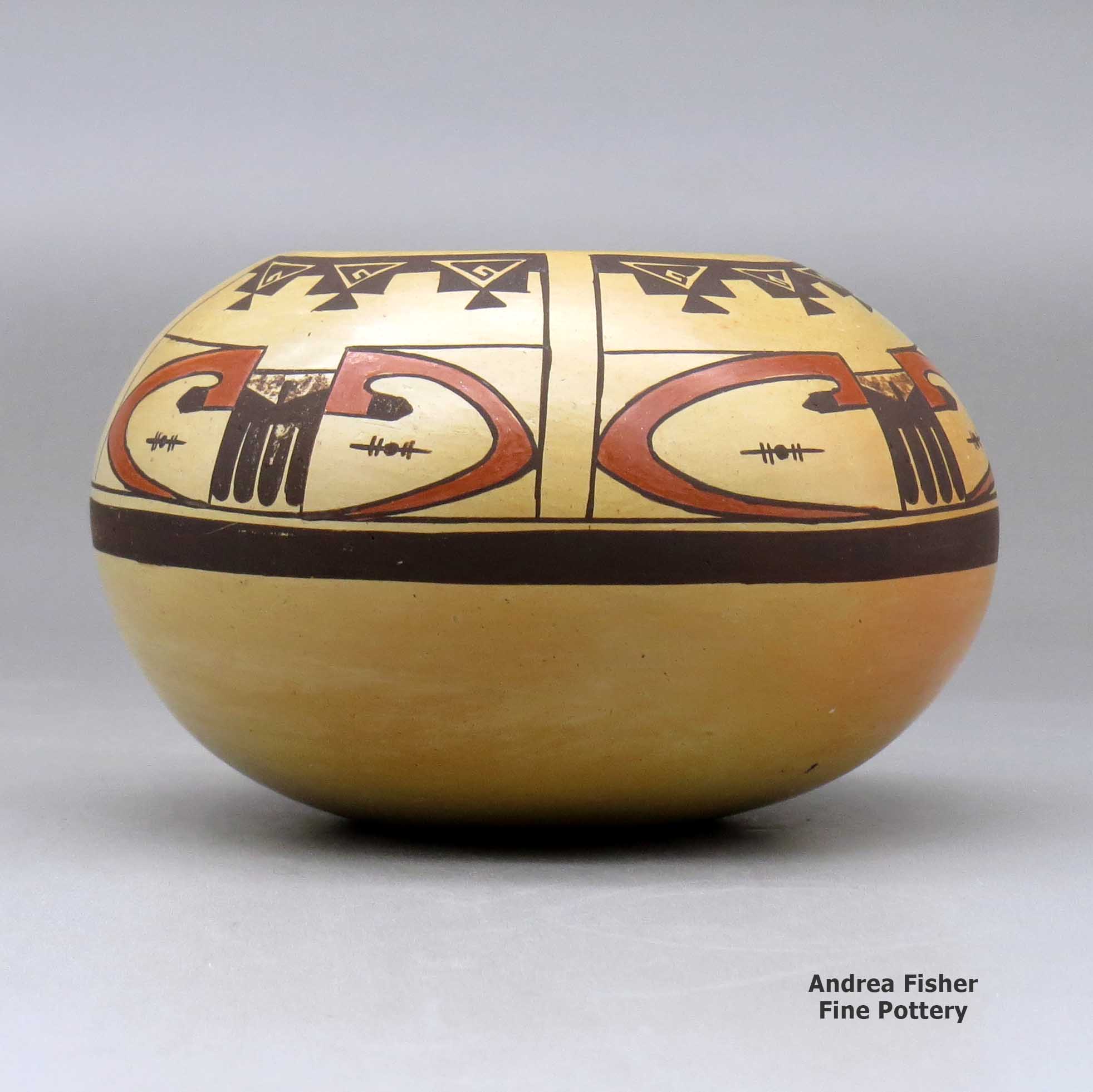 Much of the symbology painted on Hopi pottery is themed with "bird elements:" eagle and parrot tails, feathers, beaks and wings, and with katsinam (images of their gods) and permutations of migration patterns. Many Hopi, Hopi-Tewa and Tewa potters are members of the Corn Clan and their annual religious cycle revolves around the seasons of corn. The vast majority of today's Hopi pottery shapes and the designs painted on them are obvious descendants of the work of potters who existed 200-and-more years ago.