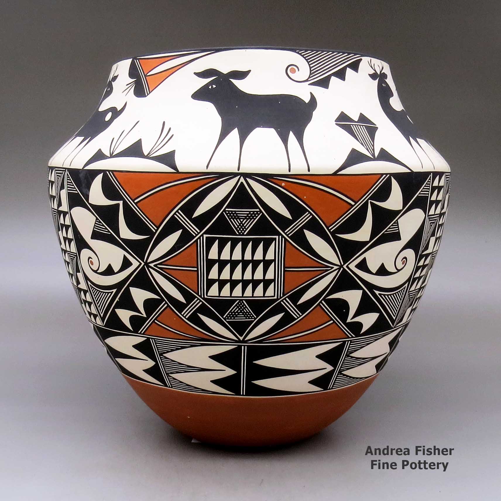 Historically, Acoma was known for large, thin-walled "ollas," jars used for storing food and water. With the arrival of the railroad and tourists in the 1880s, Acoma potters adapted the size, shapes and styles of their pots in order to appeal to the new buyers.