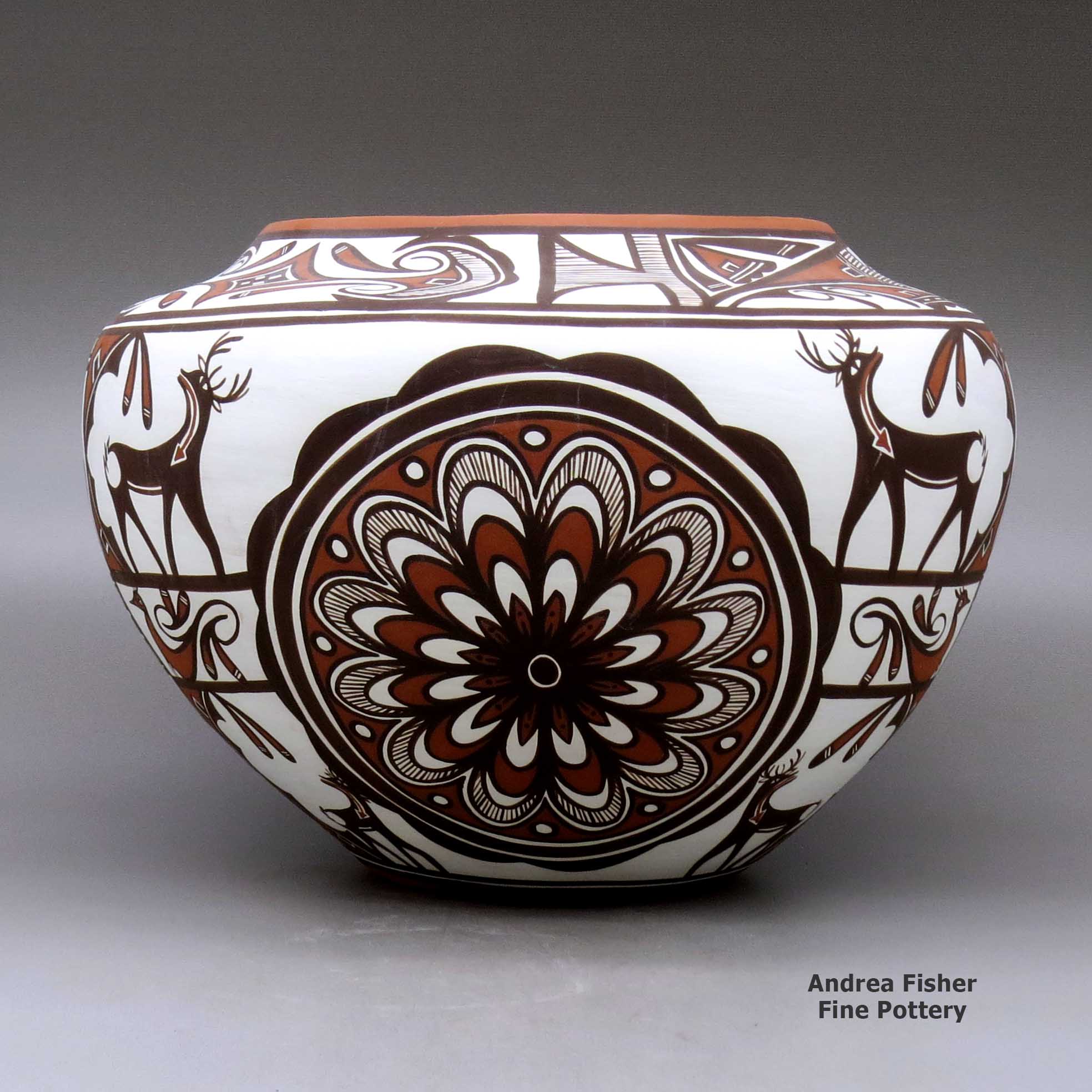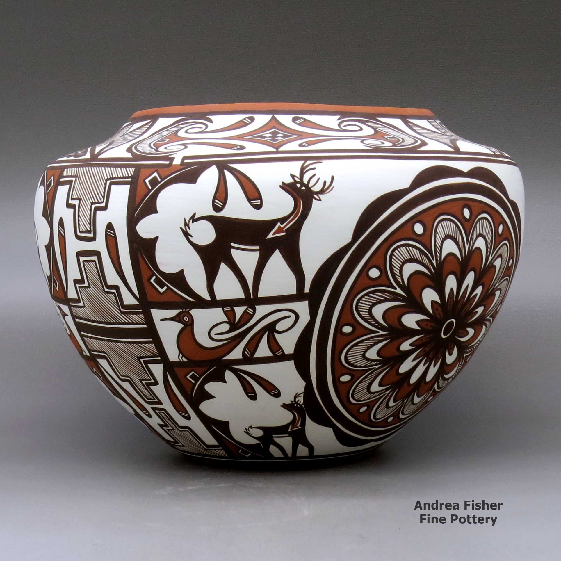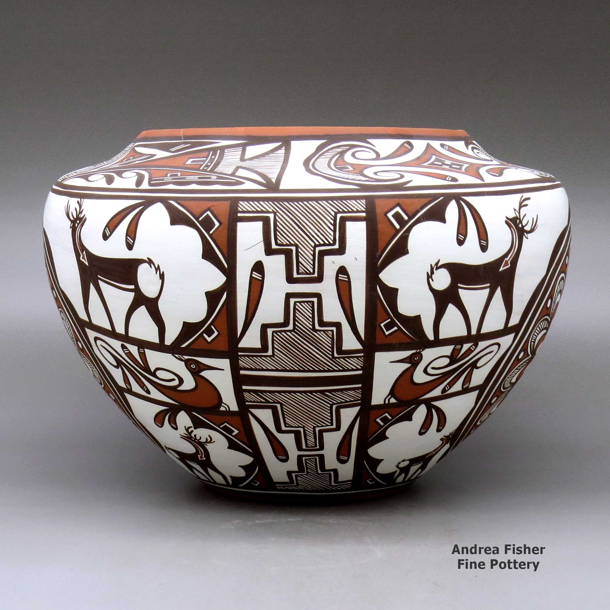 Since then Noreen has won many awards at venues like the Santa Fe Indian Market, the Gallup InterTribal Ceremonial and the Heard Museum Guild Indian Arts Fair & Market. She won Best of Division ribbons at the Heard Museum twice (2003 and 2005) for her miniatures. Noreen also makes polychrome white ware and orange ware cornmeal bowls, jars, seed pots, effigy pots, lizard bowls, figurines and miniatures. Her favorite designs include fineline, lizards, deer-in-his-house, tadpoles, salamanders, feathers, terraced clouds, rainbirds and carved village scenes.