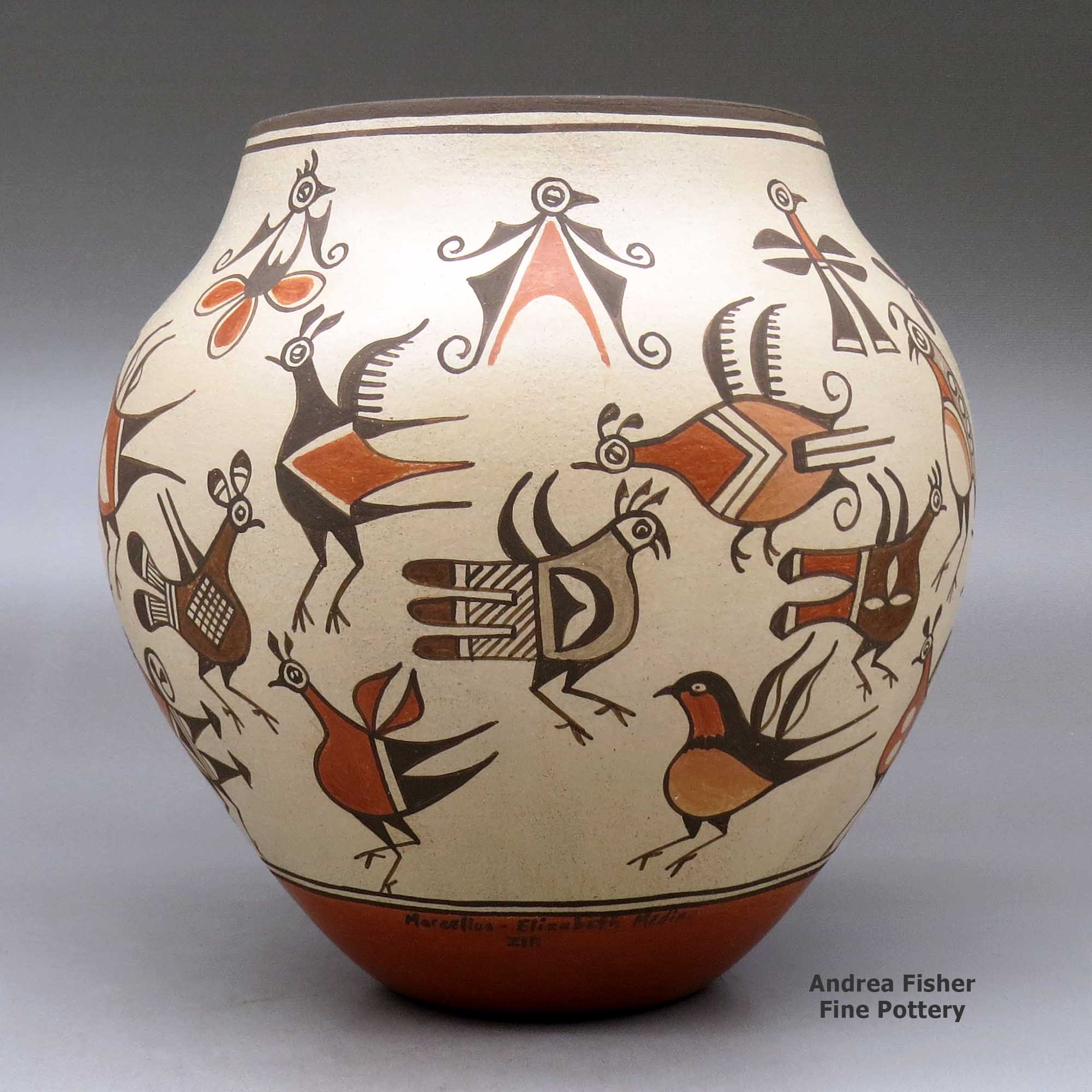 Elizabeth was born into the Toya family of Jemez Pueblo in 1956 and grew up surrounded by some of the finest Jemez Pueblo potters. She made Jemez-style pottery herself until she married Marcellus Medina of Zia Pueblo in 1978. Then she moved to Zia and received permission from the Zia elders to make pottery in the Zia style. She learned Zia styles from her mother-in-law, Sofia Medina. Because she has been at Zia Pueblo and has made pottery in the Zia style most of her adult life, she is referenced as a Zia potter. Today Elizabeth is probably the finest of all working Zia potters.