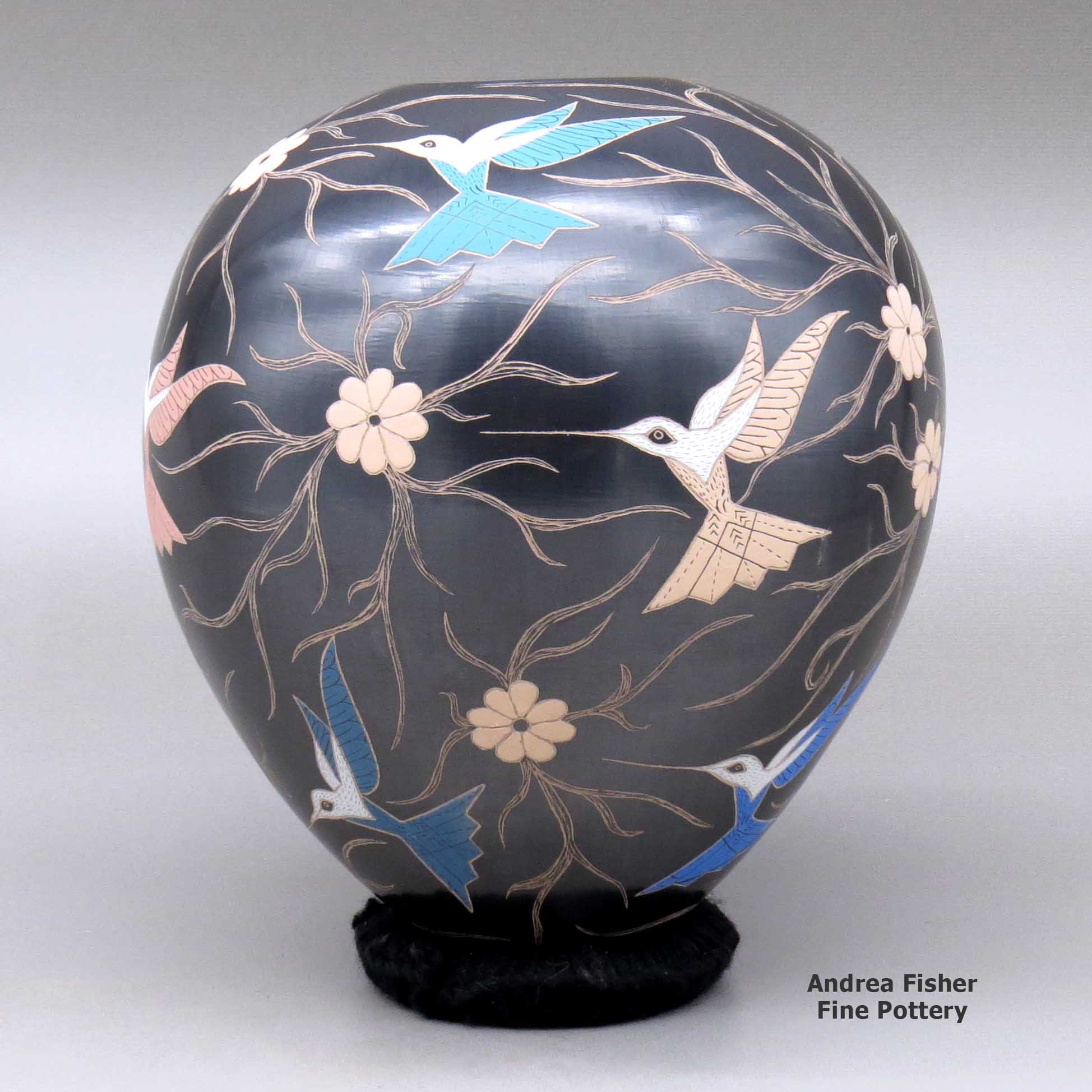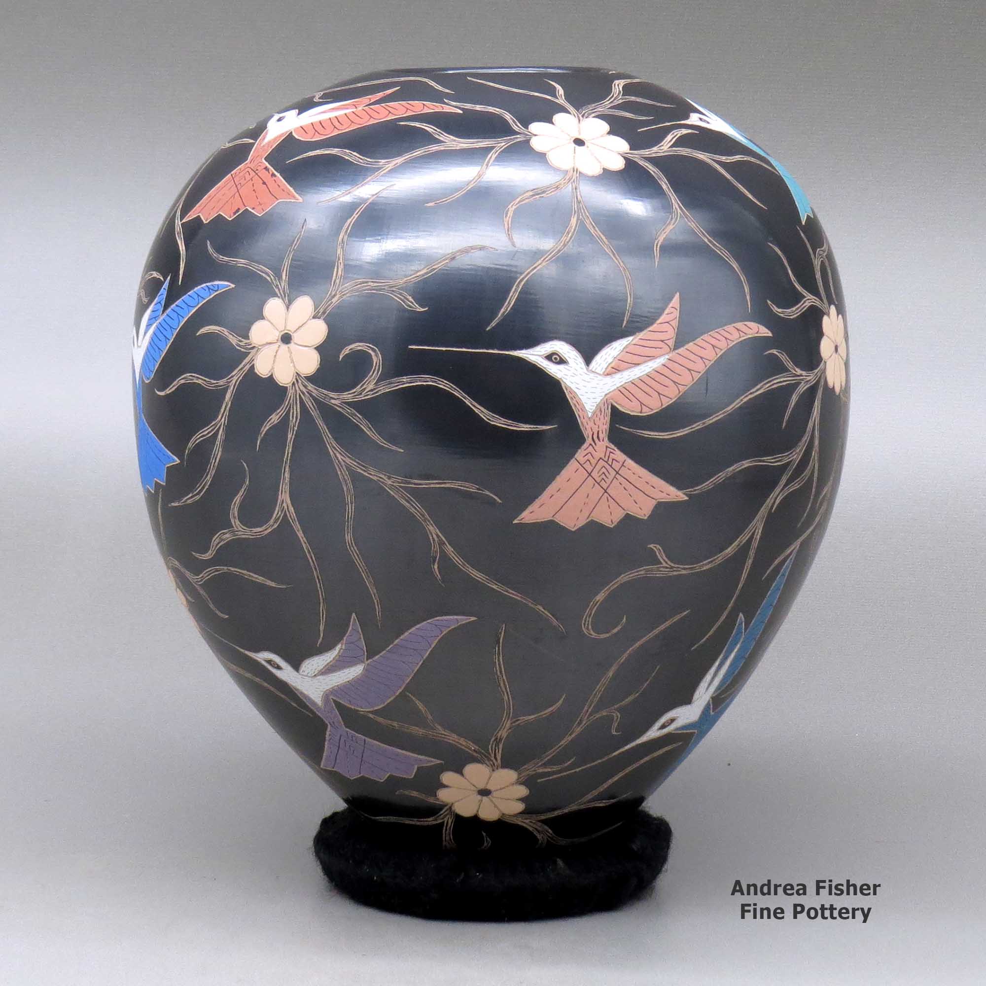 Elicena's designs usually incorporate birds or dragonflies and a tree branch or vine motif that covers the entire surface of the vessel. The base designs (tree branches, vines, flowers and bird outlines) are scratched into the vessel, then the birds and flowers are painted in.