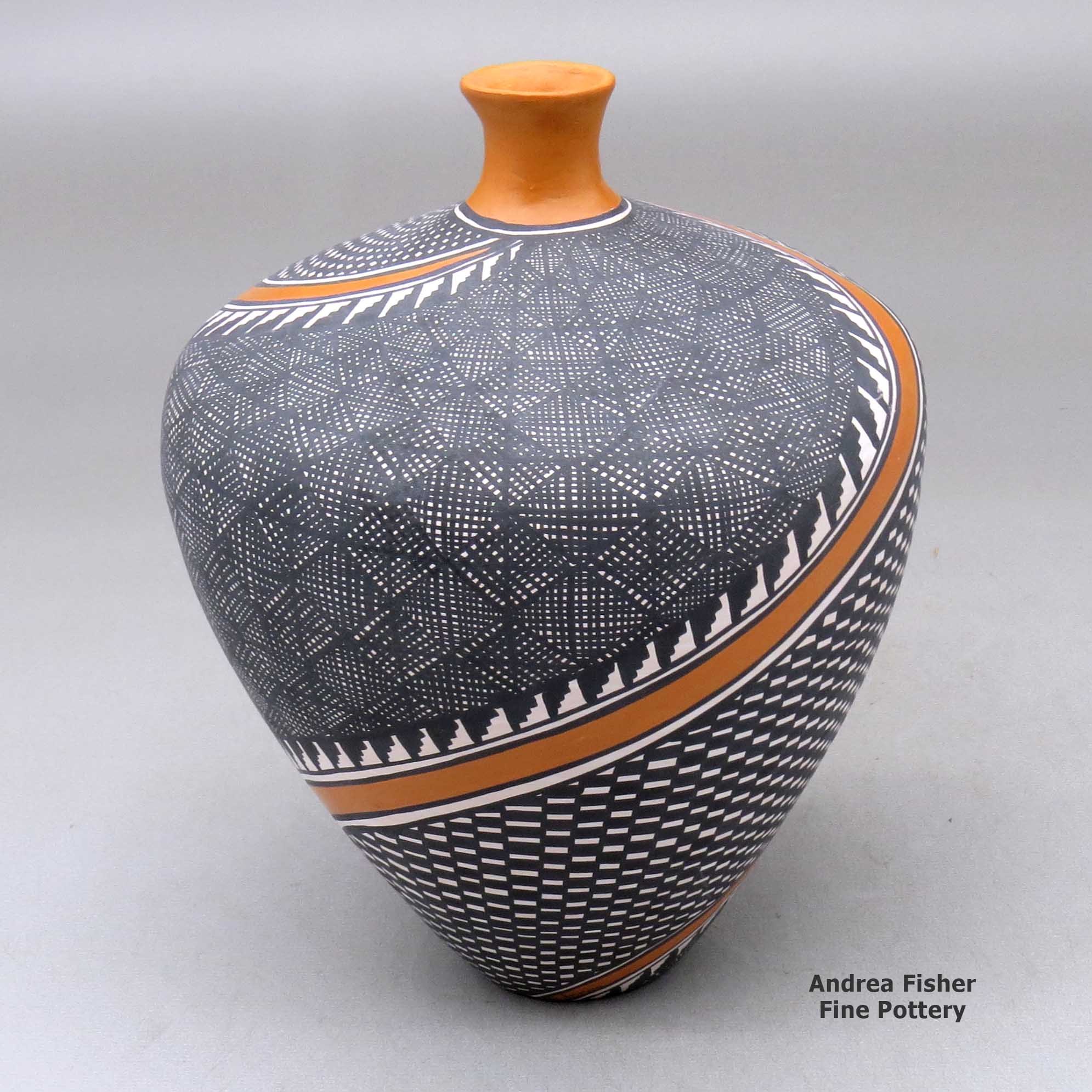 A member of the Acorn and Eagle Clans, Sandra Victorino was born to Pearl and David Leno of Acoma Pueblo in February, 1958. She grew up in a family of well-known potters and especially remembers watching her grandmother, Lita Garcia, making pottery. She says it was her aunt, Dorothy Torivio, who put her hands deep in Clay Mother and taught her most of what she knows of the traditional Acoma way to make and decorate pottery. She's been producing pottery for more than 40 years. She's also taught her son Cletus, Jr. to make pottery.