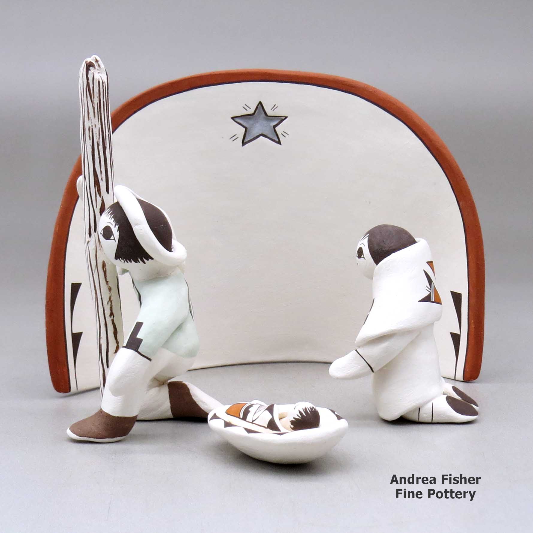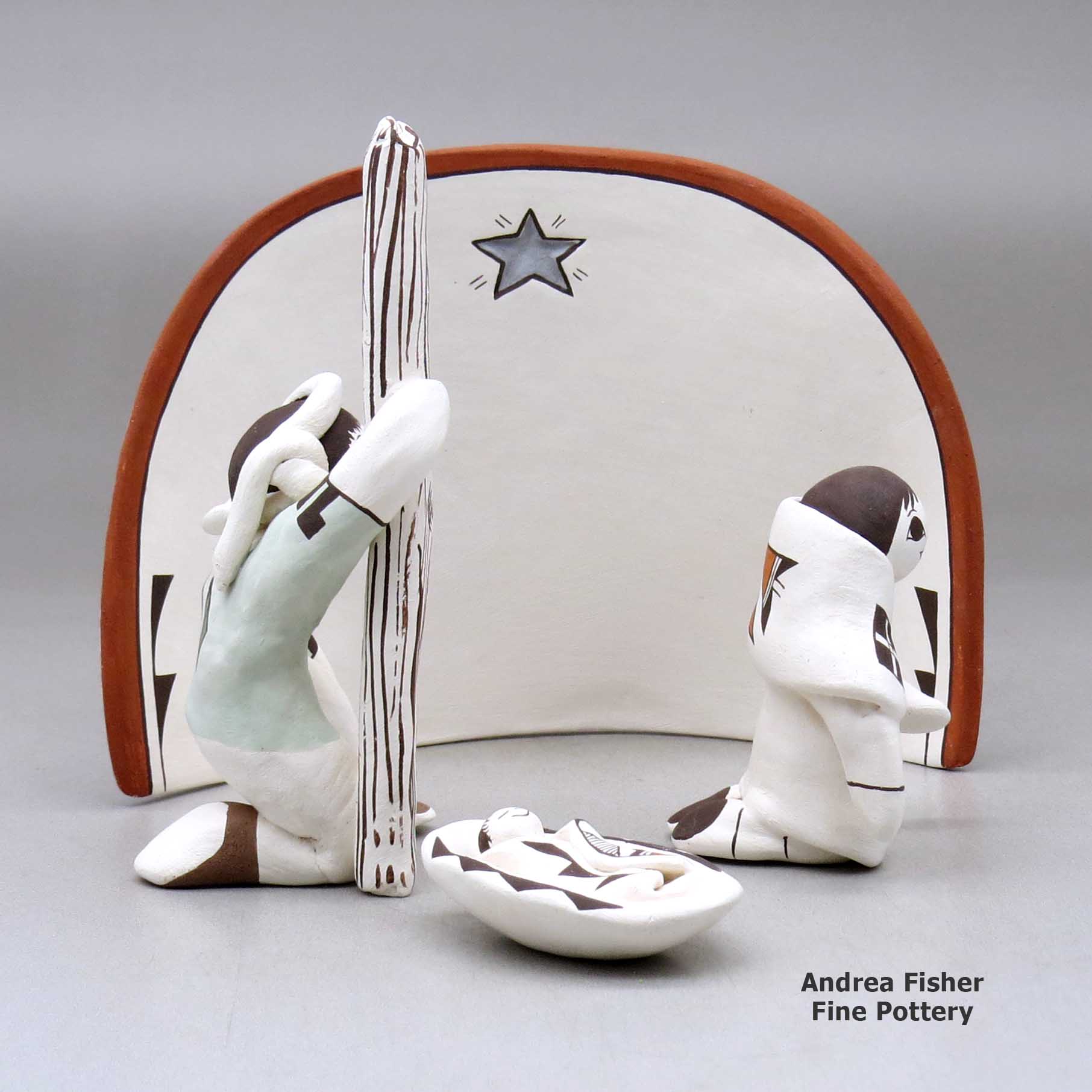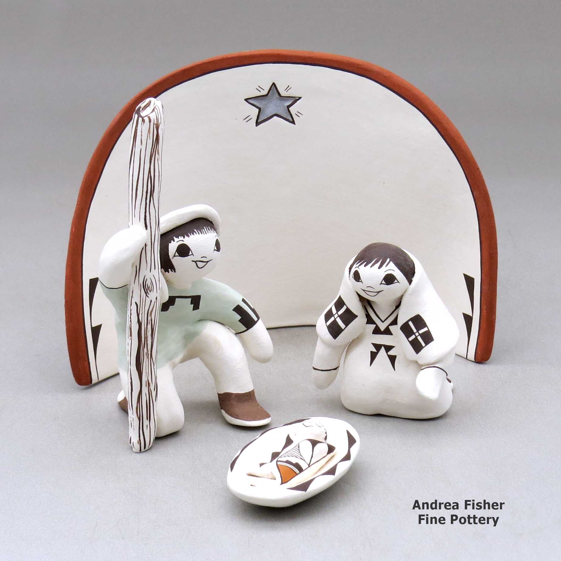 Judy's hand pinched and coiled contemporary shapes are accented with finely executed traditional designs and natural pigments. The natural clay of the Acoma area is very white, which gives her pieces a built-in radiance that is matched by her figures' sweet smiles.