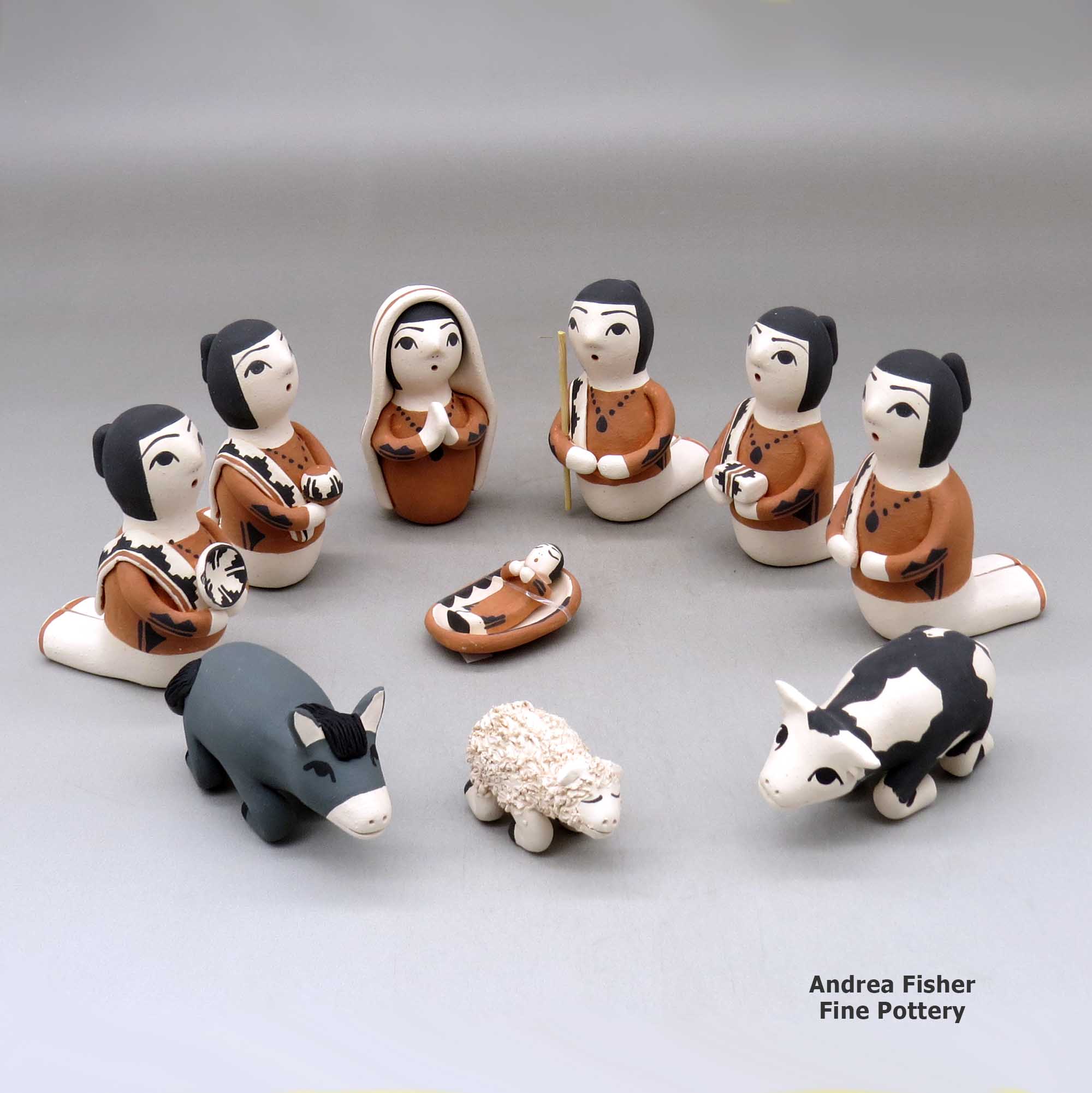Storytellers are usually grandparent figures with the figures of children attached to their bodies. The grandparents are pictured singing tribal songs and oral histories to their descendants. While this visual representation was first created at Cochiti Pueblo (a site in close geographical proximity to Jemez Pueblo) in the early 1960s by Helen Cordero, it speaks to the relationship between grandparents and grandchildren of every culture. Nativities, corn maidens, singing angels and many different animal forms are also popular among the potters of Jemez.