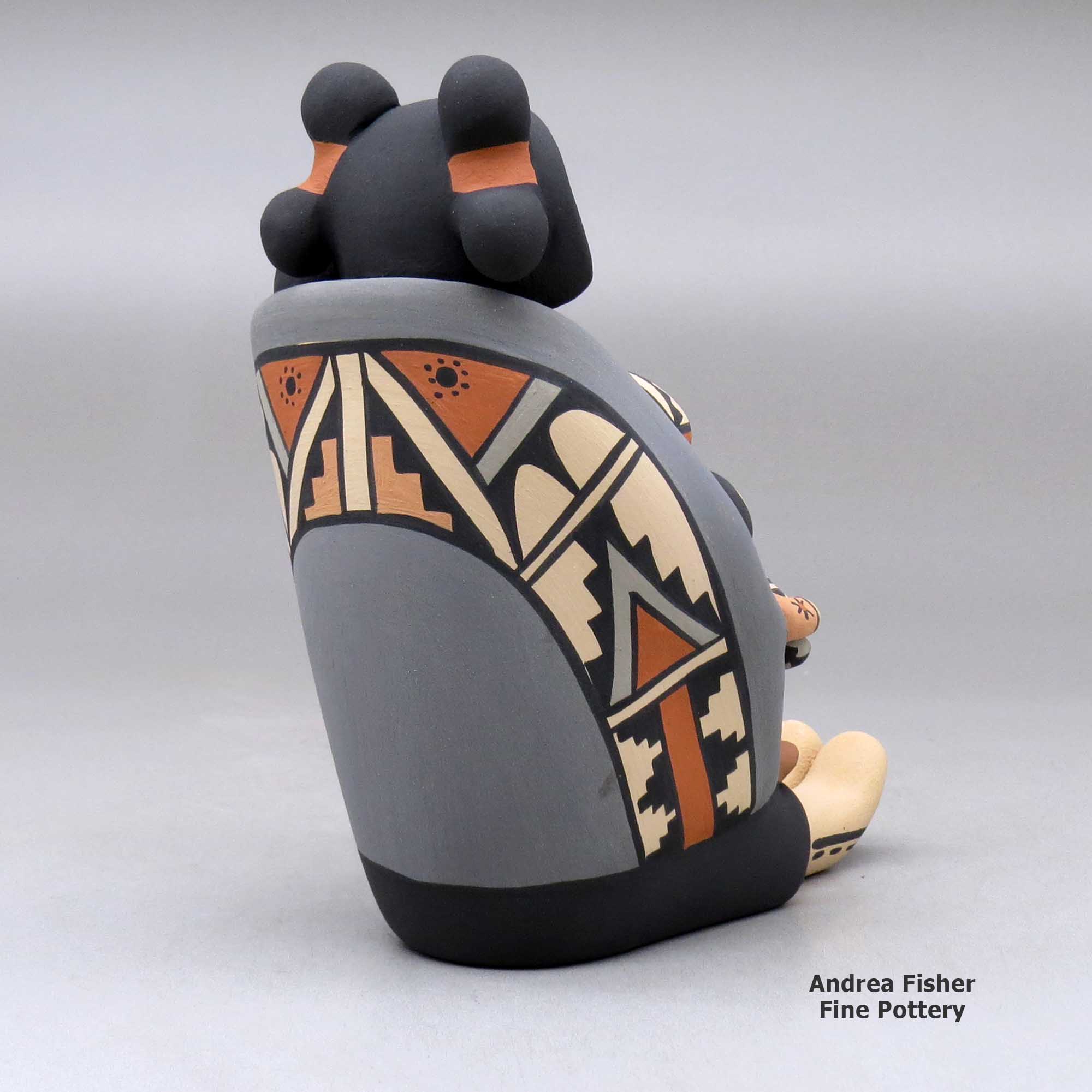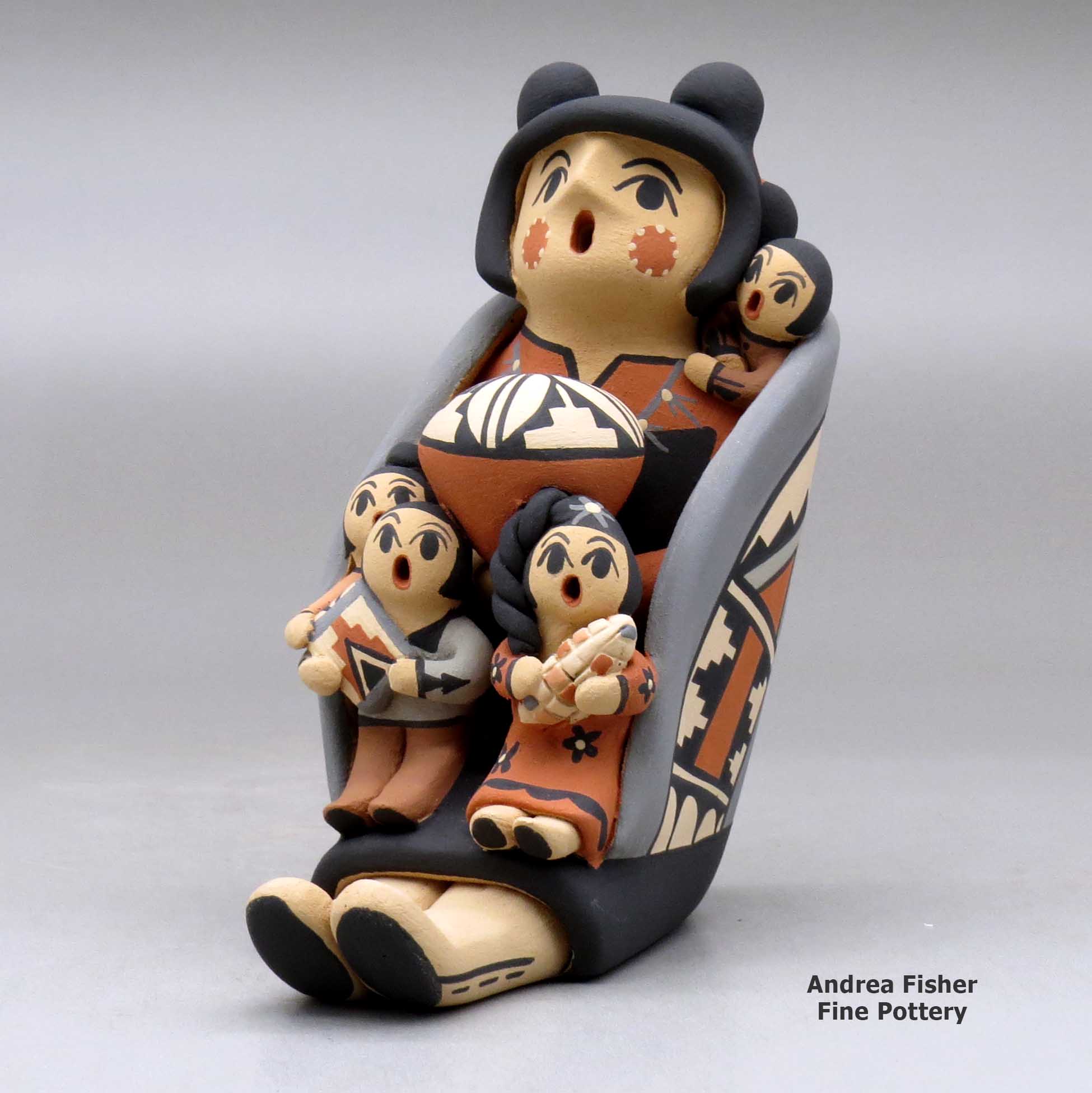 The first real storyteller figure was created in 1964 by Cochiti Pueblo potter Helen Cordero. She made it in memory of her grandfather, Santiago Quintana, and the stories he sang to her and other children in their native Keres when she was young. Helen's creation struck a chord throughout all the pueblos as the storyteller is a figure central to all their societies. Most tribes also have the figure of the Singing Maiden in their pantheon and in many cases, the mix of Singing Maiden and Storyteller has blurred some lines in the pottery world. Today, as many as three hundred potters in thirteen pueblos have created storytellers, and their storytellers are not only men and women but also Santa's, mudheads, koshares, bears, owls and other animals, sometimes encumbered with children numbering more than one hundred! Each potter has also customized their storyteller figures to more closely reflect the forms, dress and decorations of their own tribes, often even of their own clans.