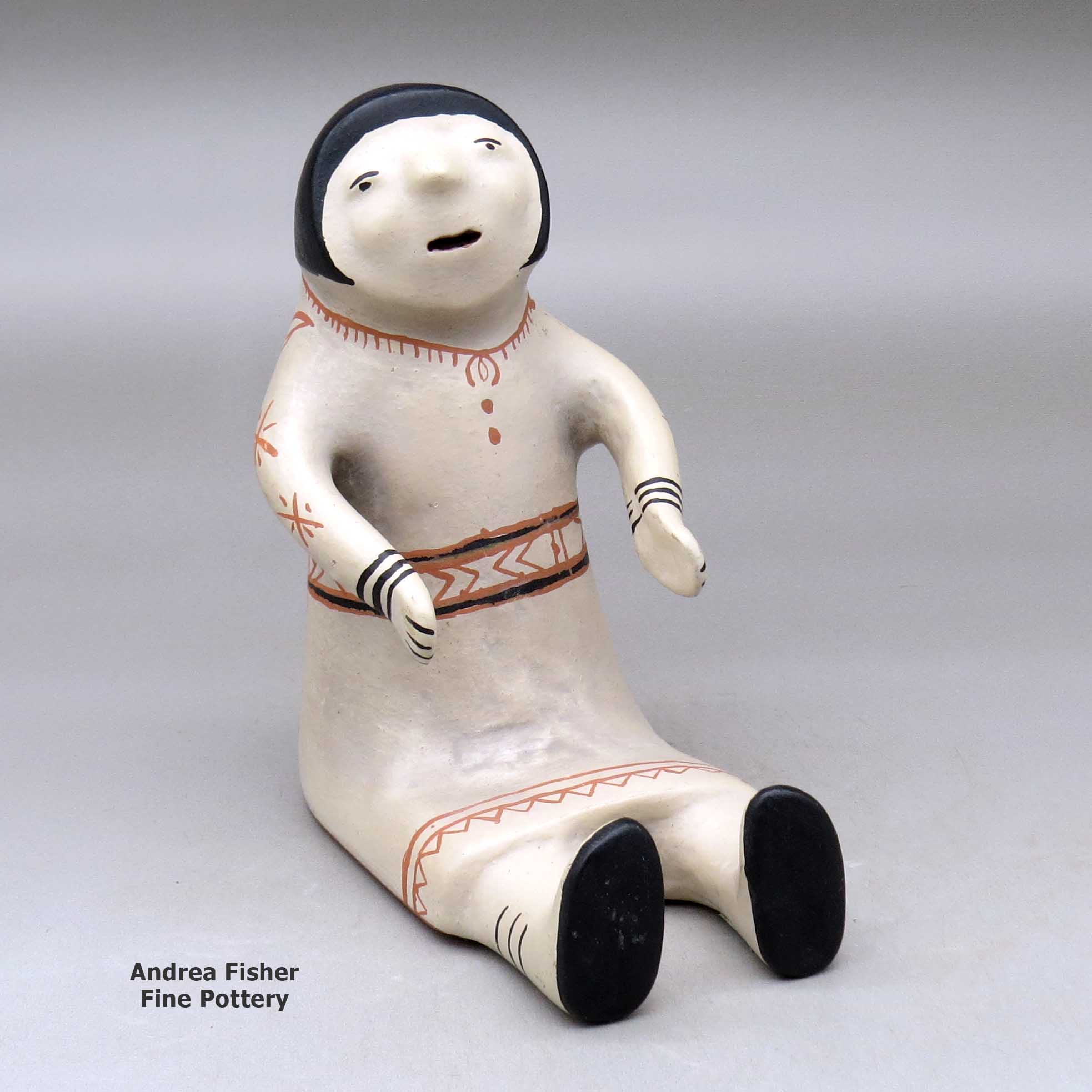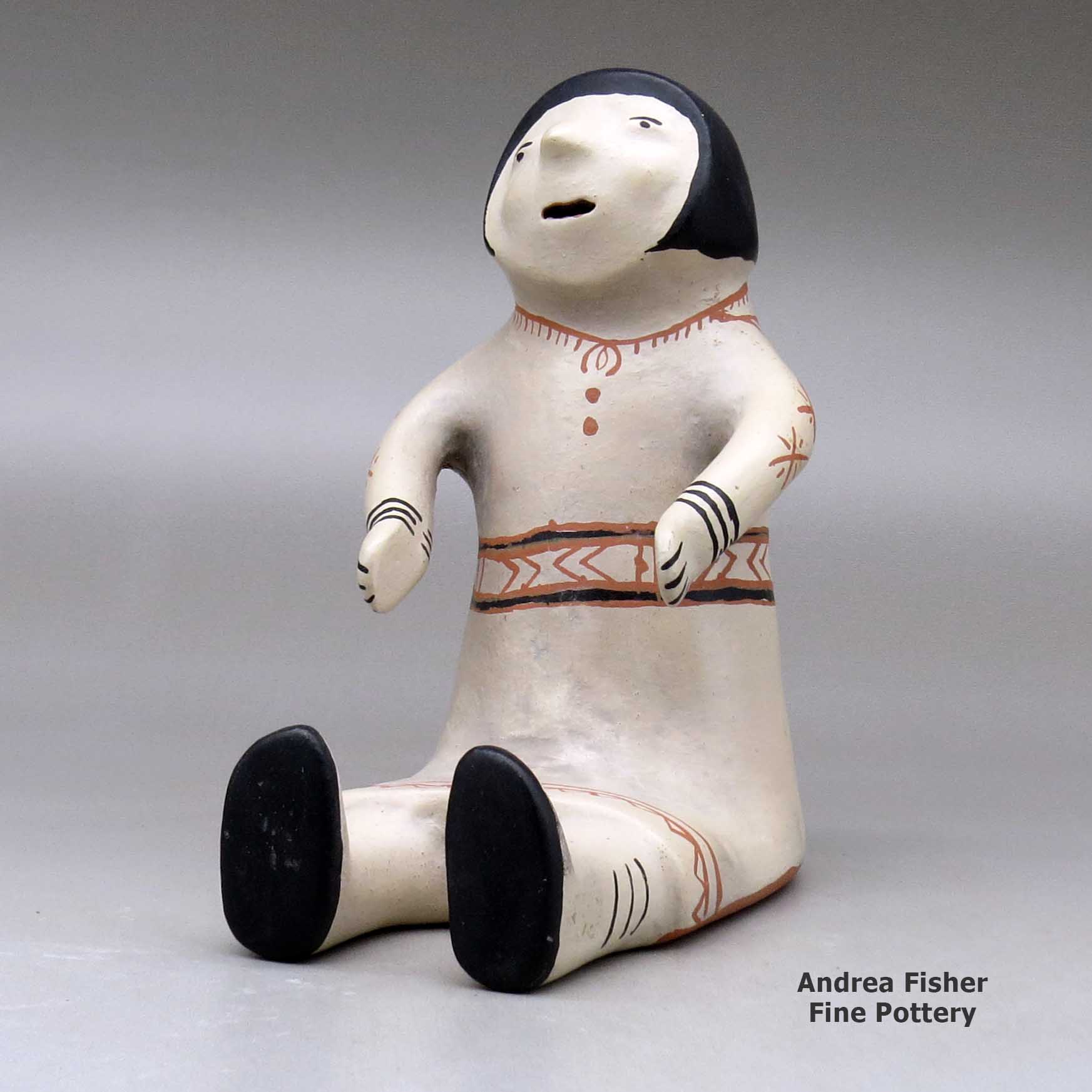 A few modern potters make traditional styled pots with black and red flowers, animals, clouds, lightning and geometric designs but most Cochiti pottery artists now create figurines. Most notable is the storyteller, a grandfather or grandmother figure with "babies" perched on it. Helen Cordero is credited with creating the first storyteller in 1964 to honor her grandfather. The storyteller style was quickly picked up by other pueblos and each modified the form to match their local situation (ie: clay colors and tribal and religious traditions). In some pueblos, storytellers are also now made as drummers and as a large variety of animals.