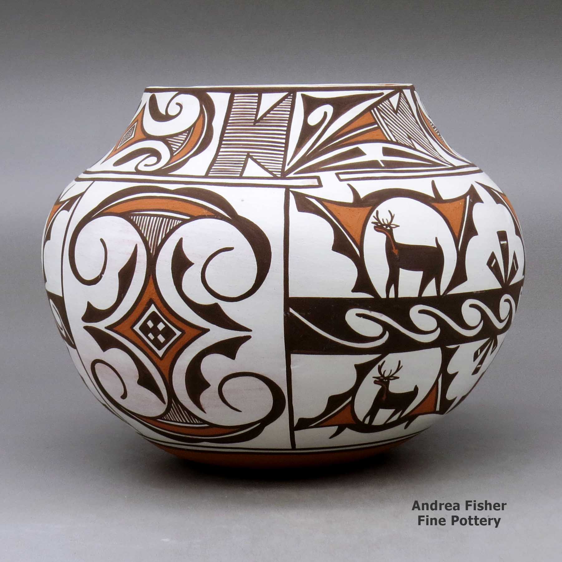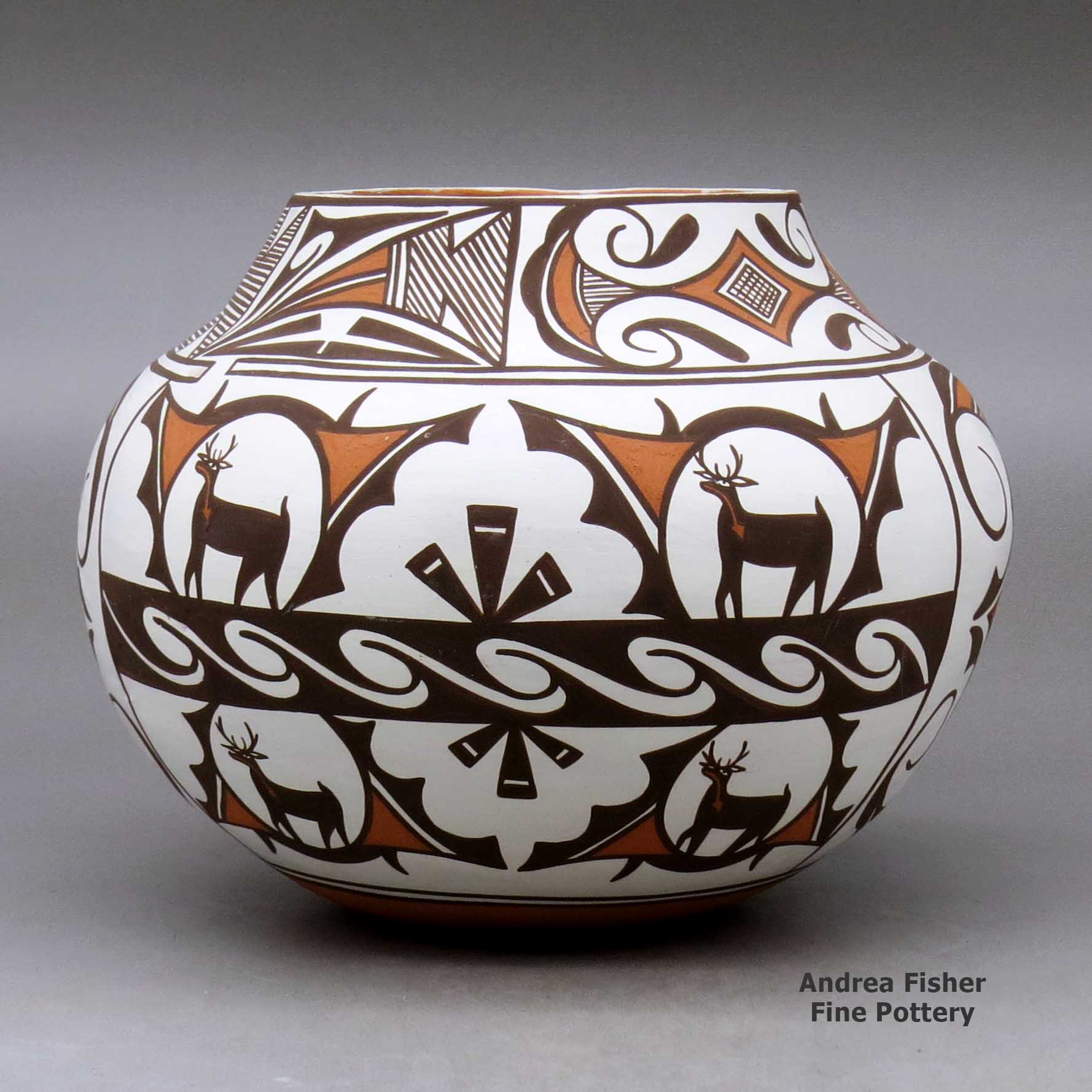 Since then Noreen has won many awards at venues like the Santa Fe Indian Market, the Gallup InterTribal Ceremonial and the Heard Museum Guild Indian Arts Fair & Market. She won Best of Division ribbons at the Heard Museum twice (2003 and 2005) for her miniatures. Noreen also makes polychrome white ware and orange ware cornmeal bowls, jars, seed pots, effigy pots, lizard bowls, figurines and miniatures. Her favorite designs include fineline, lizards, deer-in-his-house, tadpoles, salamanders, feathers, terraced clouds, rainbirds and carved village scenes.