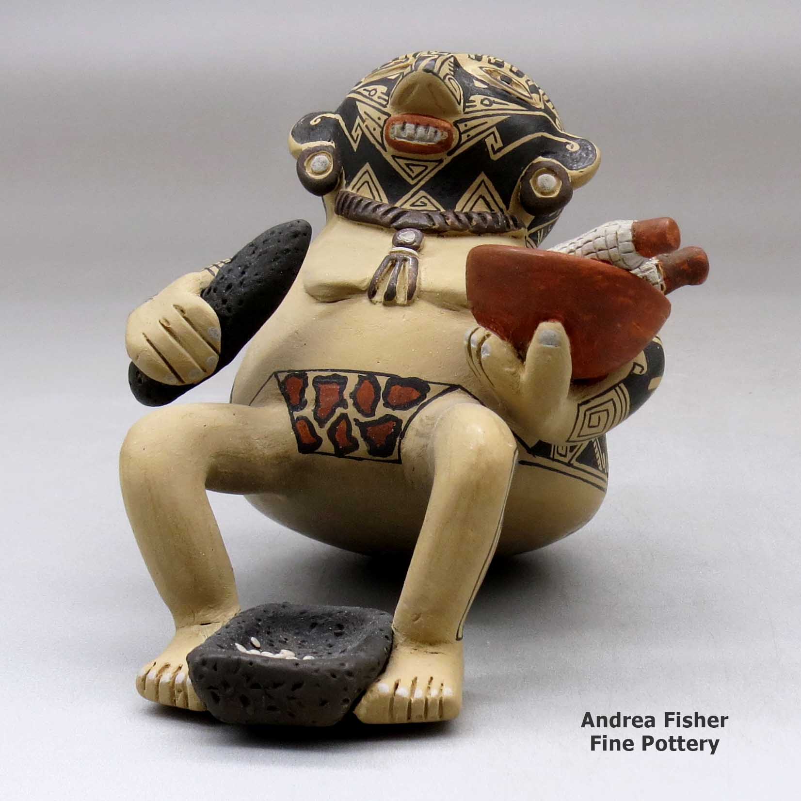 Early in his career, Manuel became well-known for his animal and human Paquimé figures. Then he moved to making medium-size storage jars and decorating them with complex geometric Escher-like designs that incorporate birds, fish and reptiles.