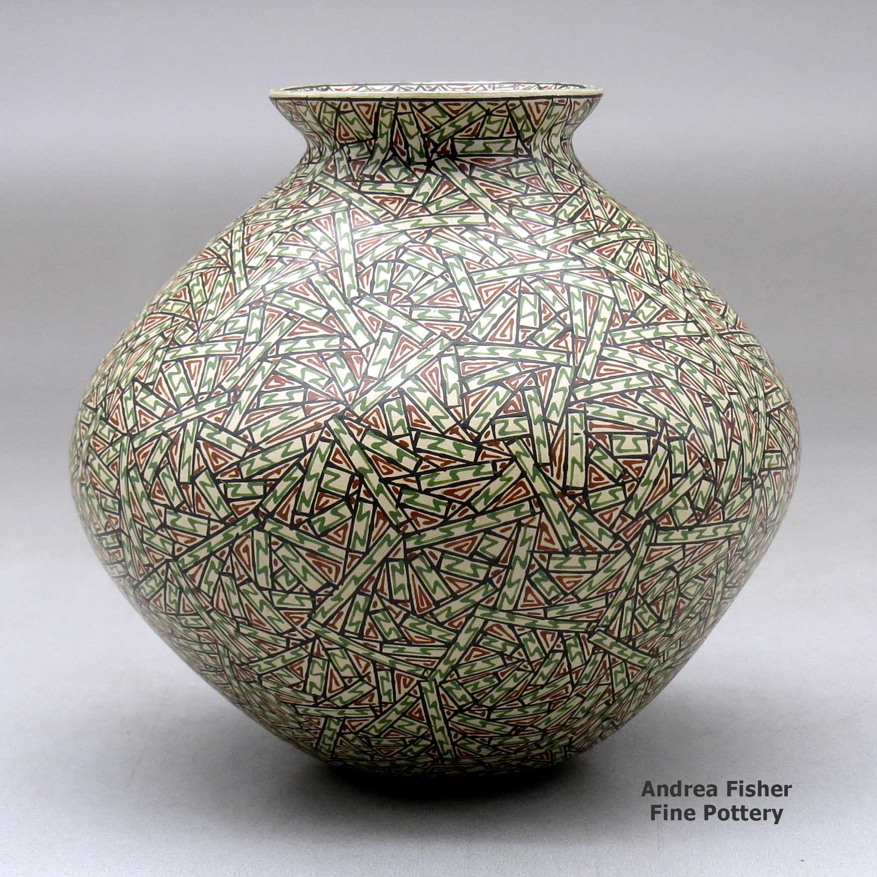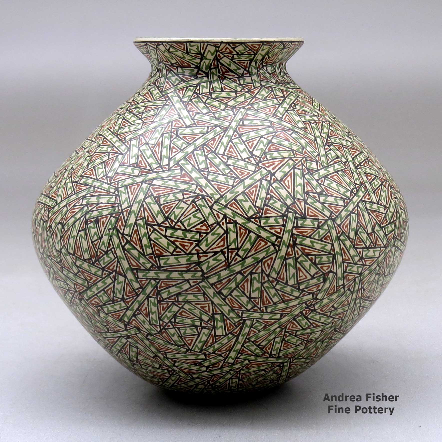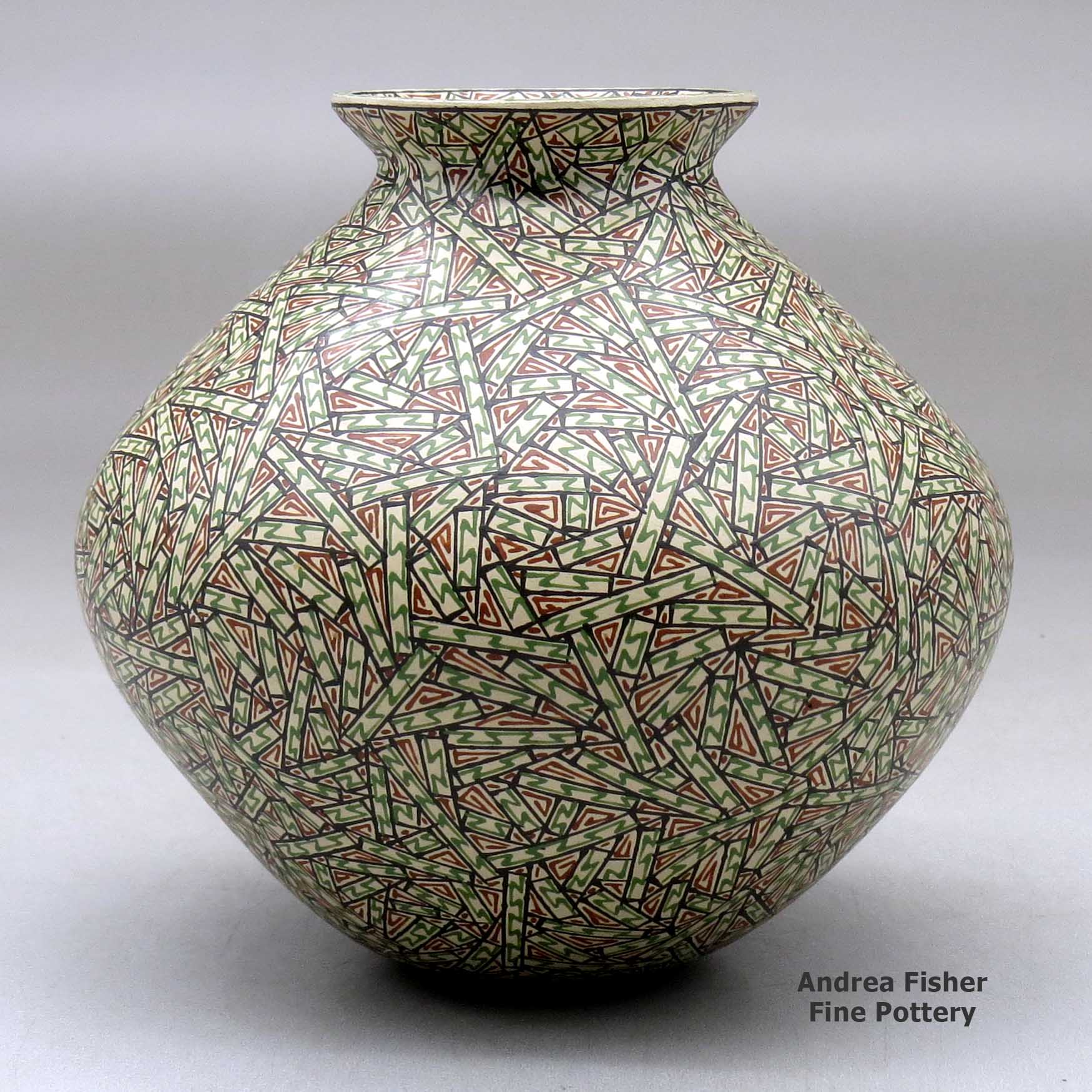 Elvira often collaborates with her husband, Jesus Manuel Pedregon, in the decorations on her pieces. He often begins by placing larger and more colorful bands of design around a piece. Then Elvira places her finer geometric designs onto the surface he hasn't painted. When done, only Elvira signs the pieces.