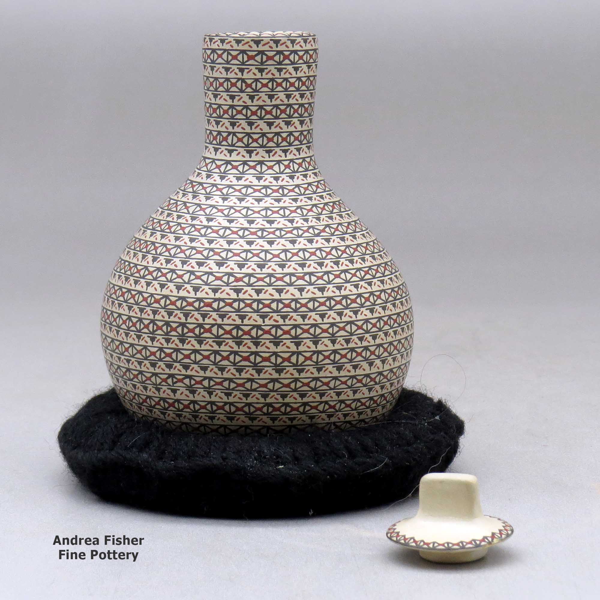 Karla mostly makes polychrome jars with sgraffito and painted bird, butterfly, branch, leaf and flower designs. In 2020 she won the People's Choice Award at the annual Concurso Ceramica de Mata Ortiz.