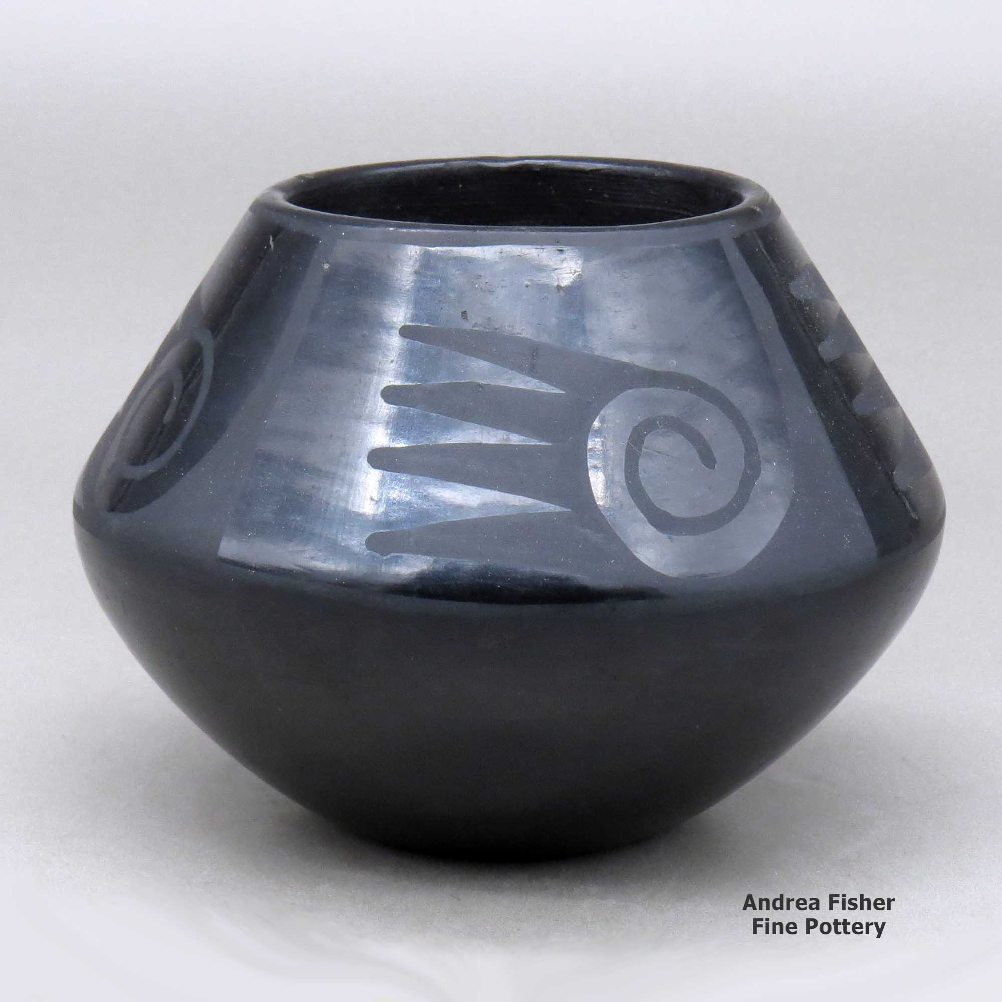 Contrary to legend implying that Maria "discovered" the black pottery process, Dr. Edgar Lee Hewett, Professor of Archaeology at the University of New Mexico in Albuquerque and Director of the Museum of New Mexico in Santa Fe, found shards of prehistoric black pottery while excavating in the ruins at Bandelier National Monument in 1907-8. To preserve and showcase that ancient product, Hewett sought a skilled pueblo potter who could re-create that ancient pottery style for him. Everyone he asked referred him to Maria. Together they worked out a deal and he pre-ordered a series of black pots from her. That led to more than a decade of experimentation, until Maria and Julian were satisfied with their results in recreating that style of black ware. Their method required smothering the fire with manure during the firing process, effectively creating an "oxygen-reduction process" that turned the red pots black. Julian worked out the other half of the "black-on-black" process around 1918 when he began painting his designs "in the negative," using a matte black beeweed slip on the polished pot surface to create his decorations. Once fired, that demonstrated the technique that has become so famous today. Still, Maria wasn't really happy with those first black pots until Hewett came to visit with some friends and students of his. Those visitors bought virtually every pot Maria had on hand and they encouraged her to make more. Maria responded by refining her process and technique with the clay and the fire. Julian responded by refining his designs and decorations. Together they elevated their art to a level not approached anywhere else.