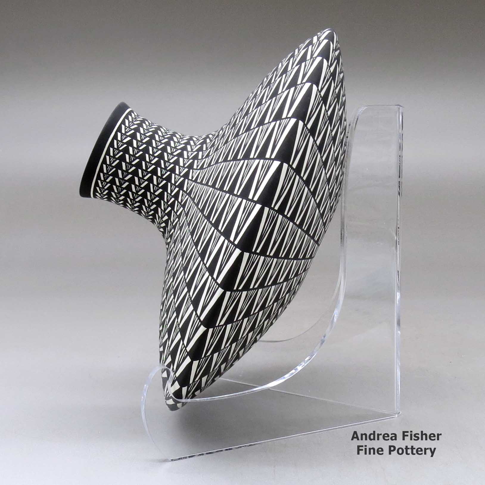 Born in 1967, Paula Estevan is from Acoma Pueblo. Making pottery since 1986, she learned traditional painting from her mother Patricia Estevan and pottery making from her great-grandmother, Mary Estevan Chino, with input from Mary Chino and Victoria Garcia. Then she took what they taught her and moved forward into water jars with extremely thin walls and black-and-white geometric designs rendered with laser-like precision.