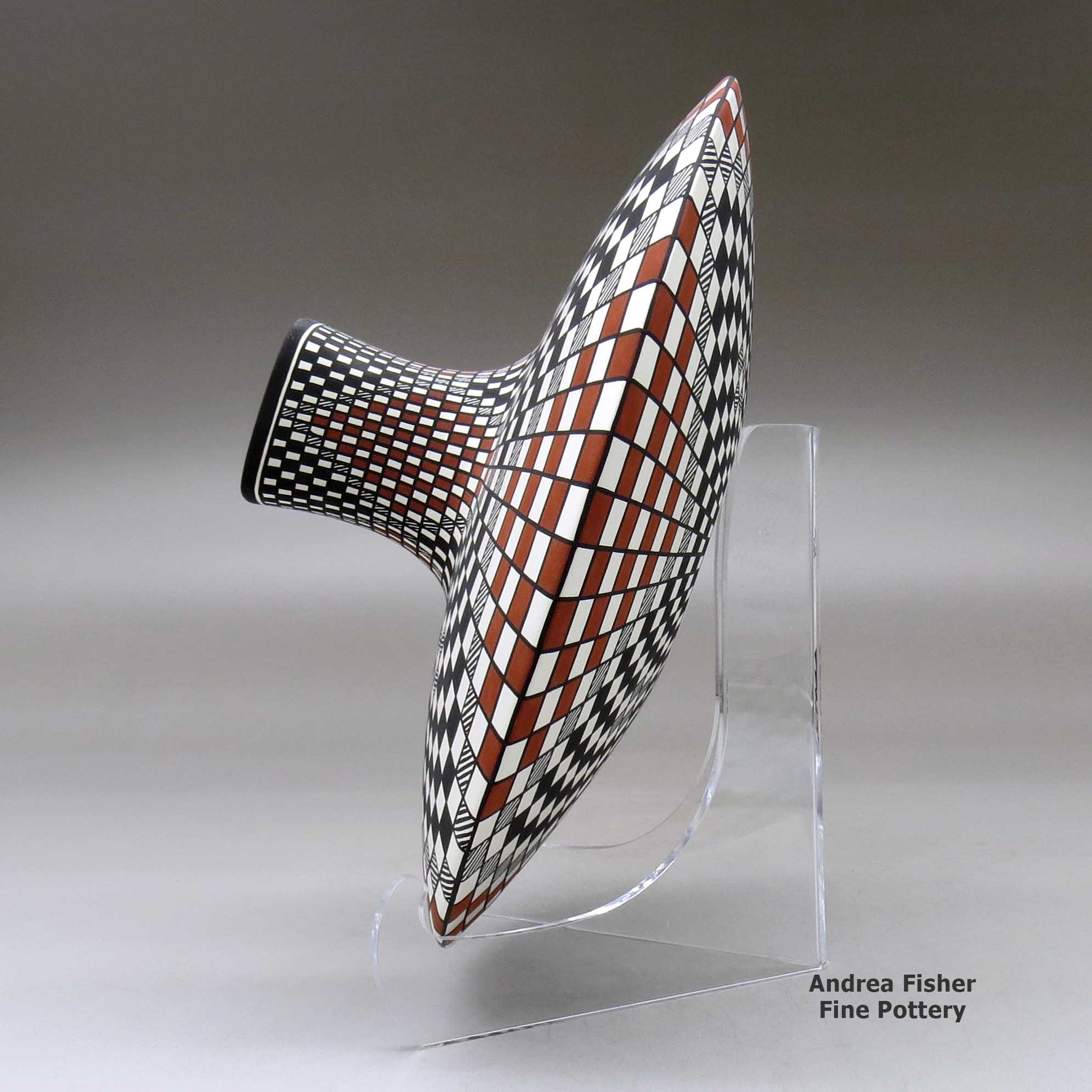 Born in 1967, Paula Estevan is from Acoma Pueblo. Making pottery since 1986, she learned traditional painting from her mother Patricia Estevan and pottery making from her great-grandmother, Mary Estevan Chino, with input from Mary Chino and Victoria Garcia. Then she took what they taught her and moved forward into water jars with extremely thin walls and black-and-white geometric designs rendered with laser-like precision.