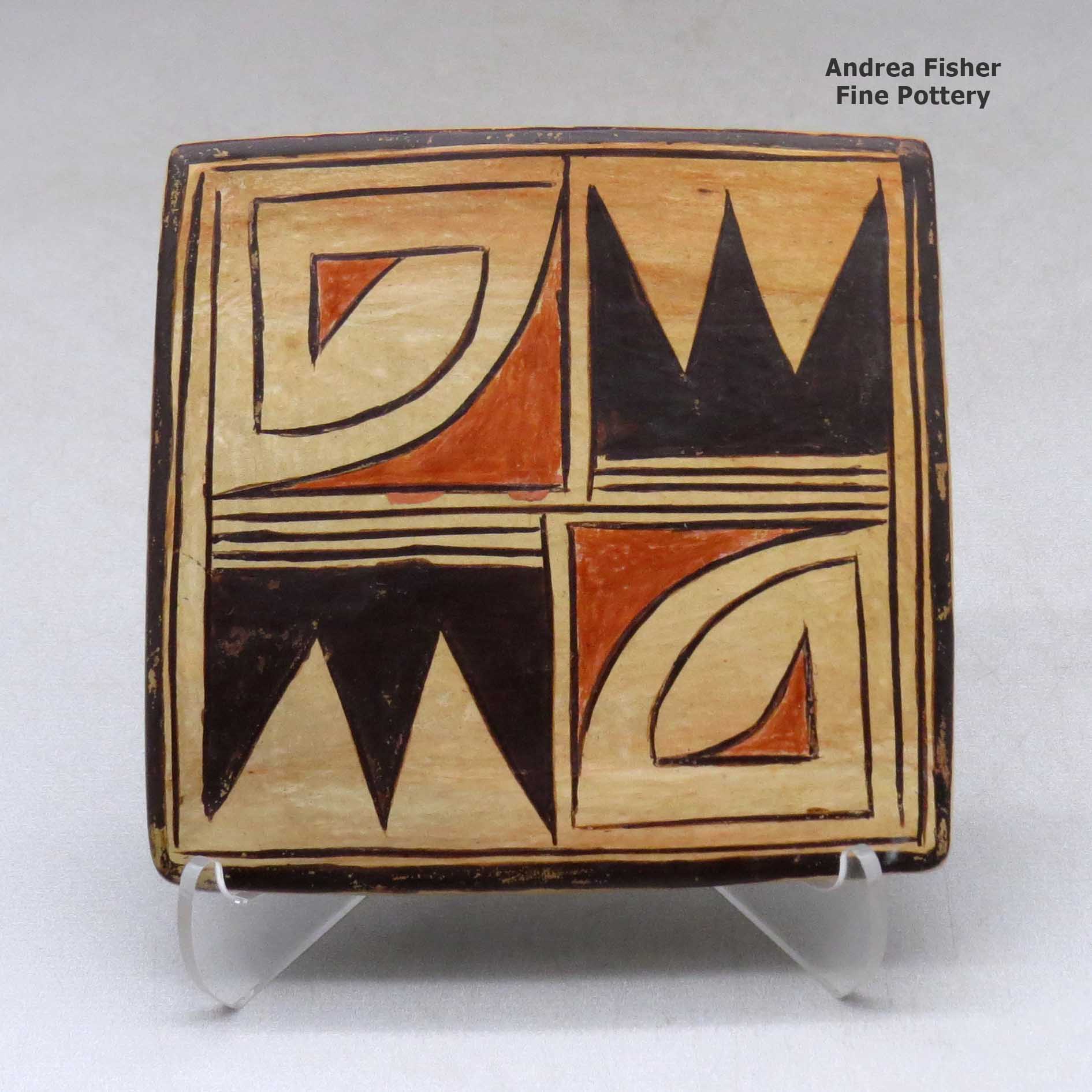 The above paragraph applies mostly to potters from the vicinity of First Mesa. The few potters from Second and Third Mesas seem to derive their design palettes from farther back in time, to the geometric designs, patterns and figures of the rock art prevalent before the advent of the katsinam, and the emergence of the Medicine, Sacred Clown and Warrior societies 800 years ago.
