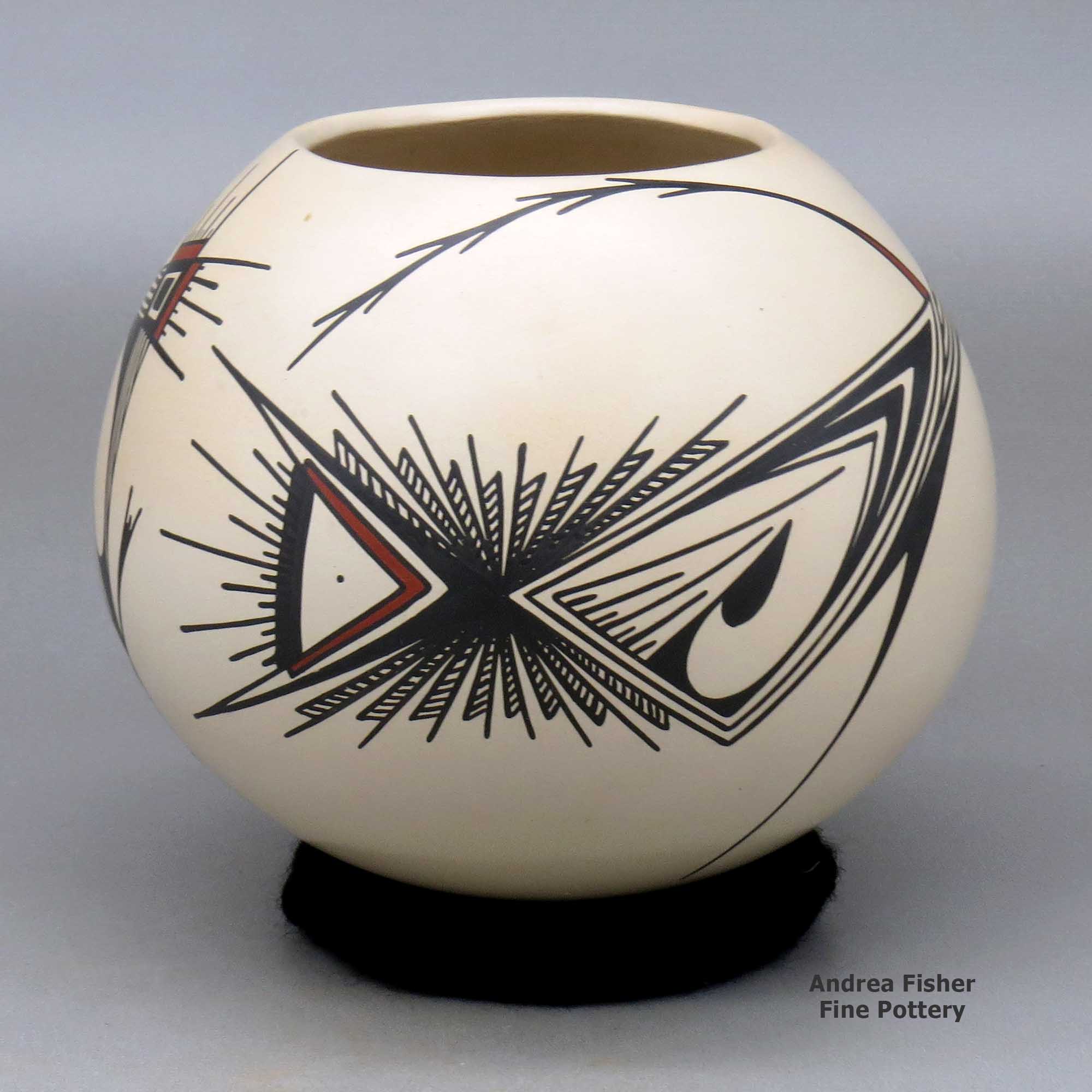Mata Ortiz is a small settlement inside the bounds of the Casas Grandes municipality very near the site of Paquimé. The fortunes of the town have gone up and down over the years with a real economic slump happening after the local railroad repair yard was relocated to Nuevo Casas Grandes in the early 1960's. The town was in steady decline until Juan Quezada, a poor farmer who gathered firewood in the area of the archaeological site, was inspired by fragments of ancient Paquimé pottery and even older fragments of Mimbres forms with bold black-on-white designs littering the ground to learn more.