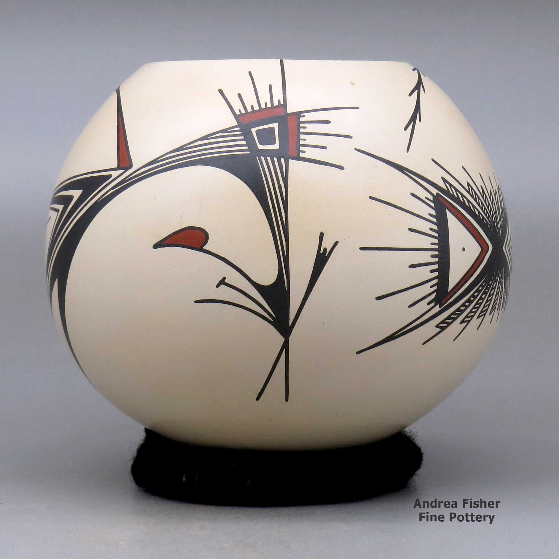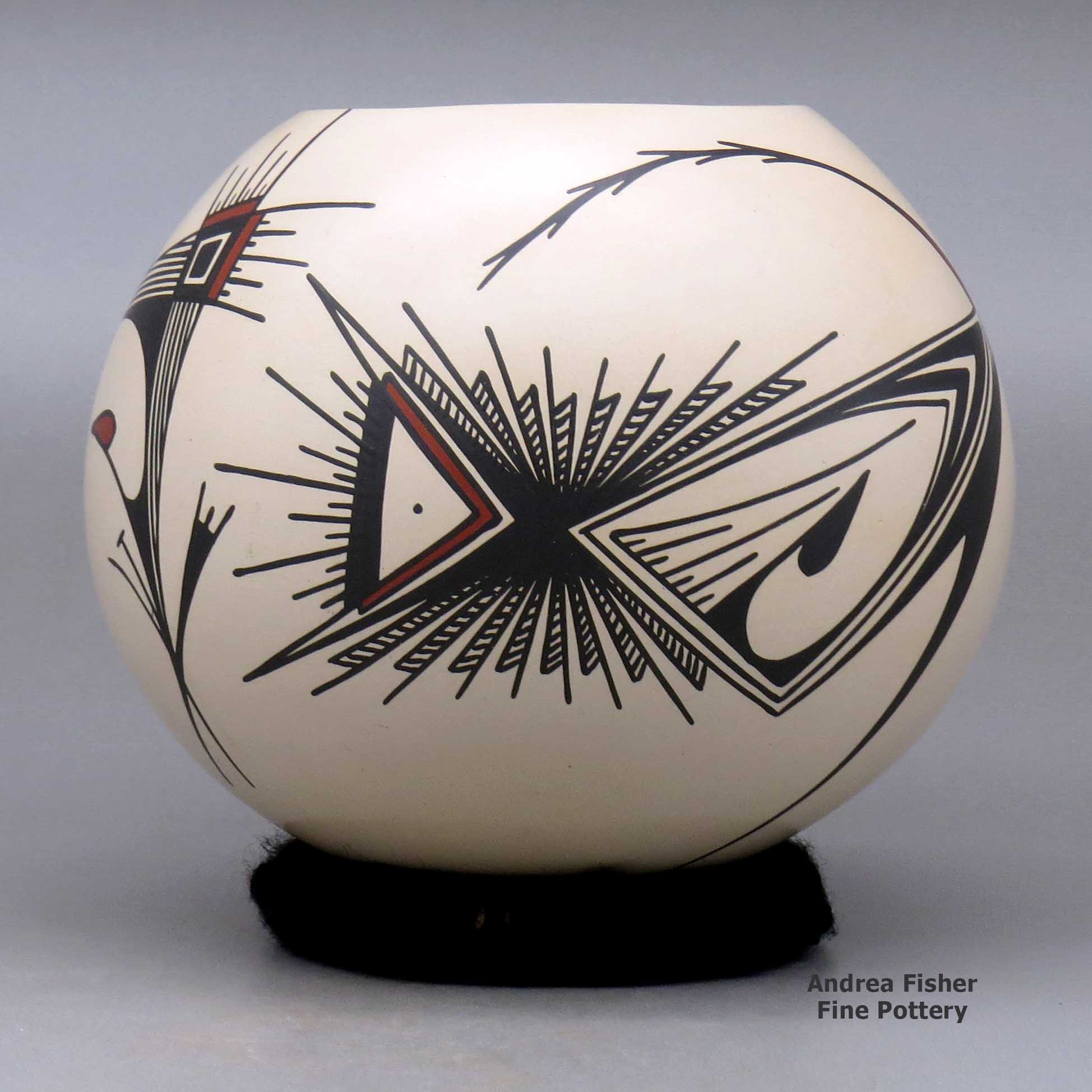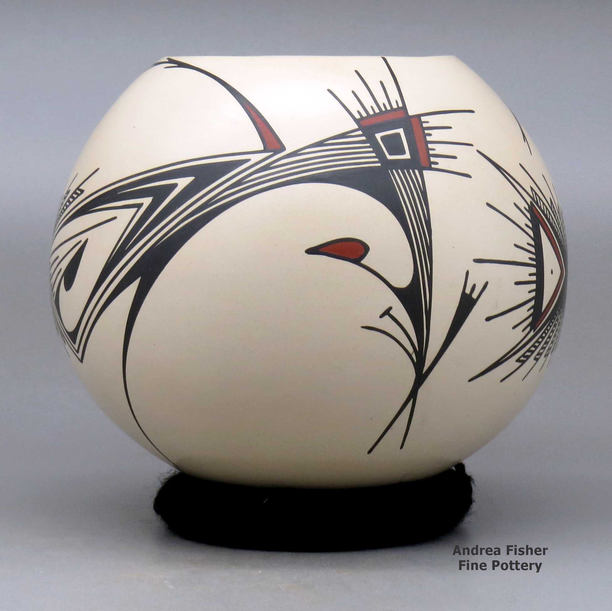 Working with different members of the Quezada family, Martha learned how to produce all different kinds of pottery including black-on-black, sgraffito and Quezada-style Paquimé Revival reproductions. At first, though, she struggled with the painting, said she had no patience for it. So Mauro painted her pots for the first few years, then she got more comfortable with it.