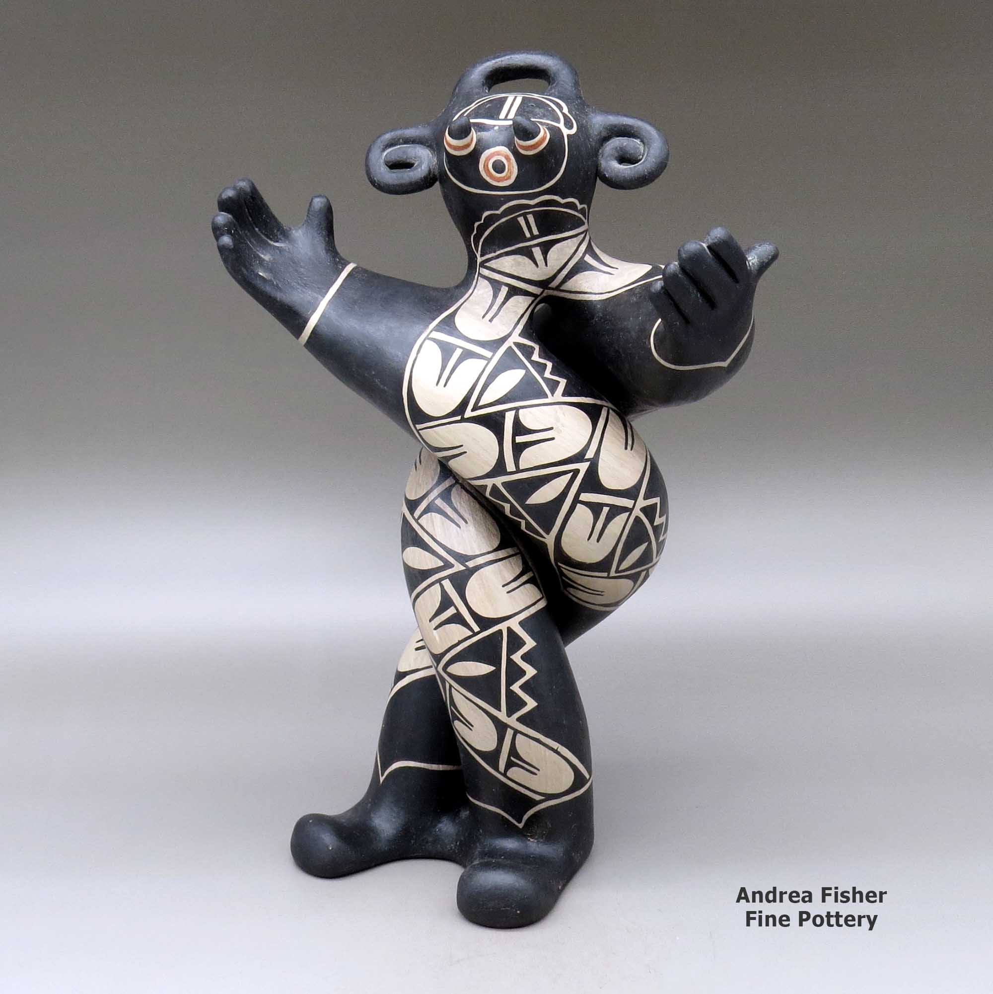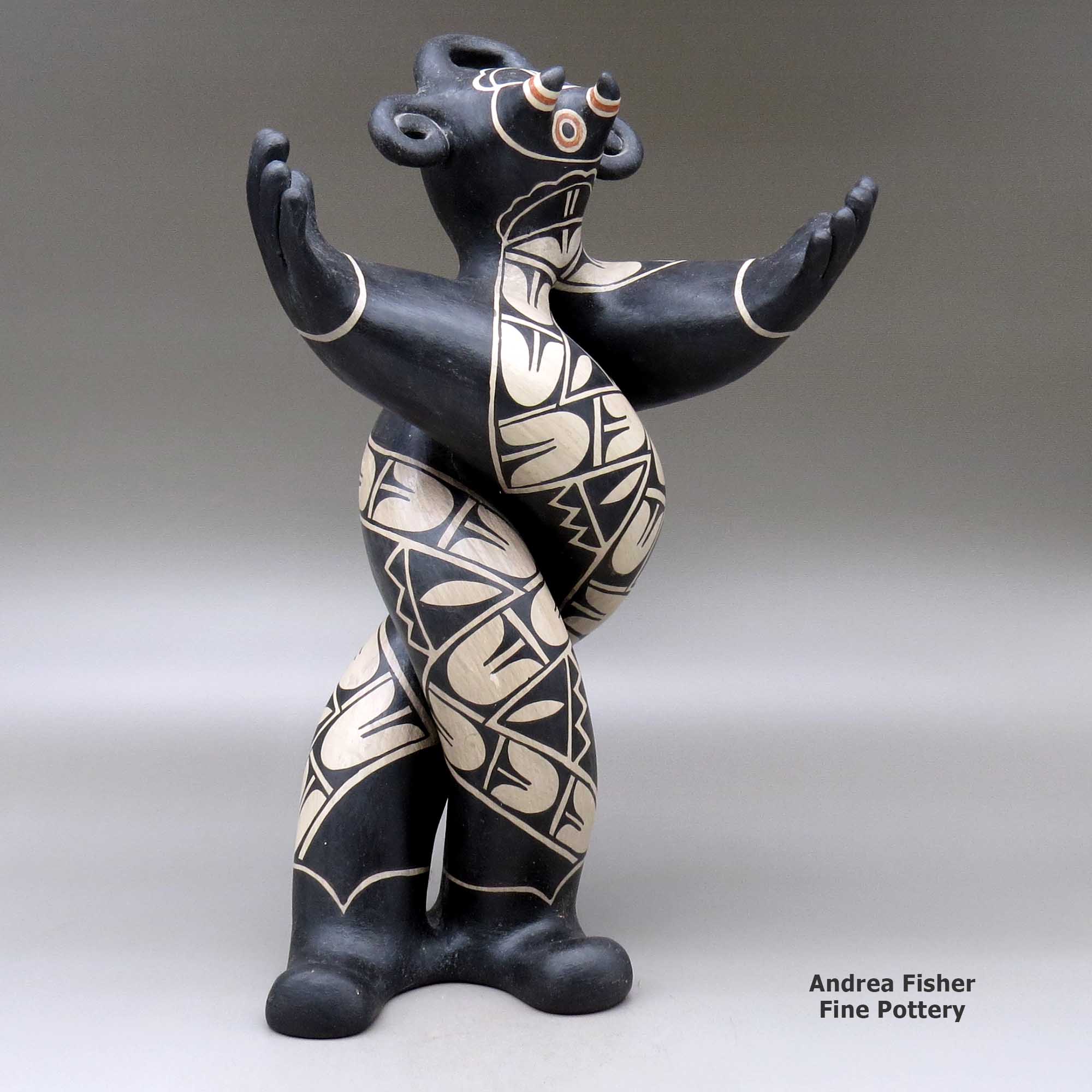 Born in 1976, Harlan Reano is from Santo Domingo Pueblo. He uses Lisa's elegant forms and figures as a three-dimensional "canvas" for his boldly painted designs that range from traditional geometrics to stylized graffiti patterns. Together, they complete the process by ground firing their innovative and dynamic creations.