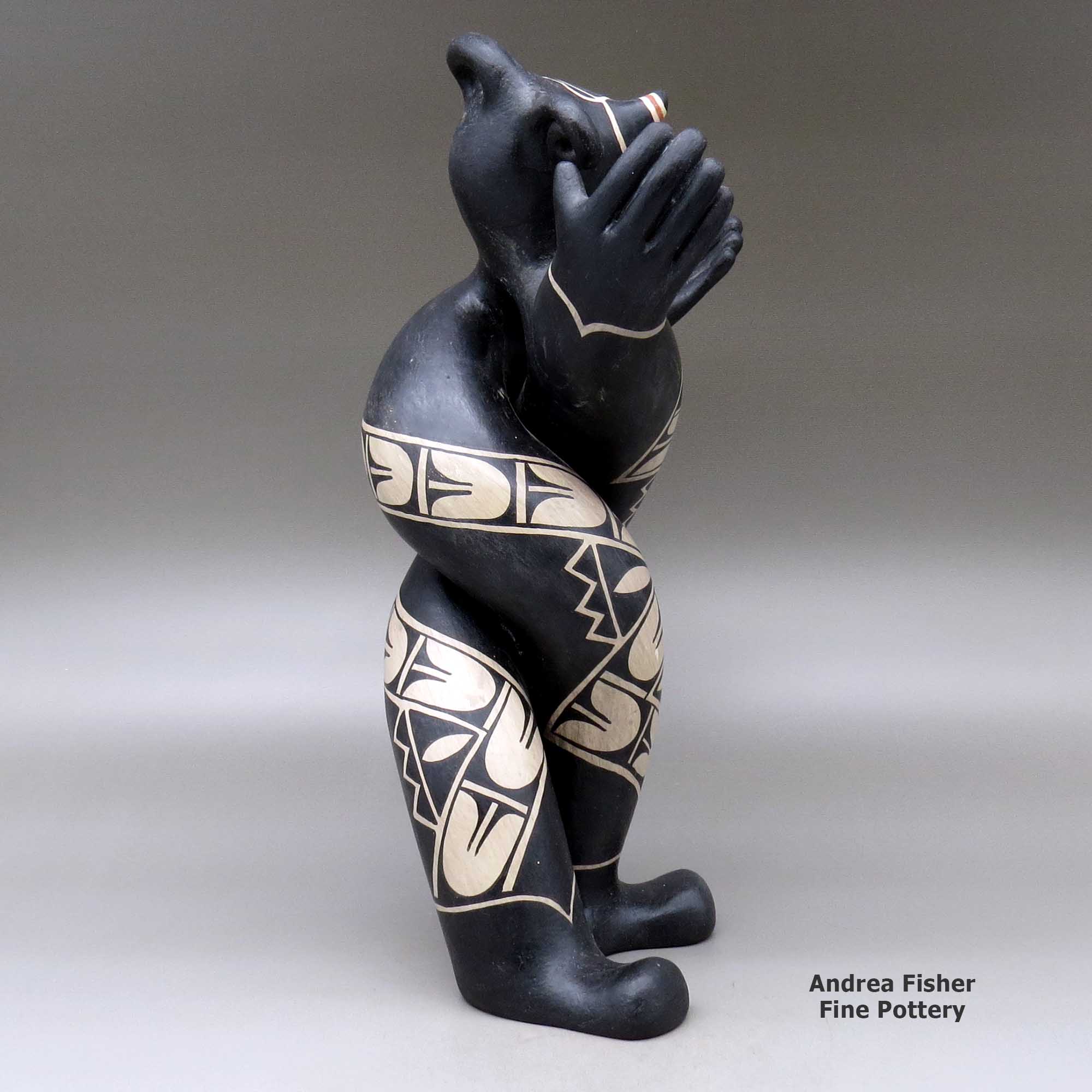 In prehistoric times, human effigy pots, animals, duck canteens and bird shaped pitchers with beaks as spouts were common productions of the Cochiti potters. Many of these were condemned as idols and destroyed by the Franciscan priests. That problem stopped when the Spanish left in 1820 but the fantastic array of figurines created by Cochiti potters was essentially dormant until the railroad arrived. Then Cochiti potters were among the first to enter the tourist market and they produced many whimsical figures into the early 1900s. Then production followed the market into more conventional shapes.
